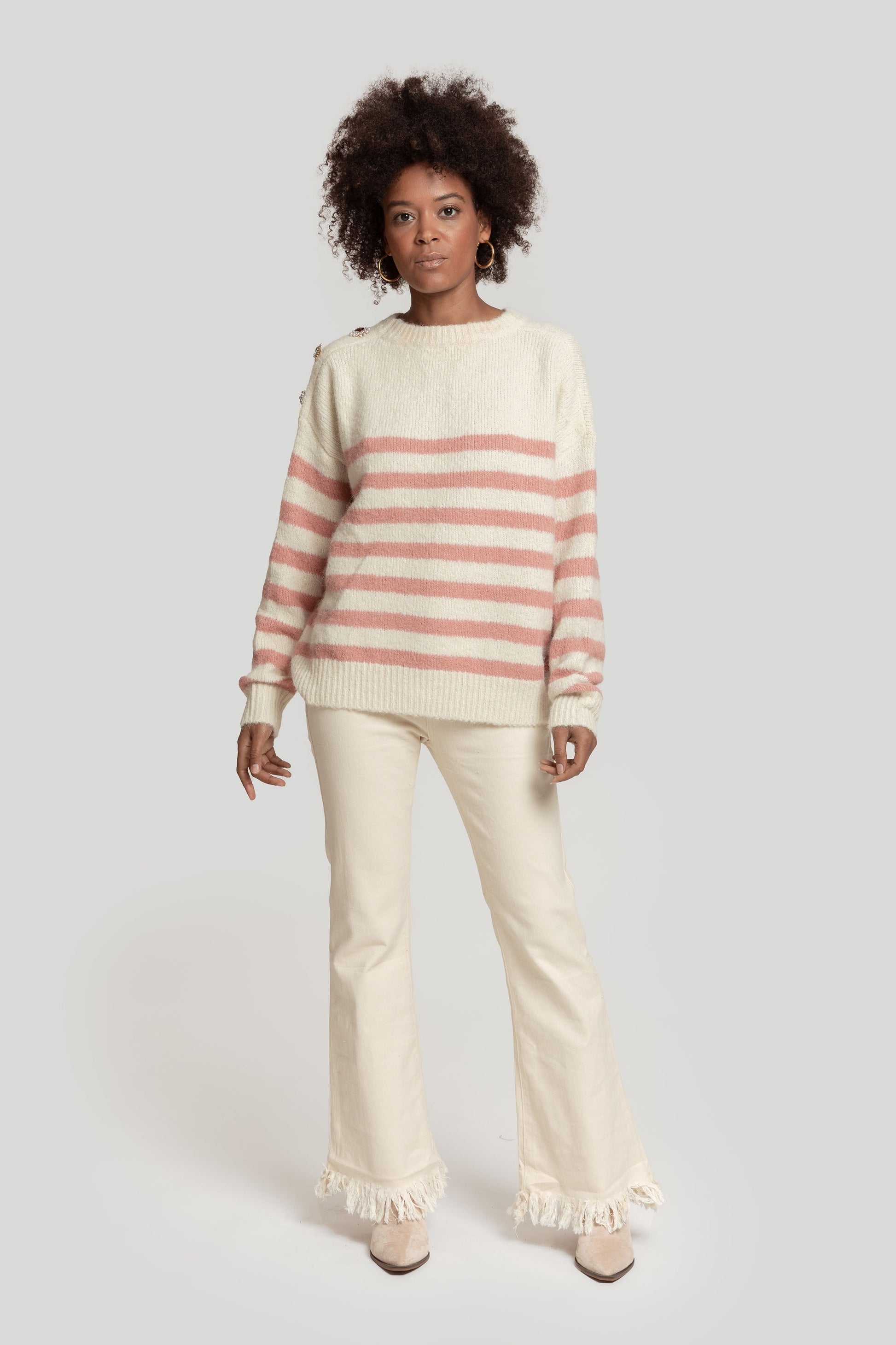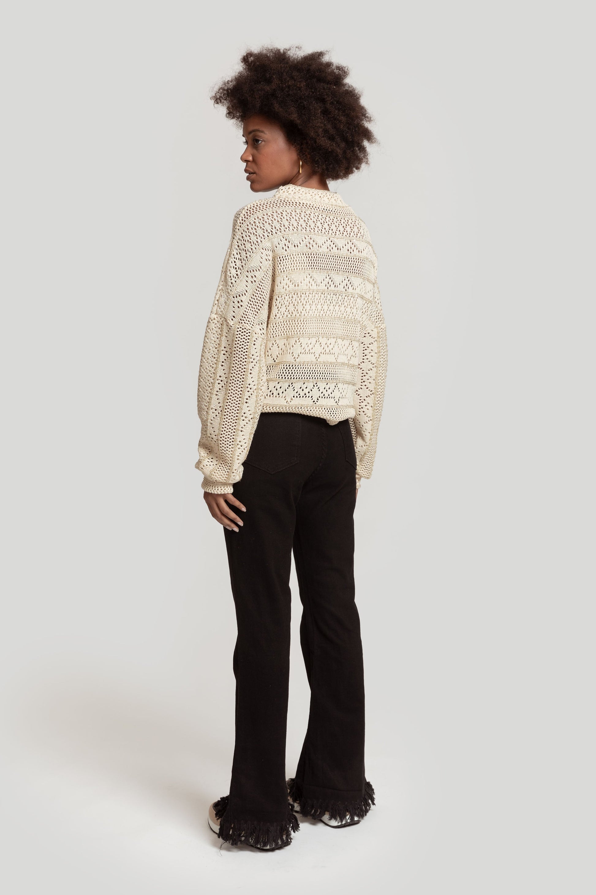 Tejido mezcla de algodón. Tiro alto. Diseño hasta el tobillo. Diseño flare. Cinco bolsillos. Cierre de cremallera y botón. Trabillas. Bajo deshilachado. Talla modelo: 34. Altura modelo 1,67 m.