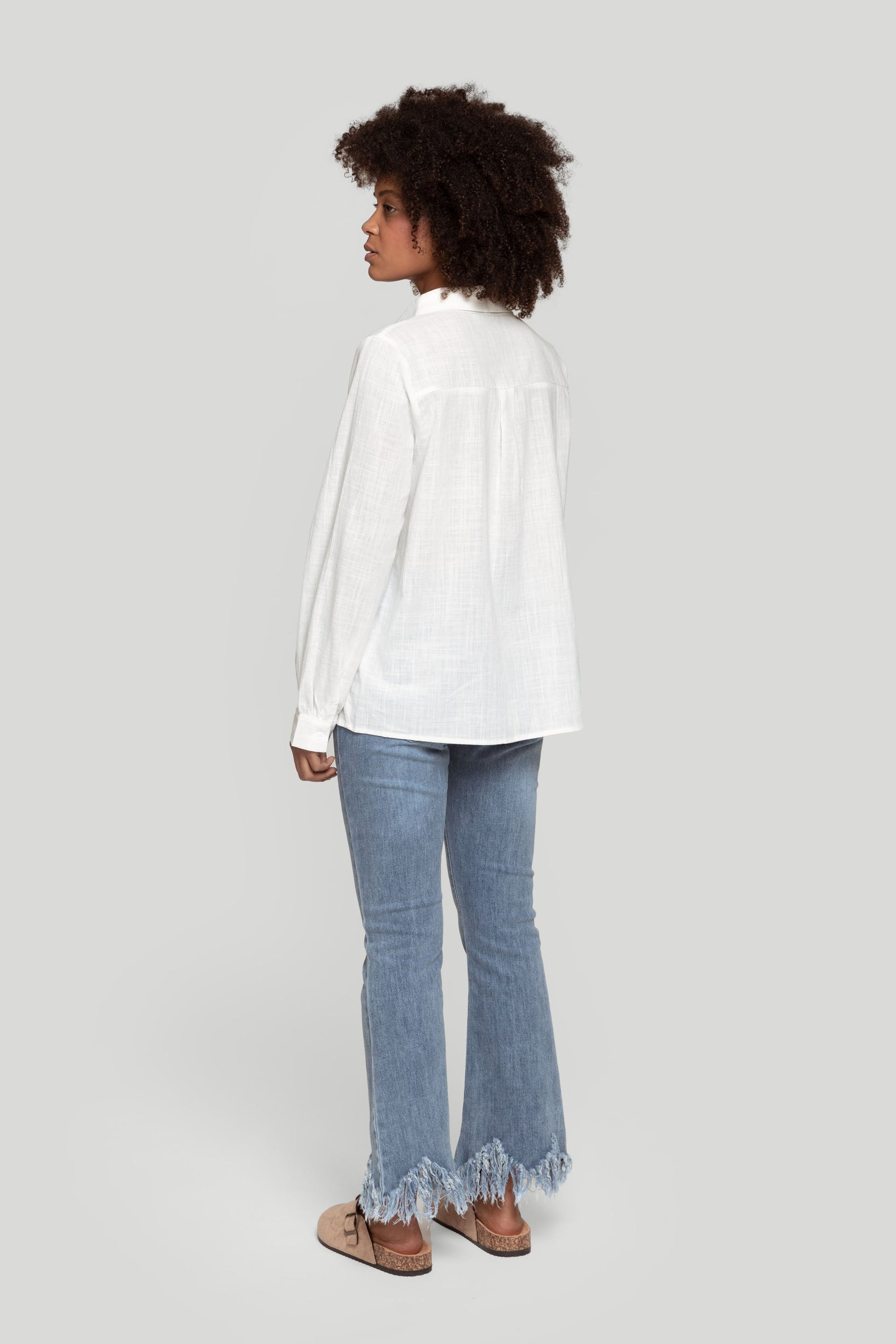 Tejido mezcla de algodón. Estilo tejano vaquero. Diseño recto. Tiro alto. Cinco bolsillos. Cierre de cremallera y botón. Trabillas. Bajo flecos. Bajo sin rematar. Talla modelo: 36. Altura modelo 1,66 m.