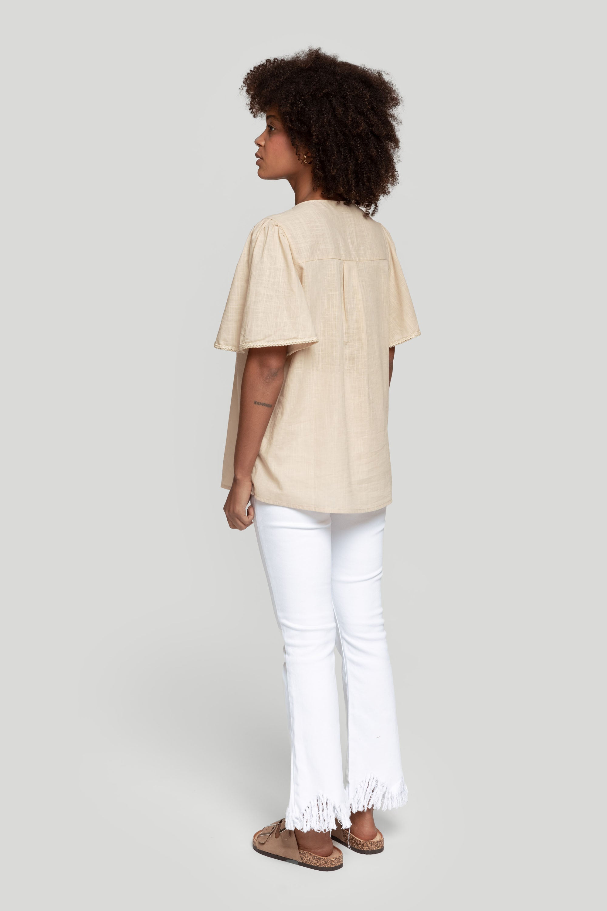Tejido mezcla de algodón. Estilo tejano vaquero. Diseño Culotte. Diseño recto. Tiro alto. Cinco bolsillos. Cierre de cremallera y botón. Trabillas. Bajo flecos. Bajo sin rematar. Talla modelo: 36. Altura modelo 1,66 m.