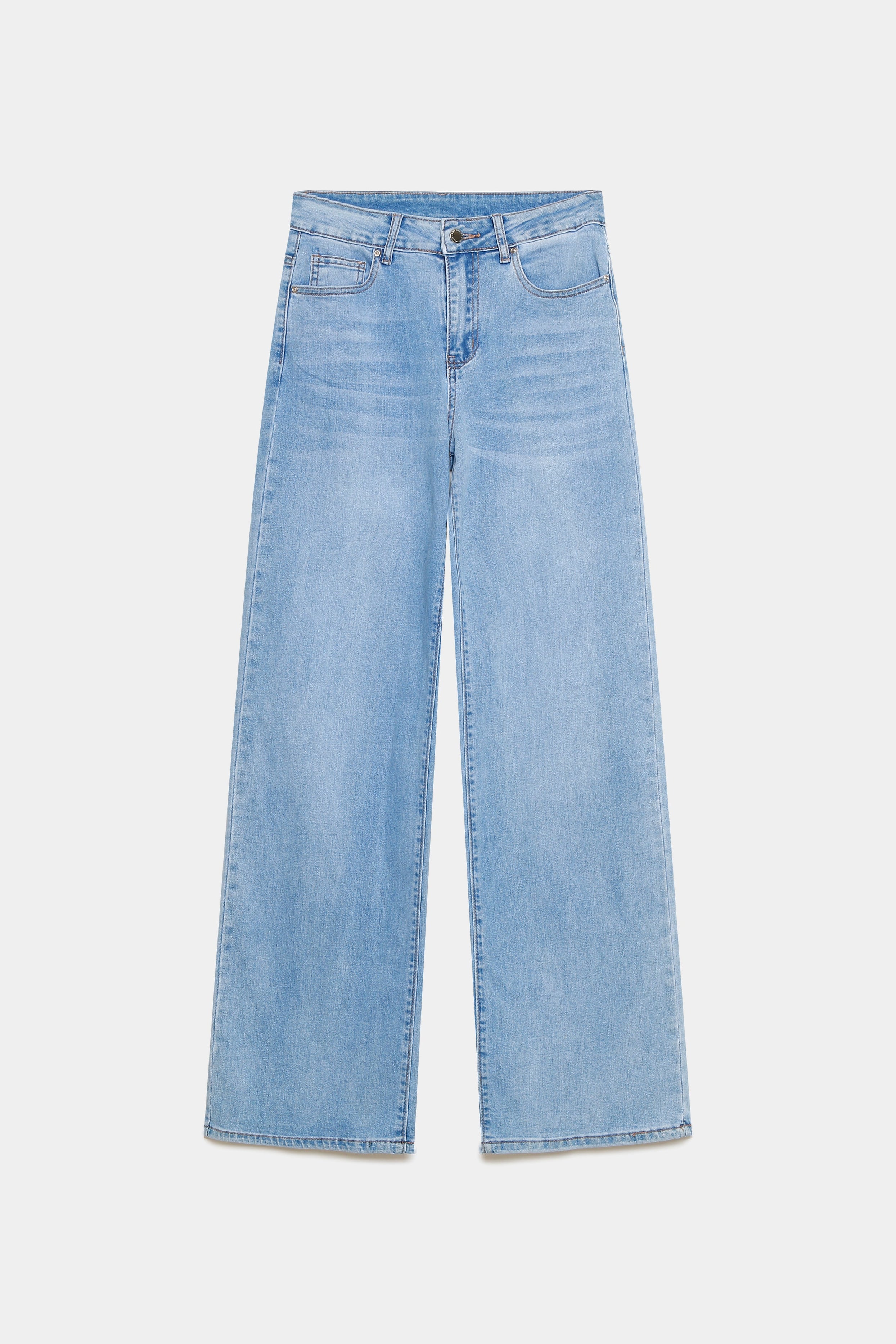 Tejido mezcla de algodón. Estilo tejano vaquero. Efecto lavado. Diseño recto. Tiro alto. Cinco bolsillos. Cierre de cremallera y botón. Trabillas.