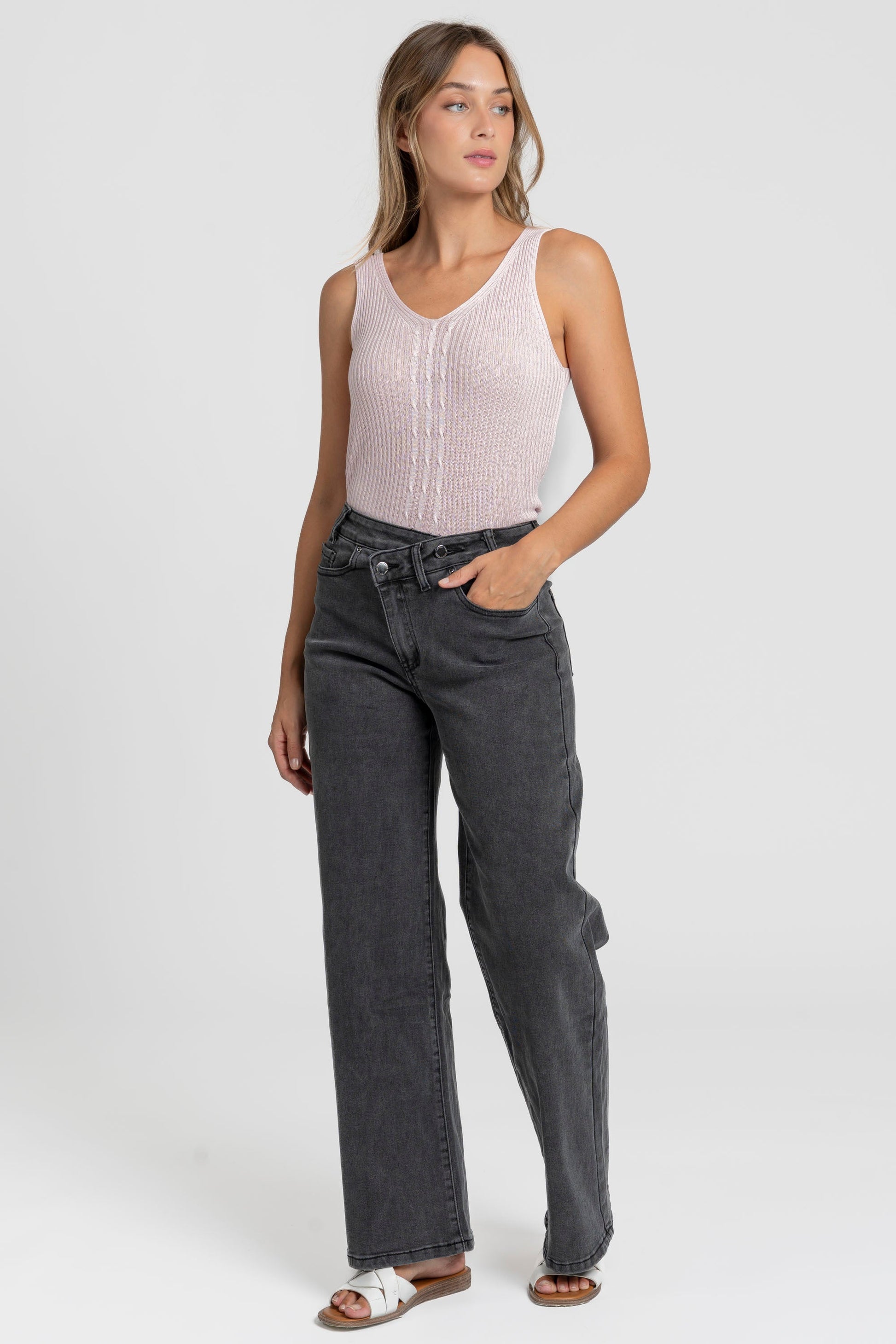 Tejido mezcla de algodón. Tejido tejano vaquero. Diseño recto. Diseño largo. Tiro alto. Cinco bolsillos. Cierre de cremallera y botón. Trabillas. Detalle botones asimétricos.