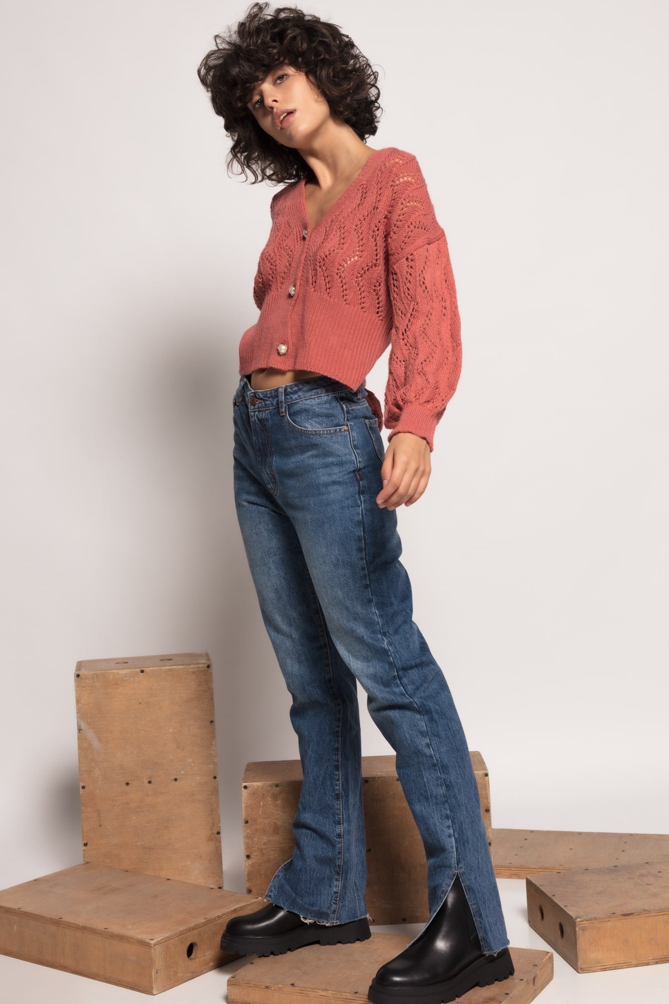 Jeans de tiro alto con cinco bolsillos. Efecto lavado. Bajo acabado sin costuras y aberturas laterales. Cierre frontal con cremallera y botón metálico. Talla modelo: 38. Altura modelo: 1,75 m.
