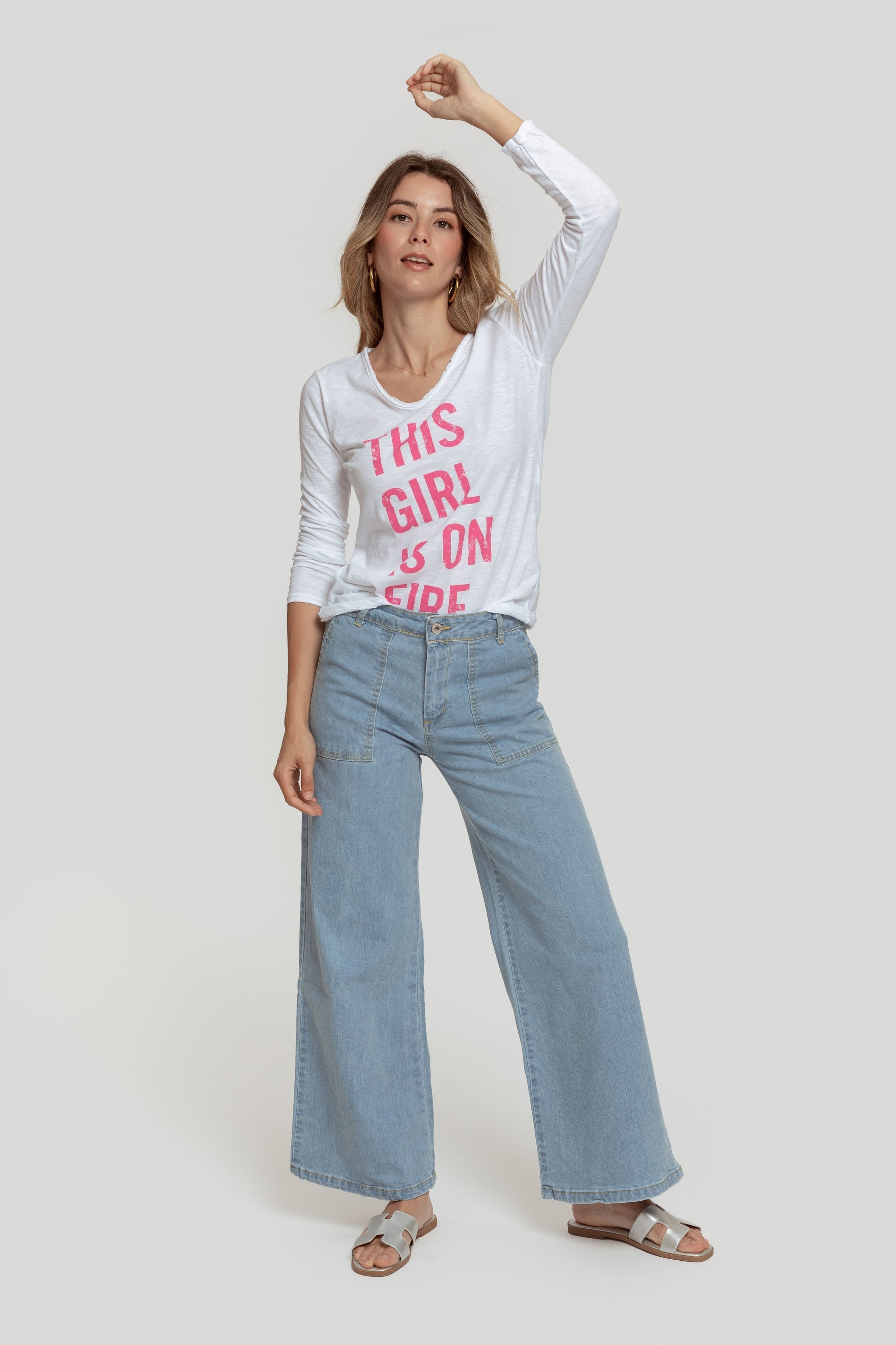 Tejido mezcla de algodón. Estilo tejano vaquero. Diseño lavado. Diseño recto. Diseño culotte. Perneras amplia. Tiro alto. Dos bolsillos de solapa. Cierre de botón y cremallera. Talla modelo: S. Altura modelo: 1,70 m.