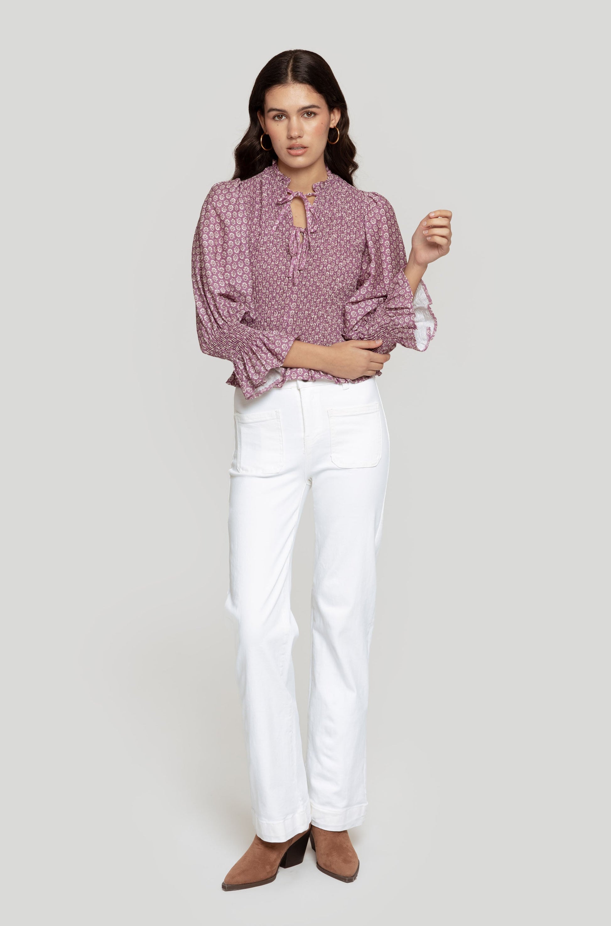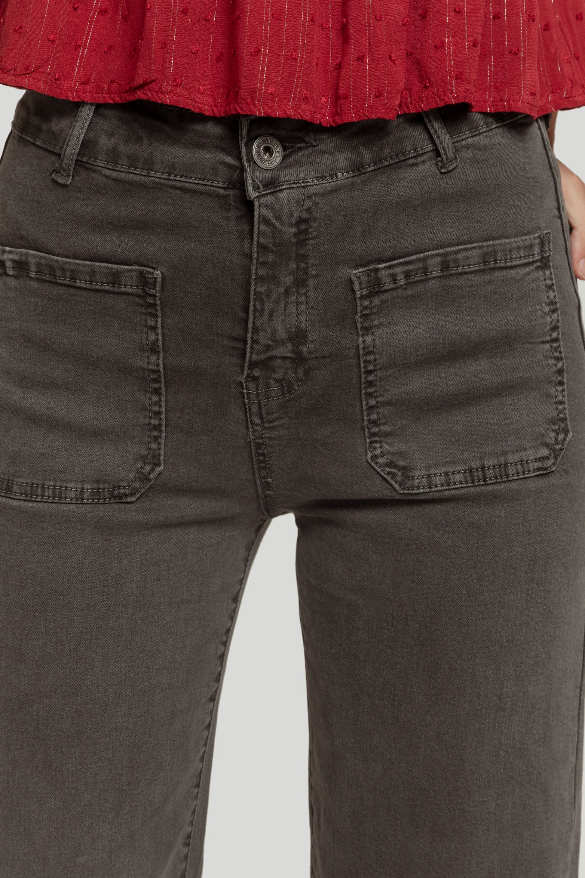 Tejido mezcla de algodón. Estilo tejano vaquero. Diseño recto. Diseño culotte. Largo regular. Tiro alto. Dos bolsillos de solapa. Cierre de botón y cremallera. Trabillas.
