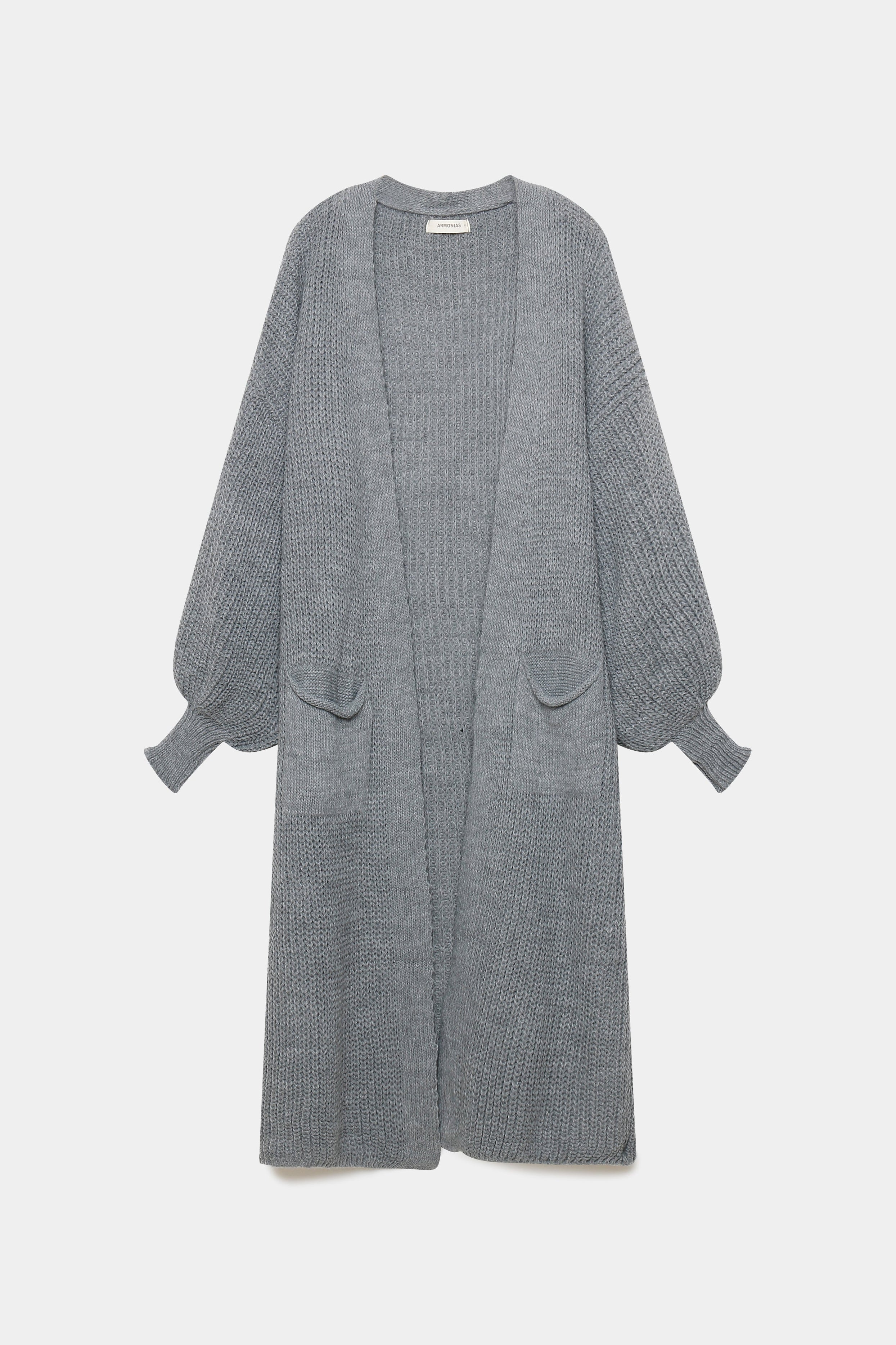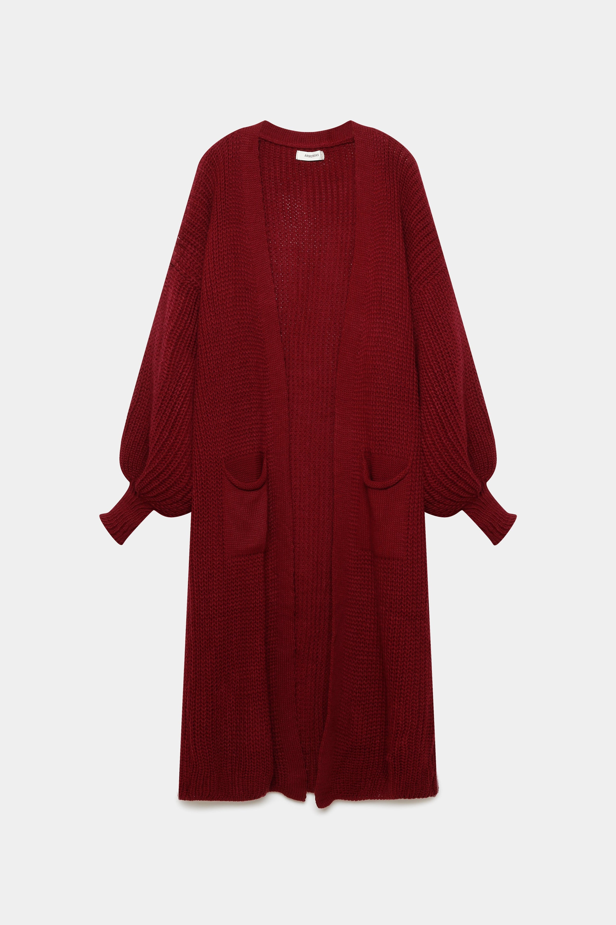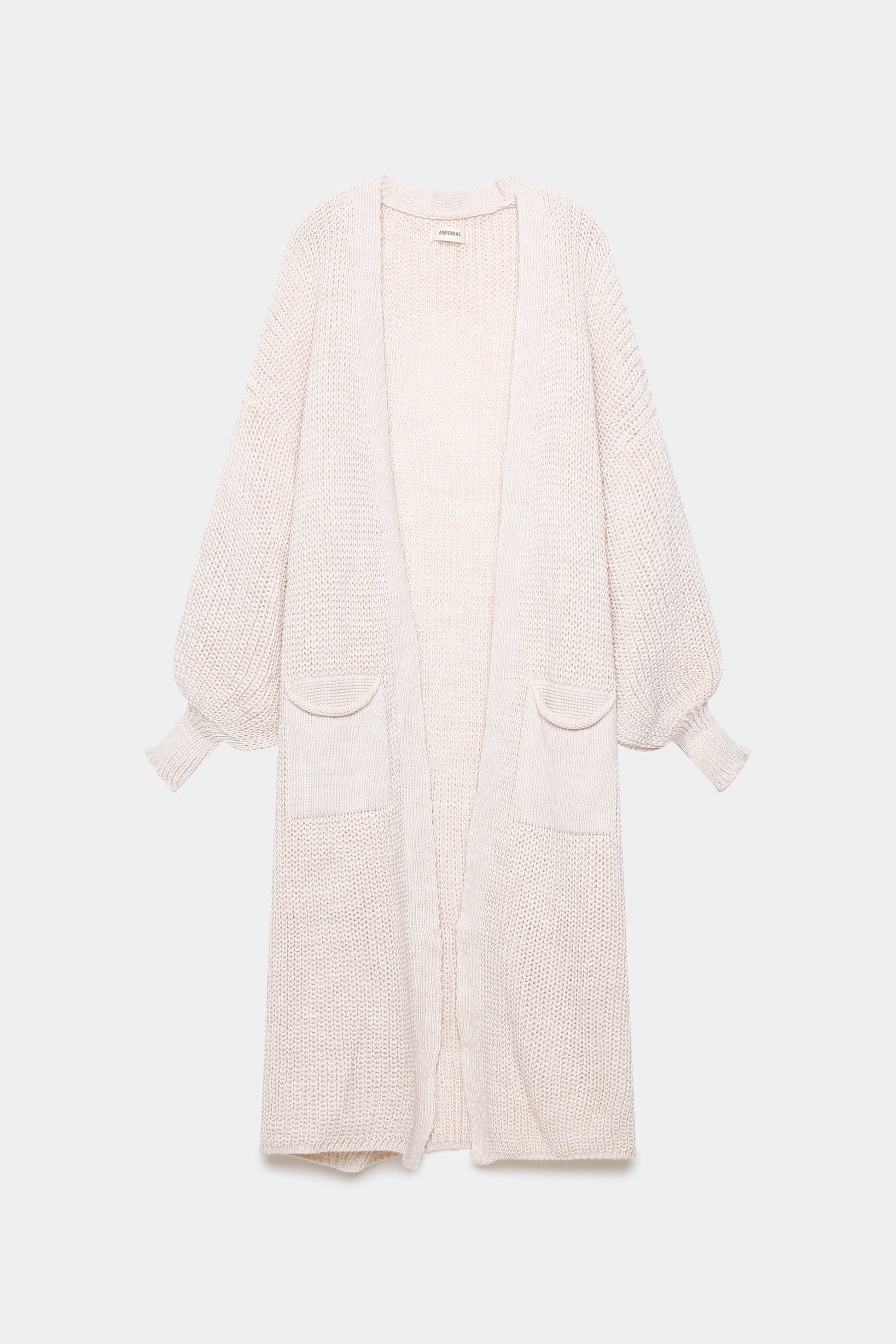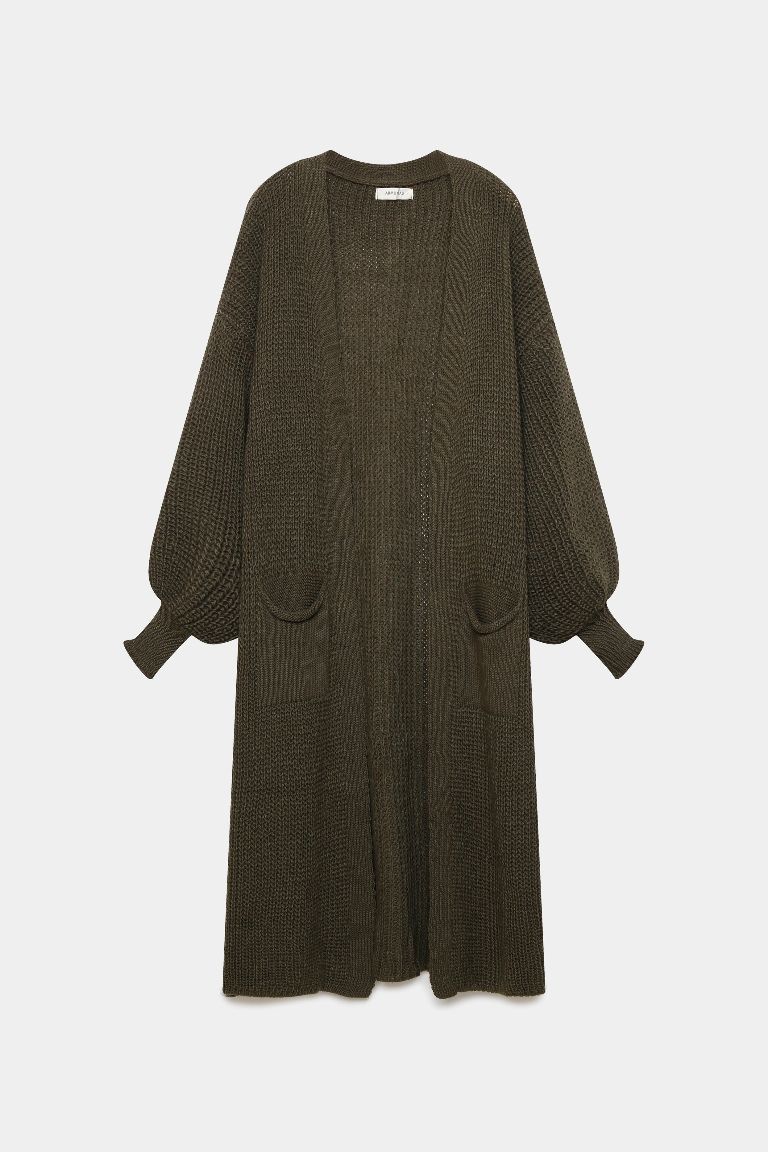Tejido de punto. Diseño recto. Diseño largo. Cuello pico. Manga larga. Dos bolsillos. Sin cierre.