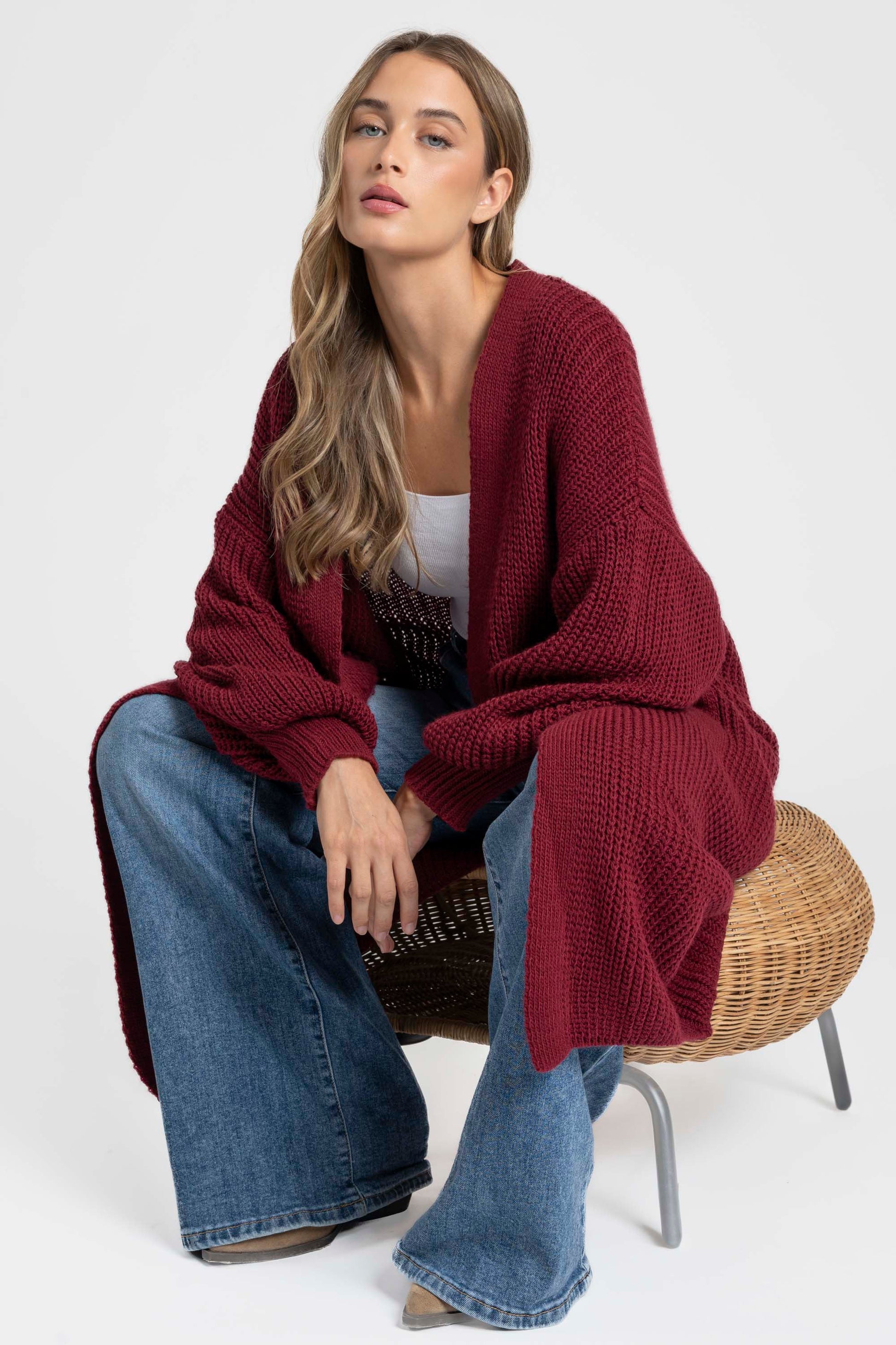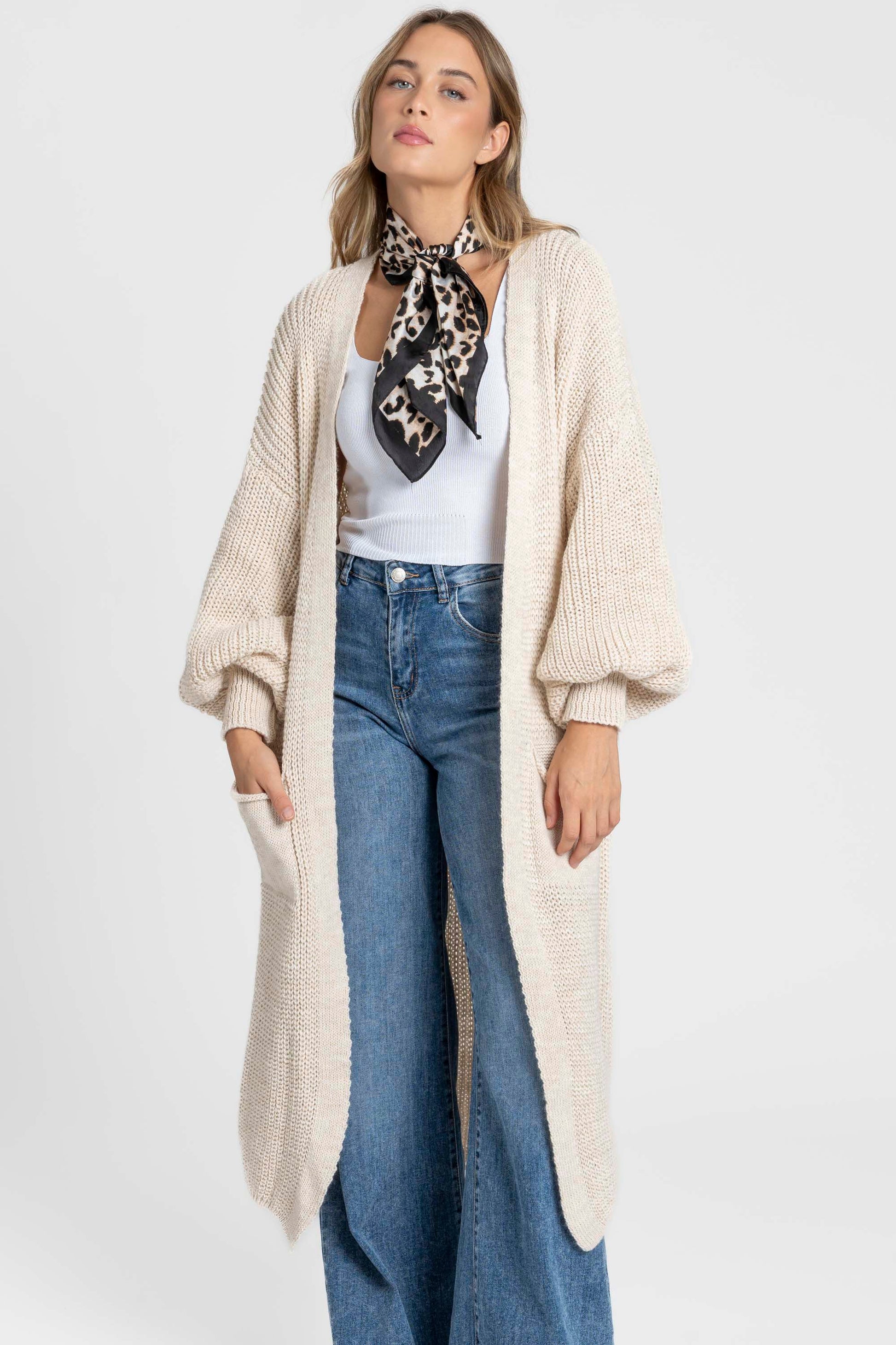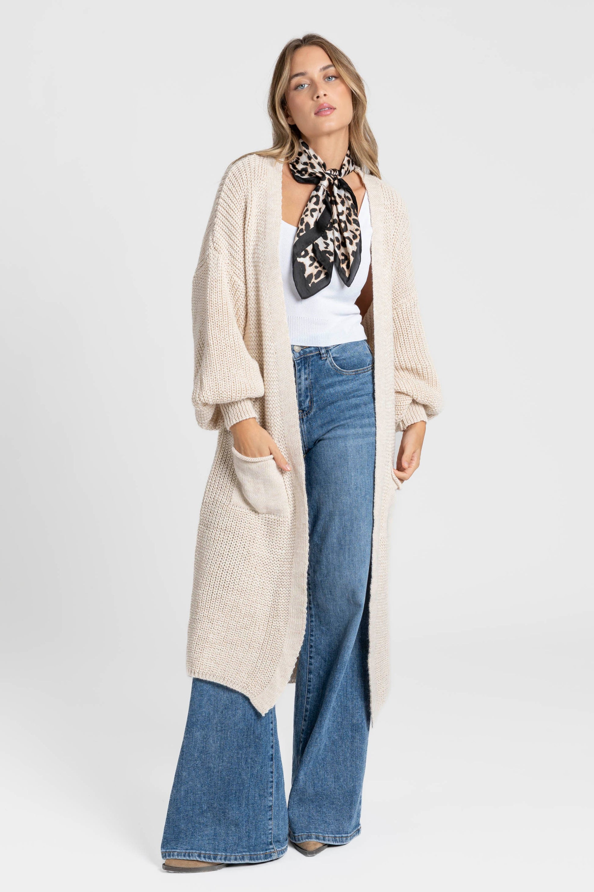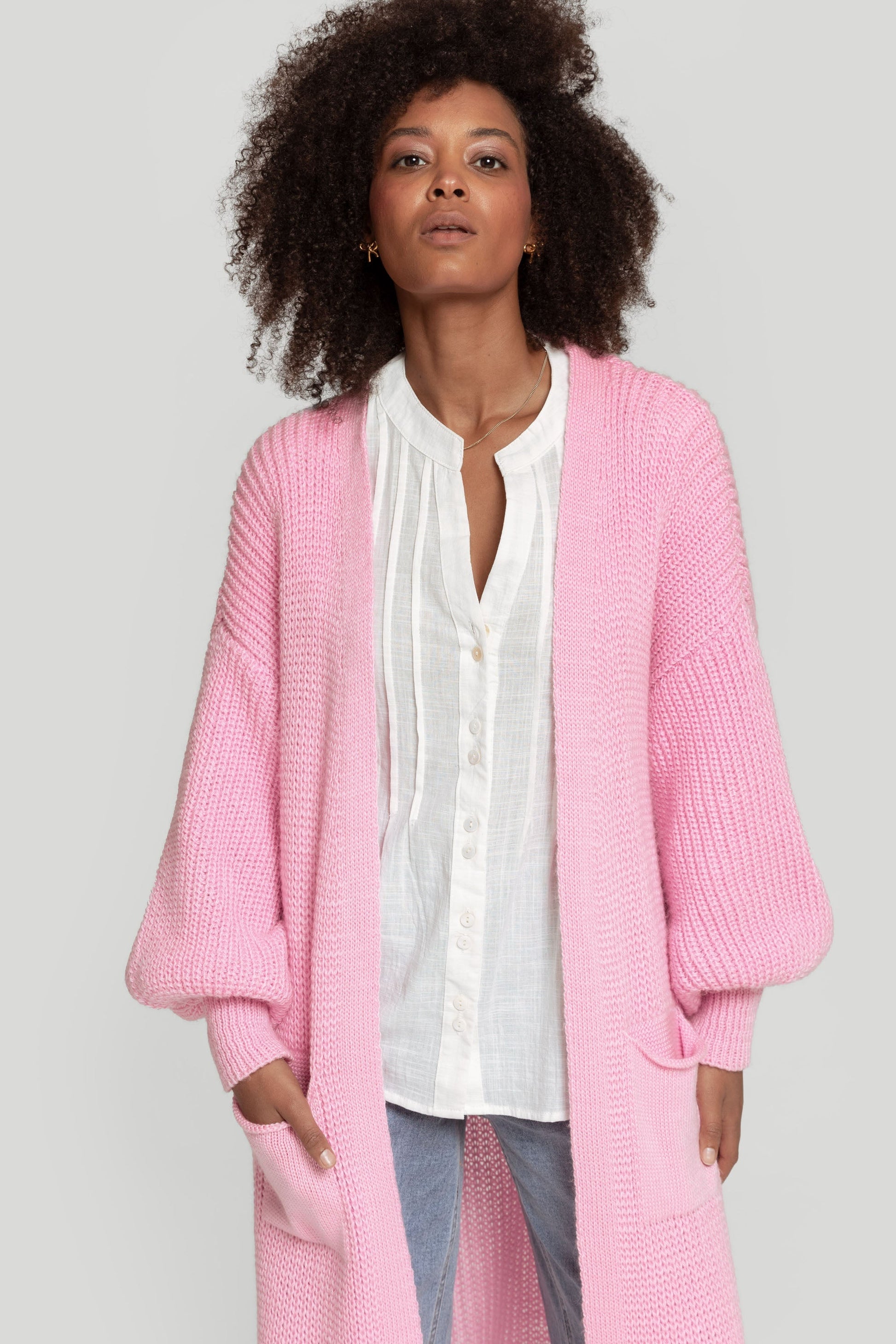 Tejido de punto. Diseño recto. Diseño largo. Cuello pico. Manga larga. Dos bolsillos. Sin cierre.