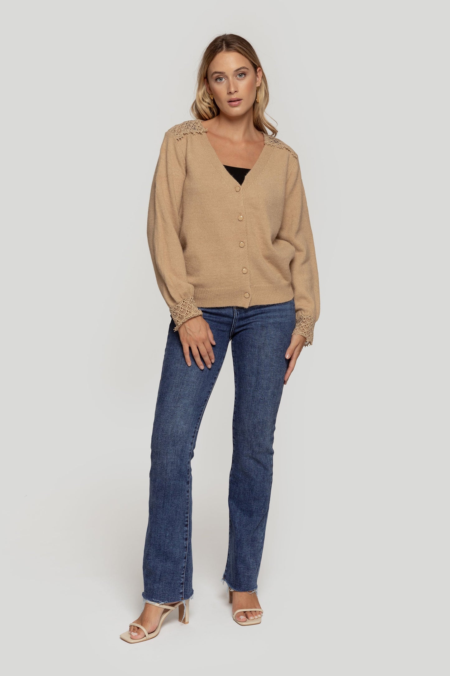 Tejido de punto fino. Diseño recto. Diseño fluido. Cuello pico. Manga larga. Cierre de botones. Detalles crochet. Talla única. Altura modelo 1,66 m.