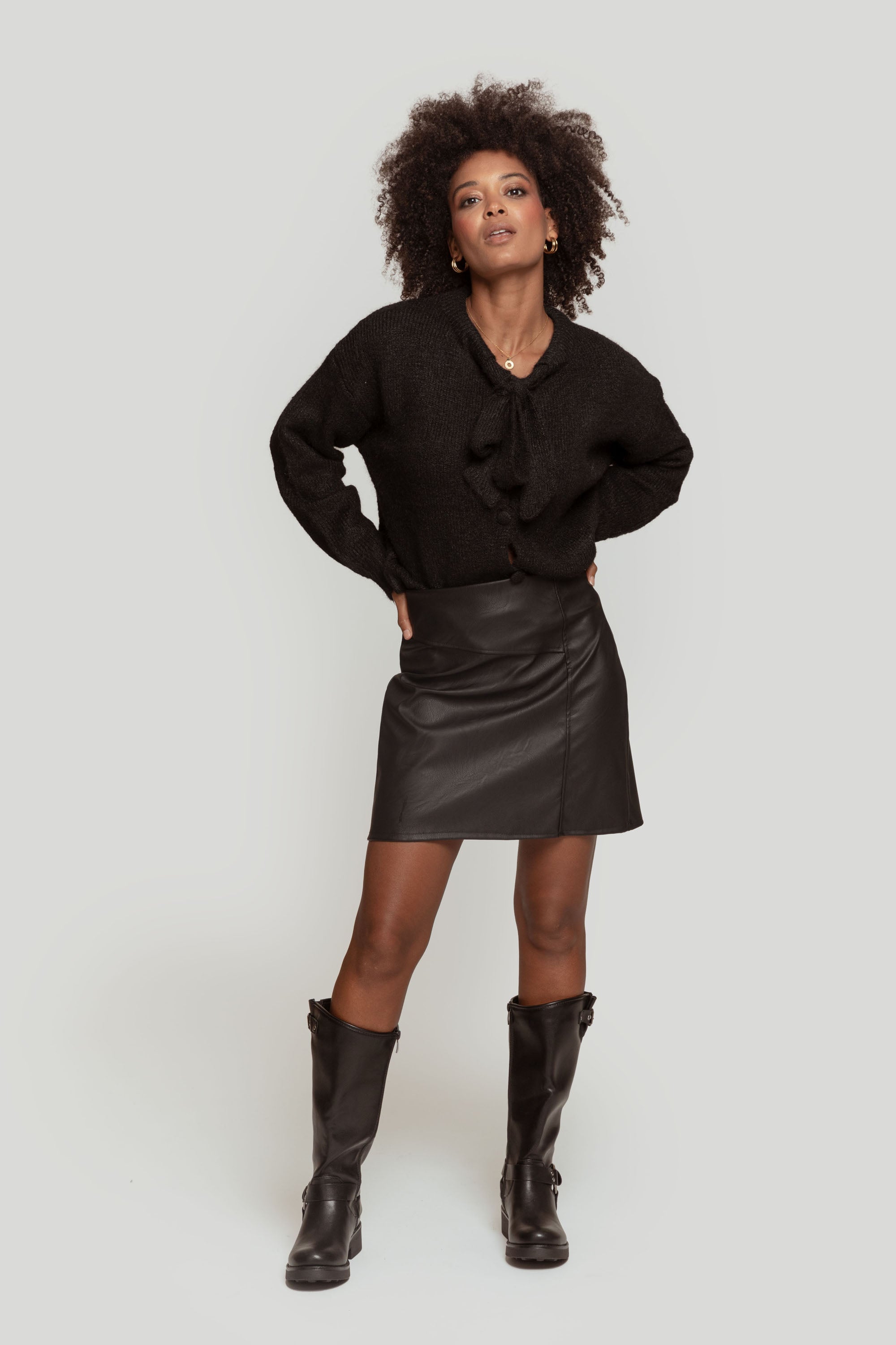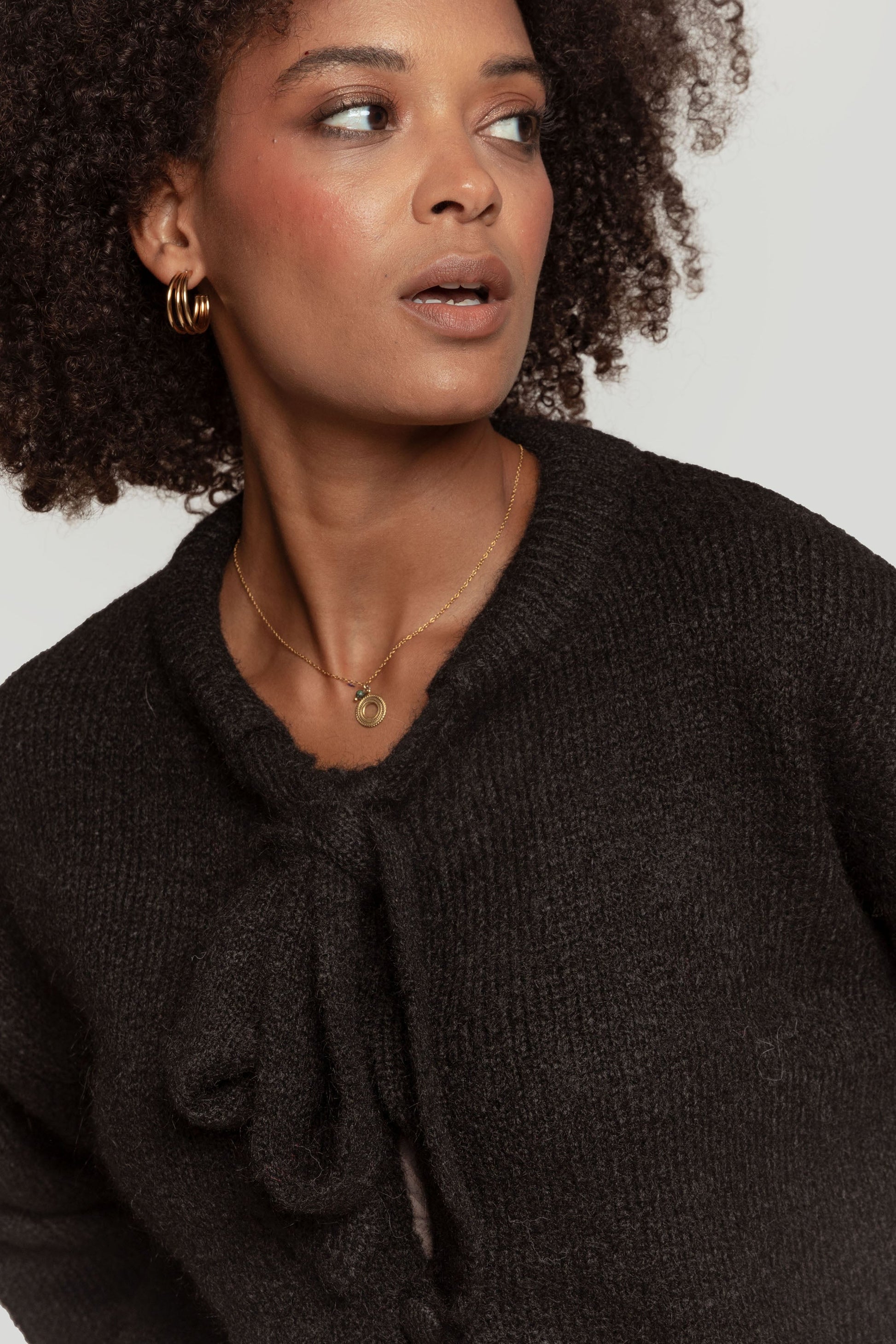 Tejido de punto. Diseño recto. Cuello redondo. Cuello lazada. Manga larga. Cierre de botones. Terminaciones en rib. Terminaciones pelitos. Talla única. Talla modelo: S. Altura modelo: 1.76 m.