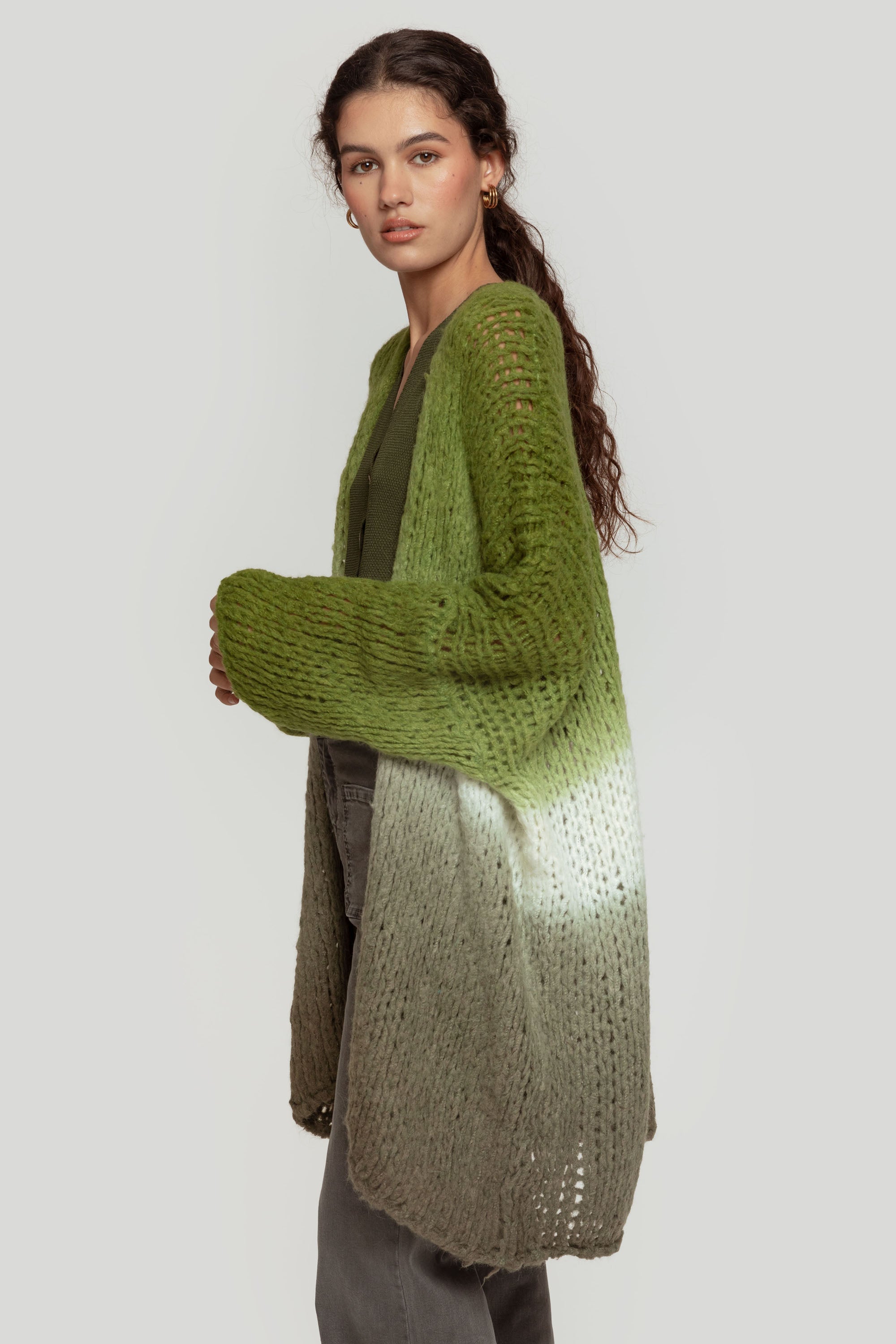 Tejido de punto. Punto trenzado. Diseño calado. Diseño estampado. Diseño overisze. Diseño largo. Cuello chimenea. Manga larga. Abierto. Acabado lana. Talla modelo: S. Altura modelo 1,75 m