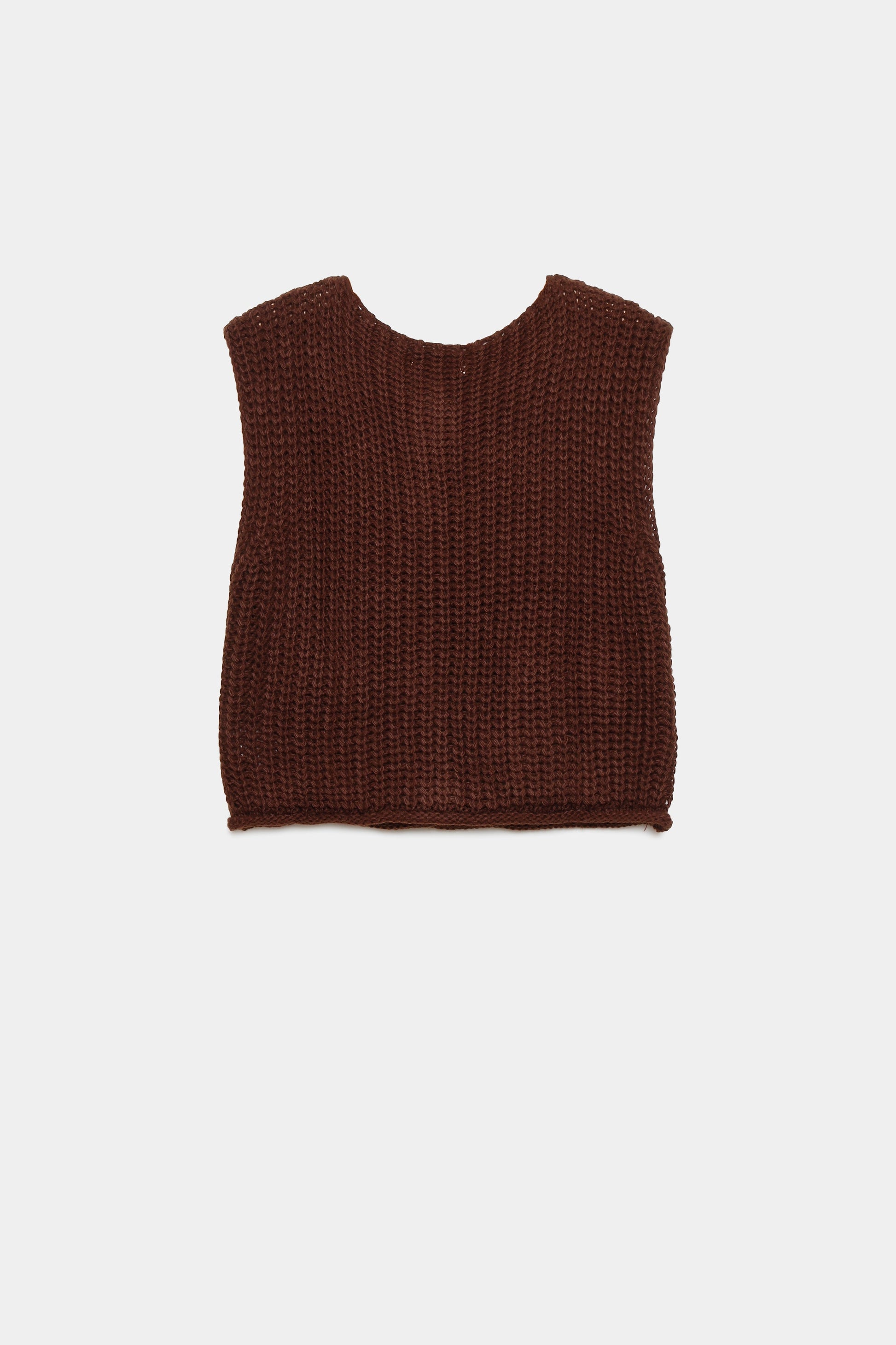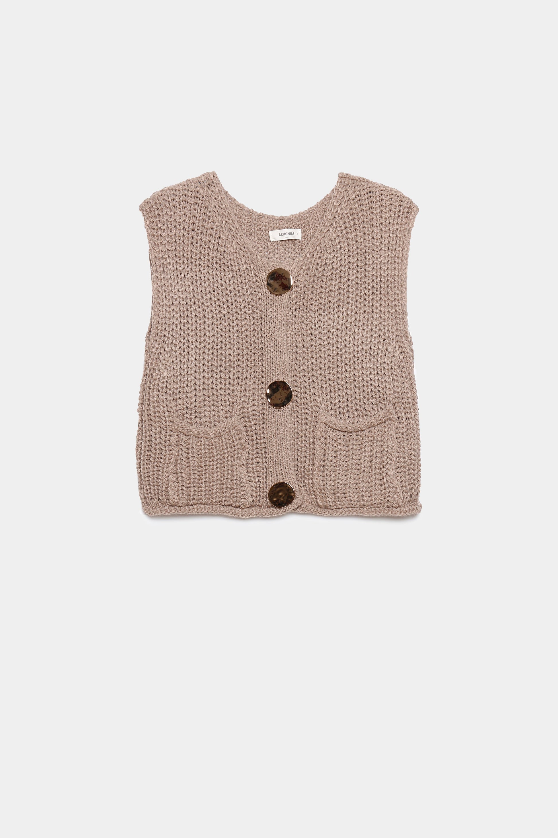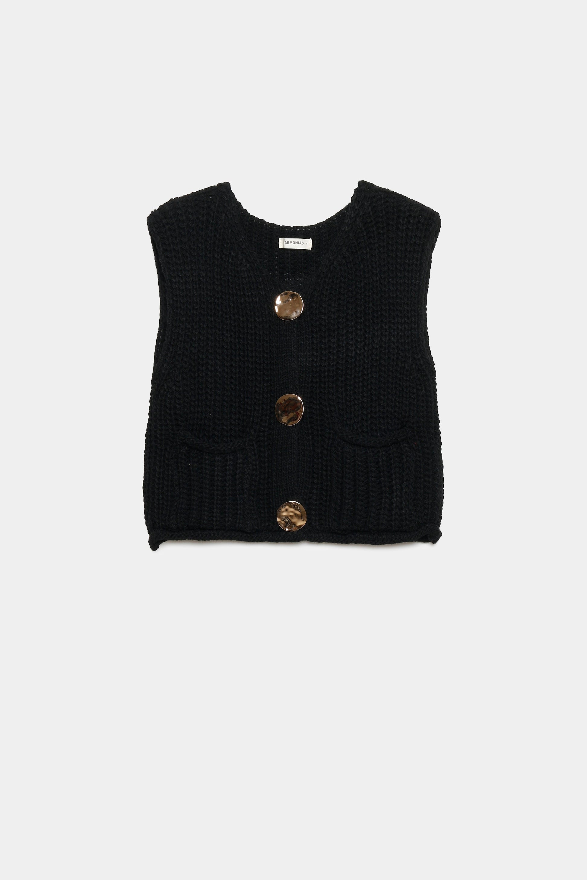Tejido punto. Cuello redondo. Manga sisa. Cierre de botones metálicos grandes. Bolsillos frontales.