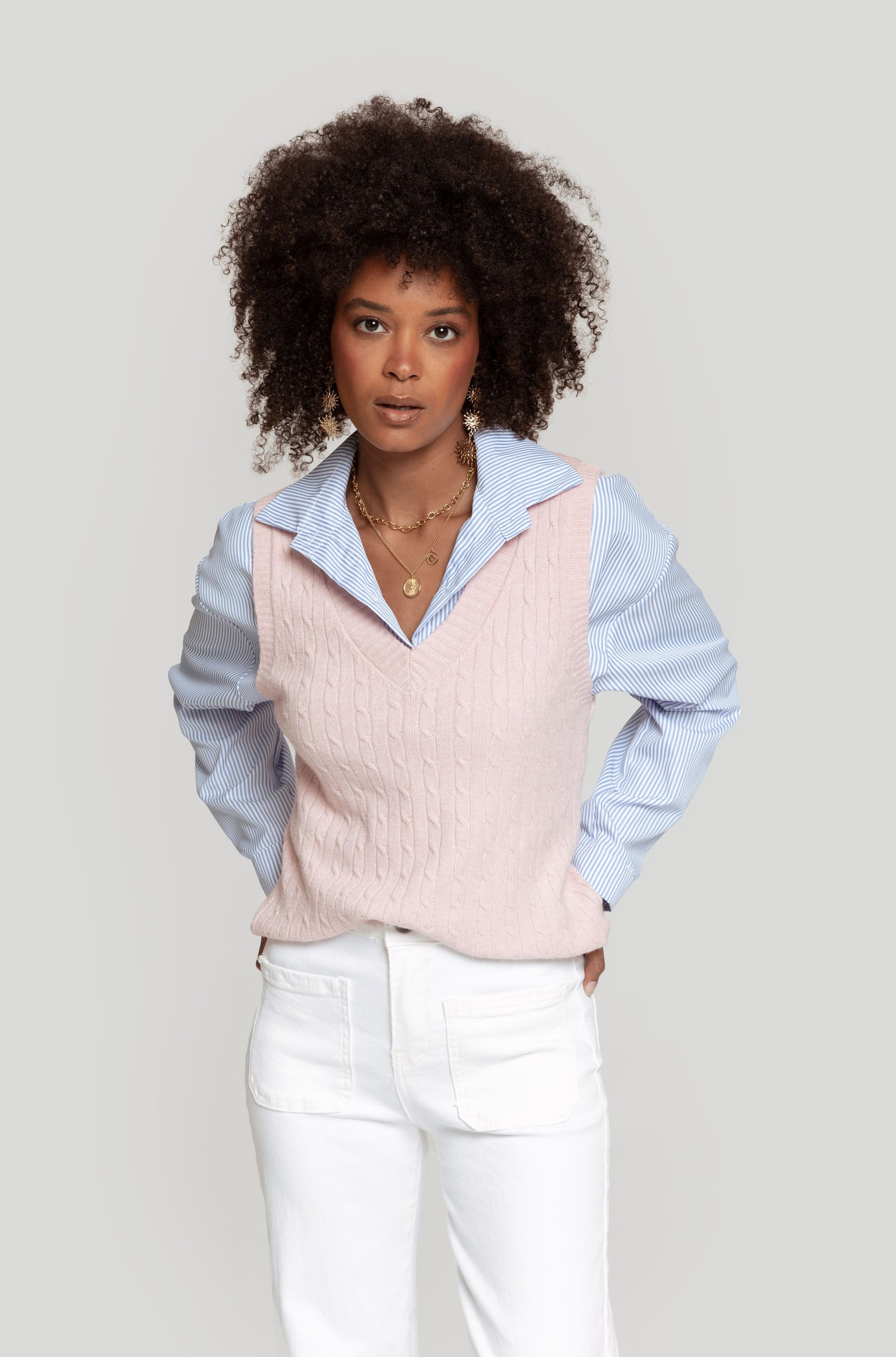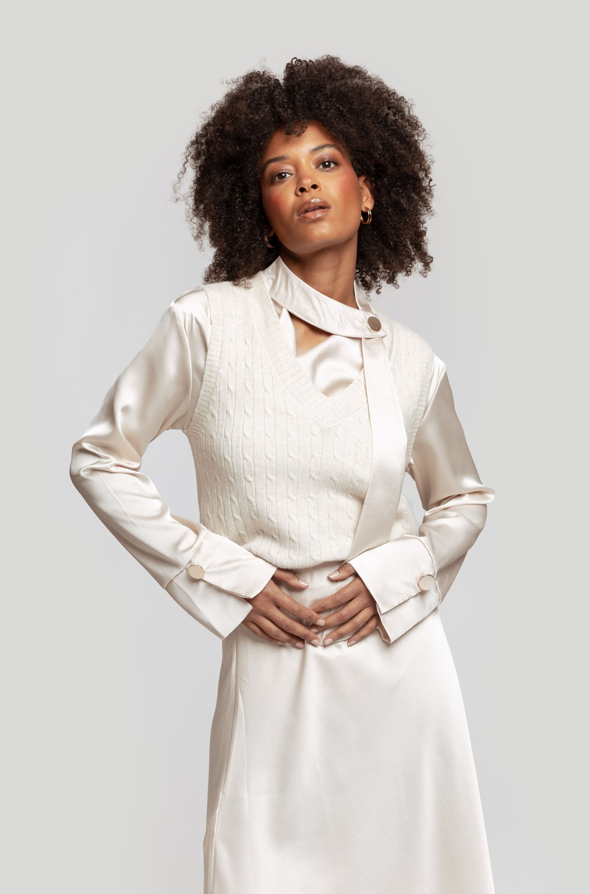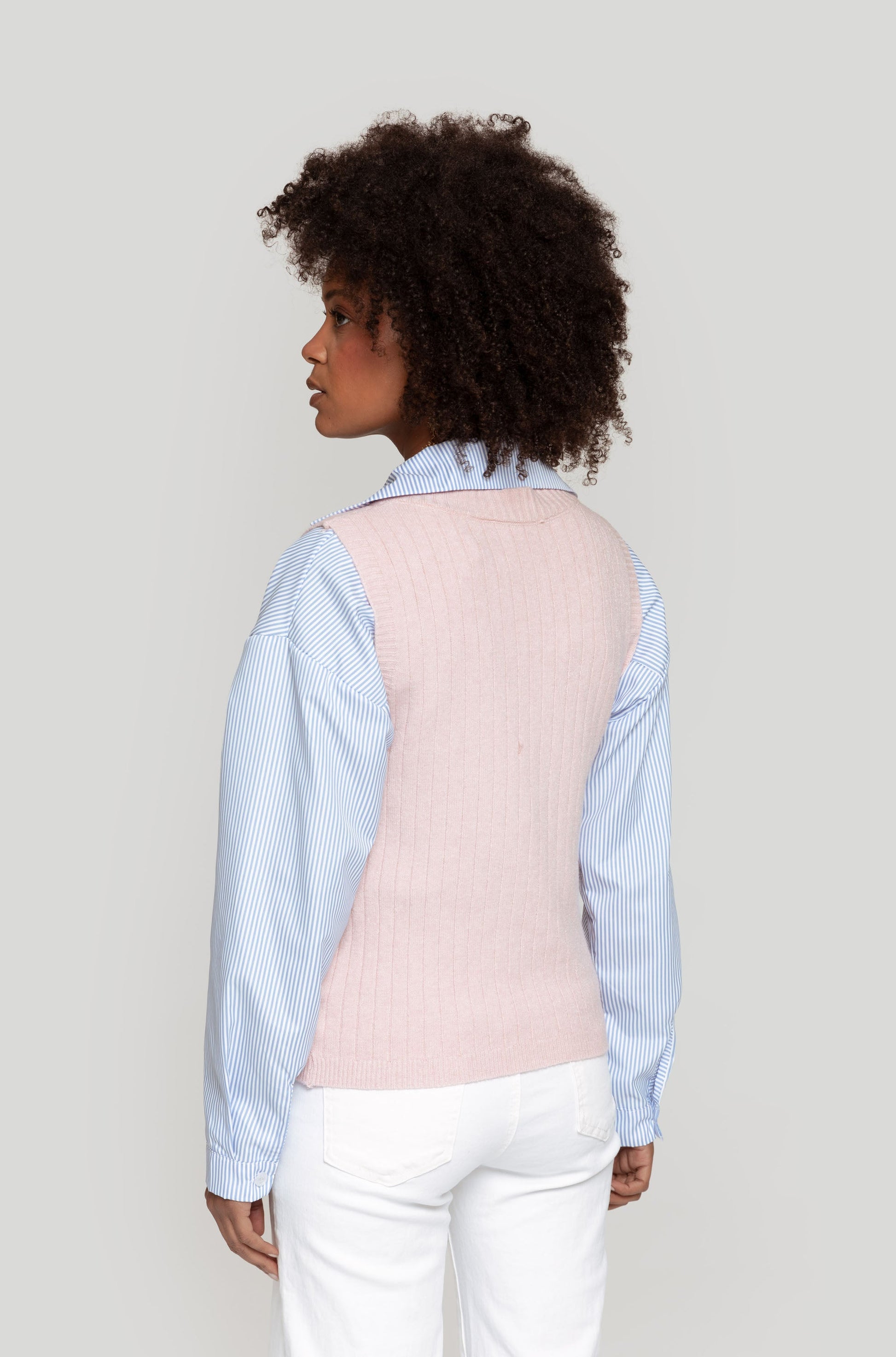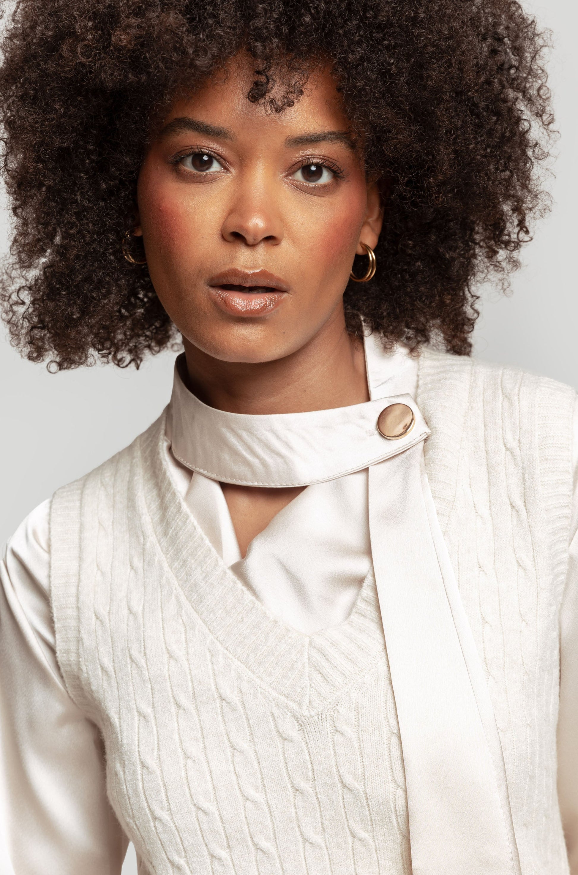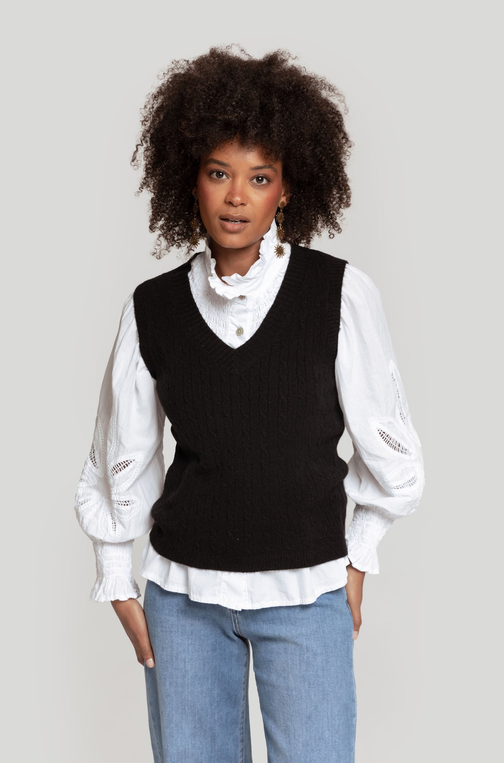Tejido de punto. Diseño trenzado. Diseño recto. Cuello redondo. Manga sisa. Talla modelo: S. Altura modelo 1,66 m.