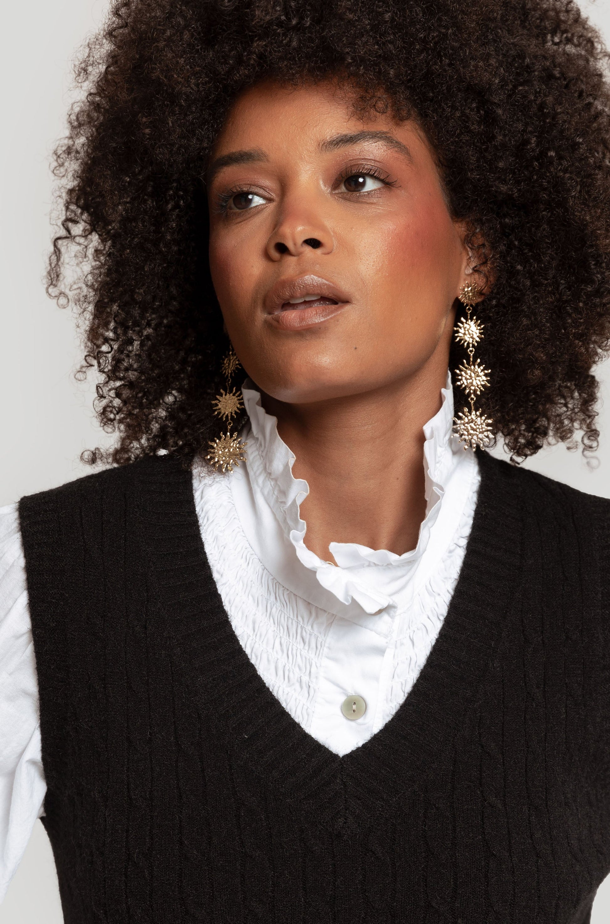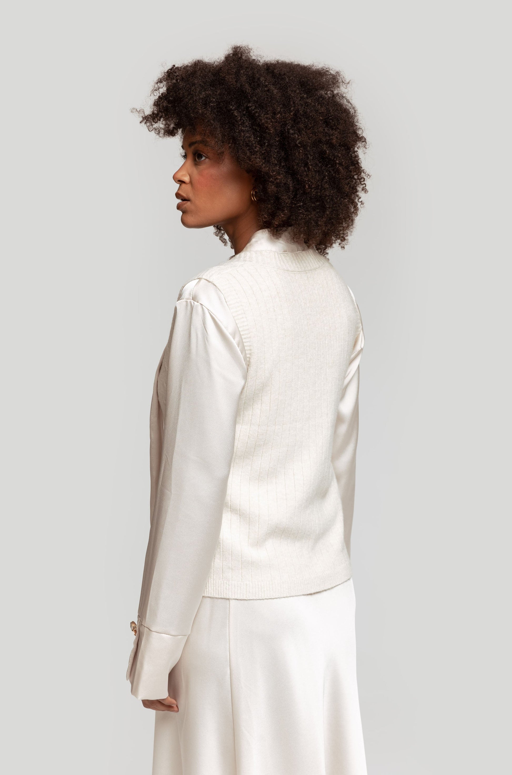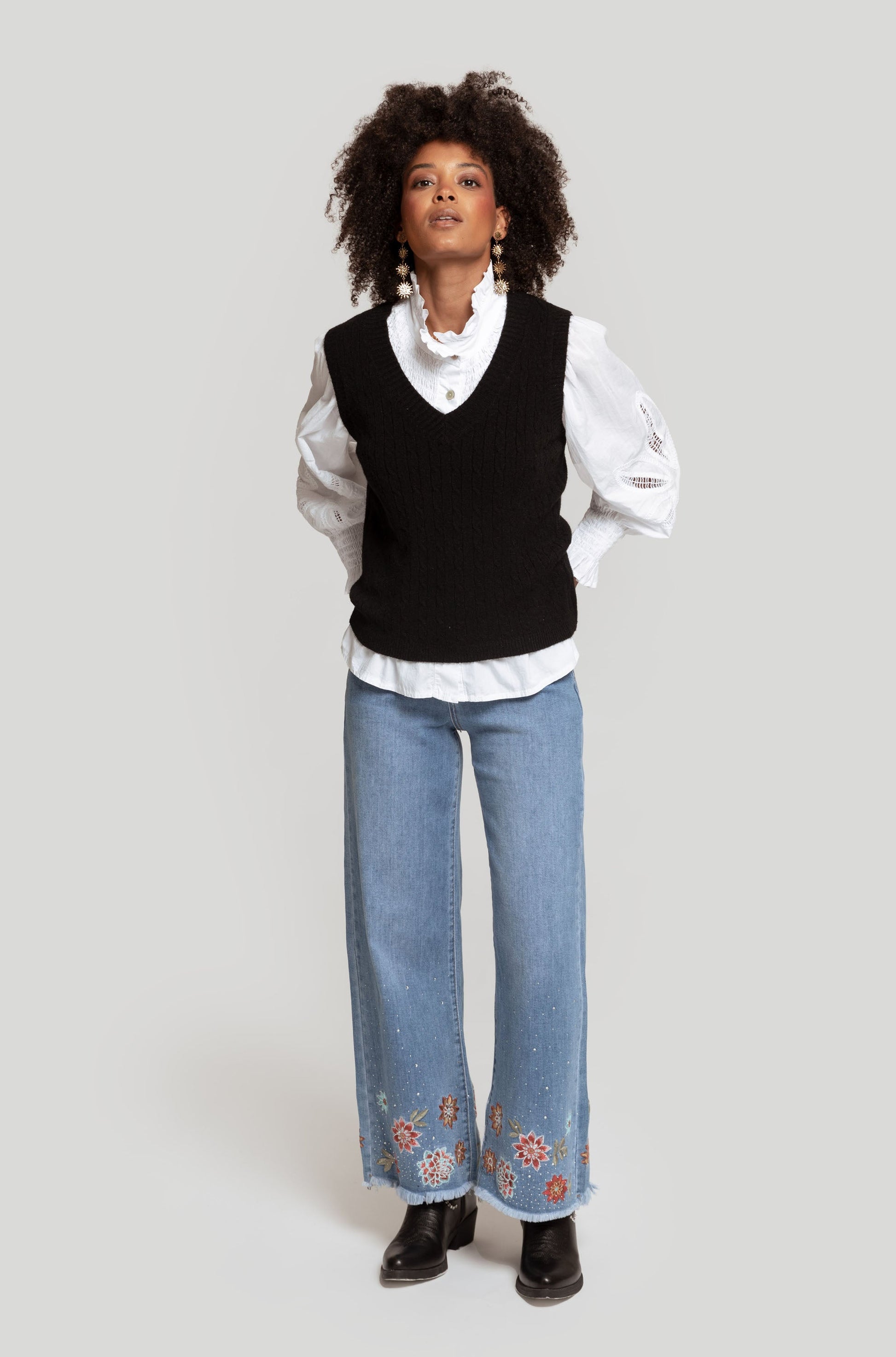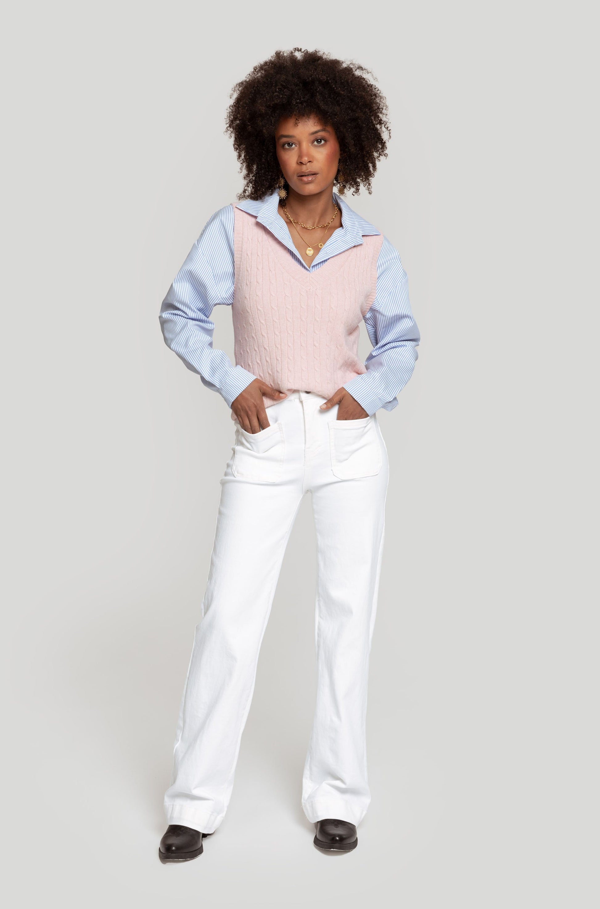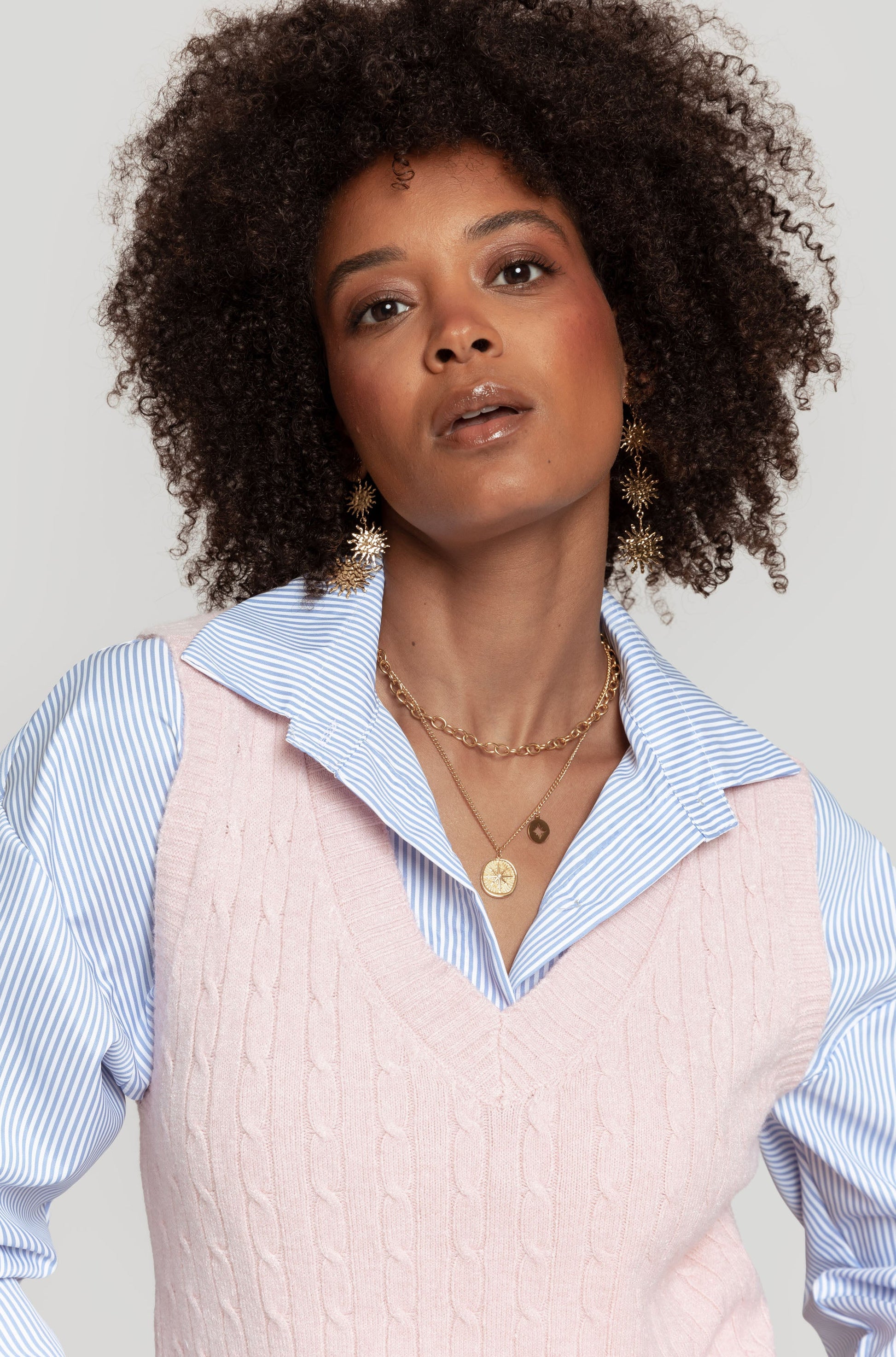 Tejido de punto. Diseño trenzado. Diseño recto. Cuello redondo. Manga sisa. Talla modelo: S. Altura modelo 1,66 m.