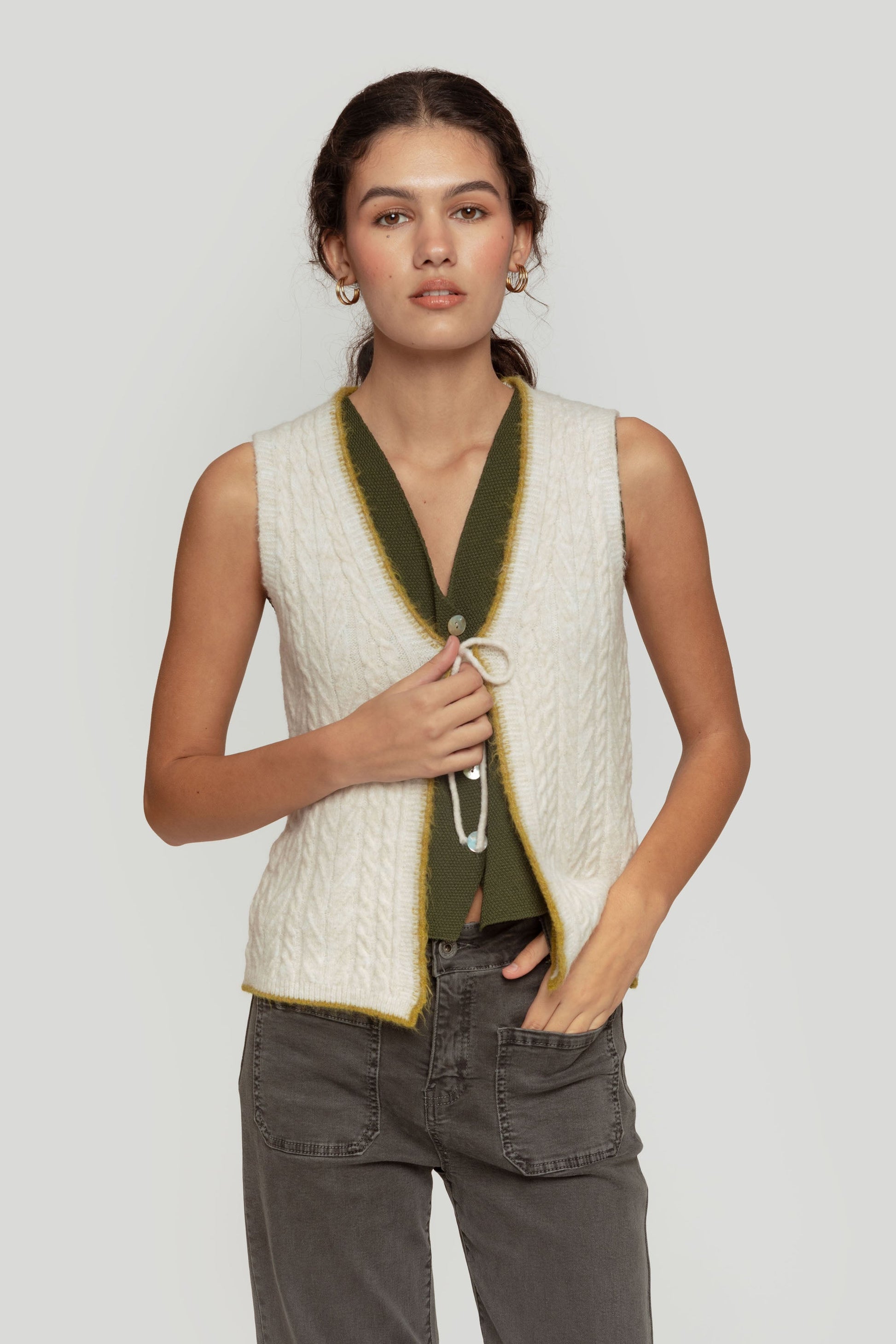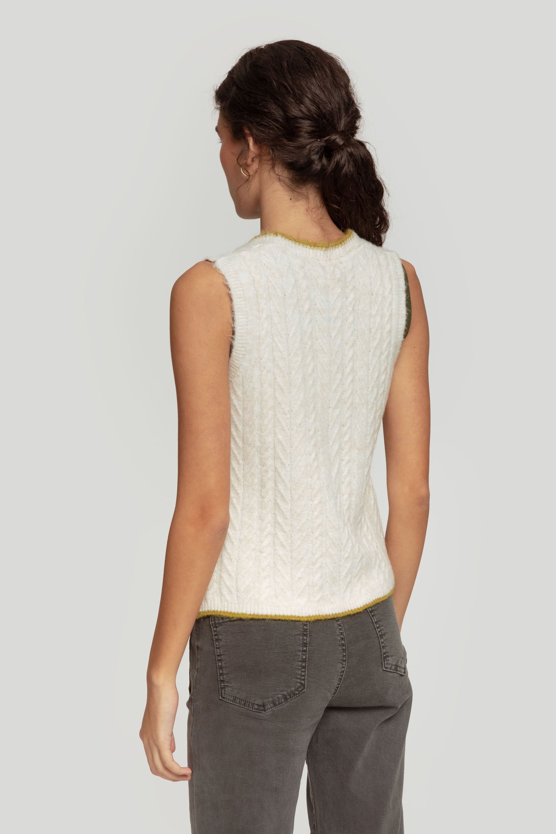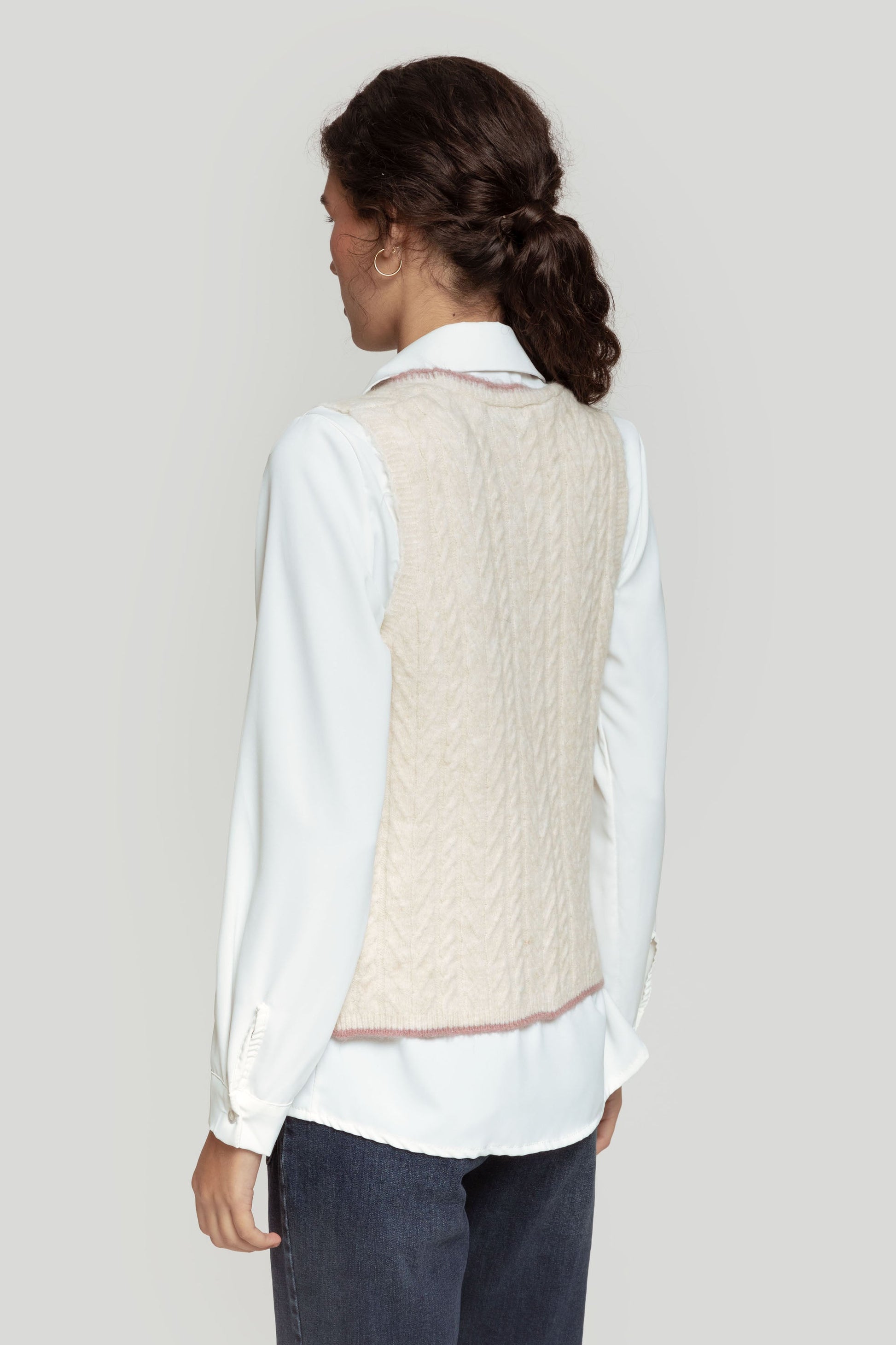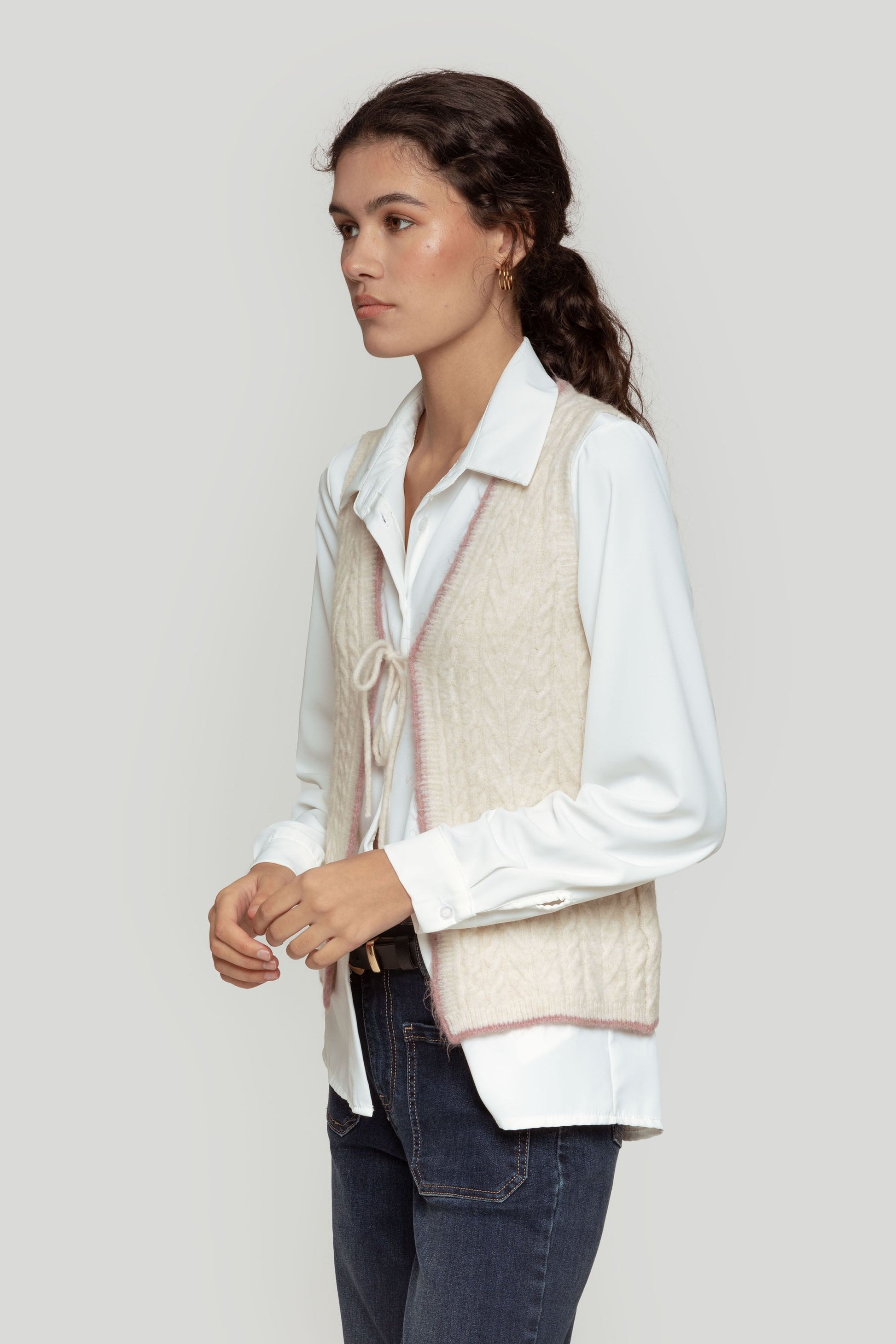Tejido de punto. Diseño trenzado. Diseño recto. Cuello pico. Manga sisa. Cierre de lazada. Acabado lana. Terminaciones en otro color. Terminaciones en rib. Talla modelo: S. Altura modelo: 1,75 m.