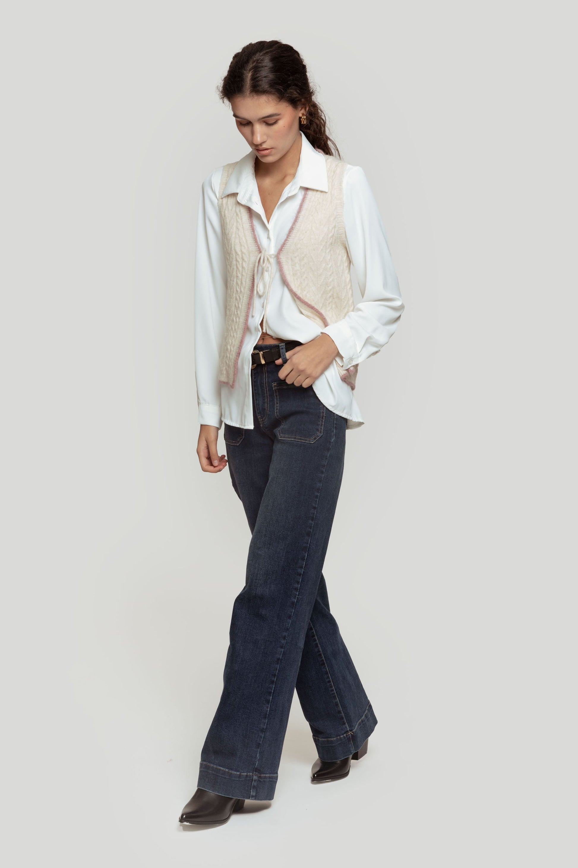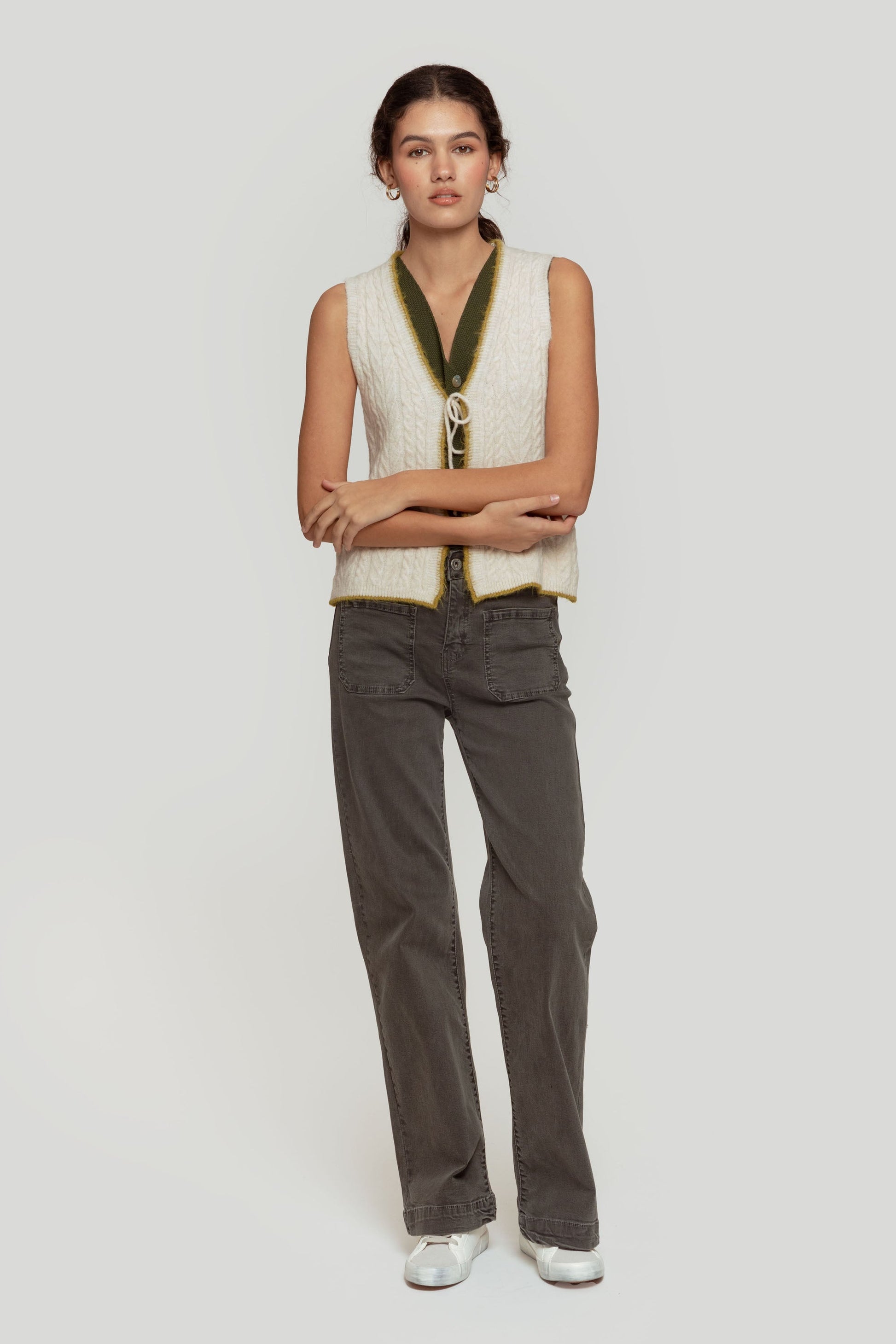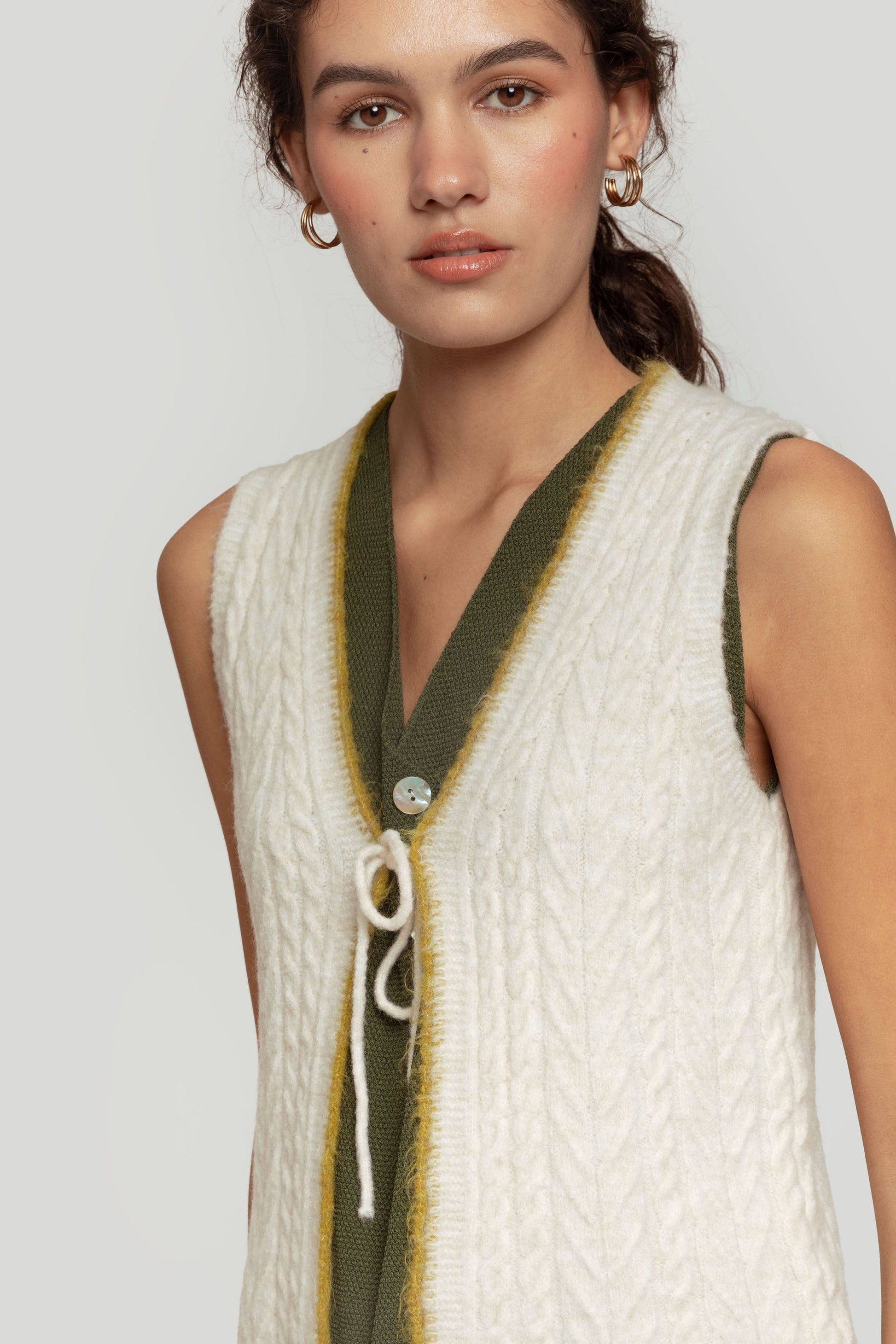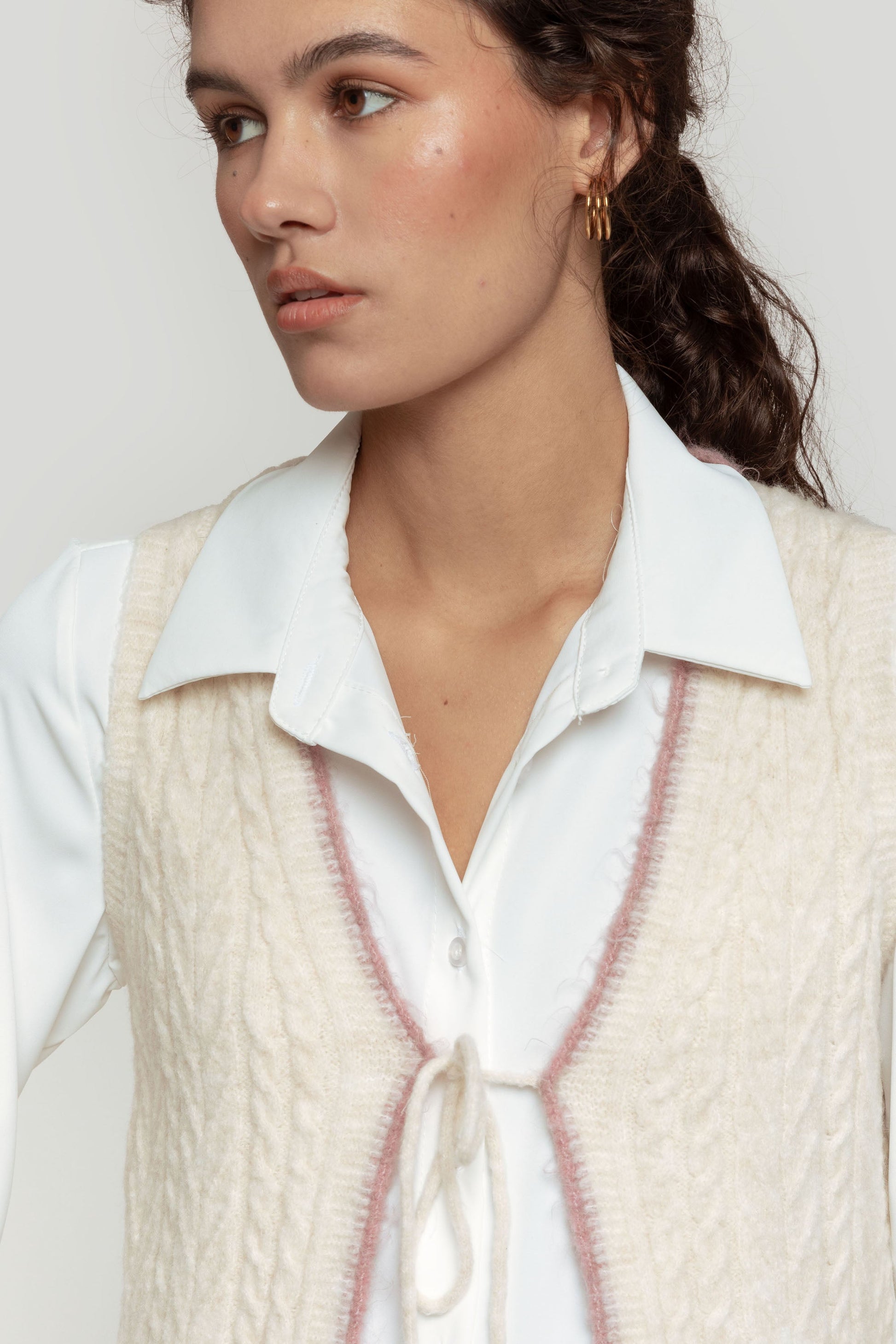 Tejido de punto. Diseño trenzado. Diseño recto. Cuello pico. Manga sisa. Cierre de lazada. Acabado lana. Terminaciones en otro color. Terminaciones en rib. Talla modelo: S. Altura modelo: 1,75 m.