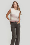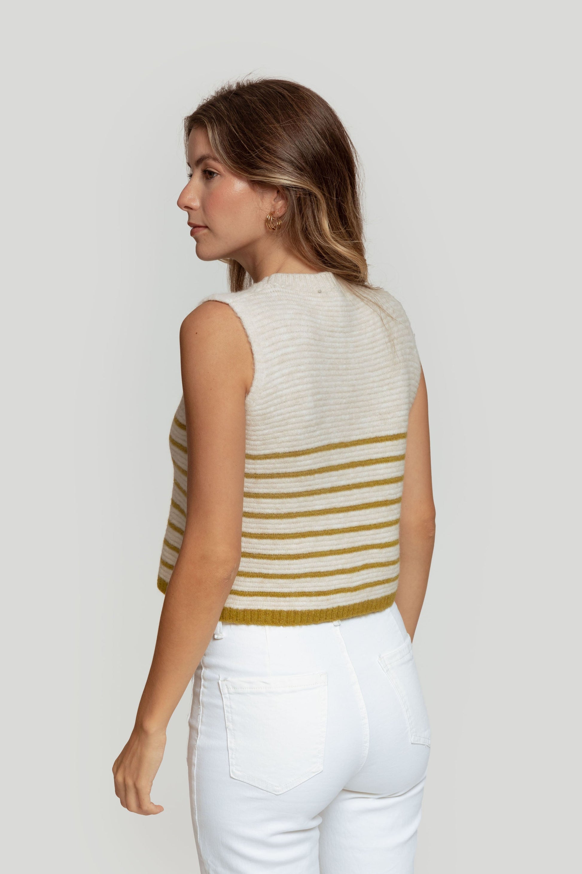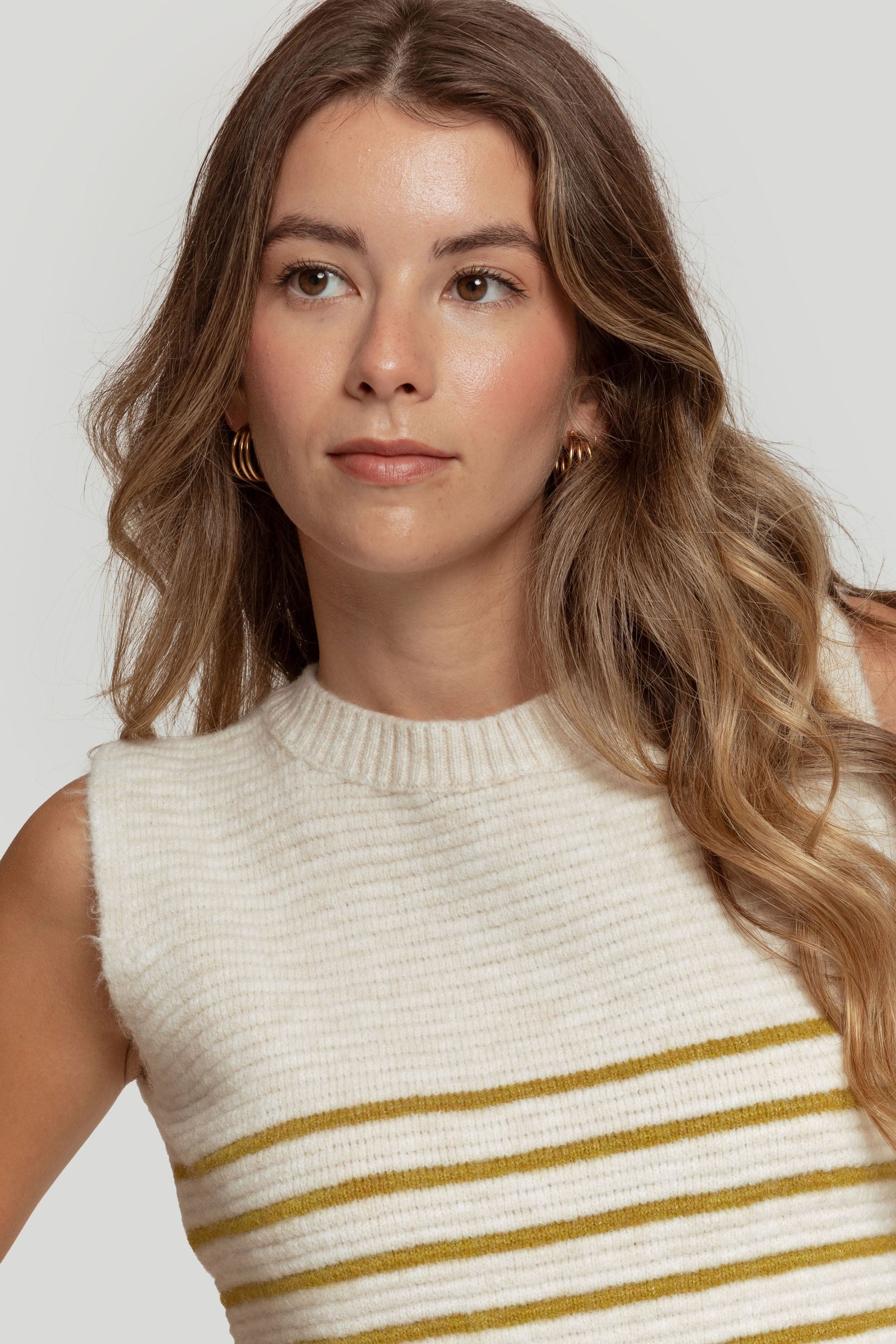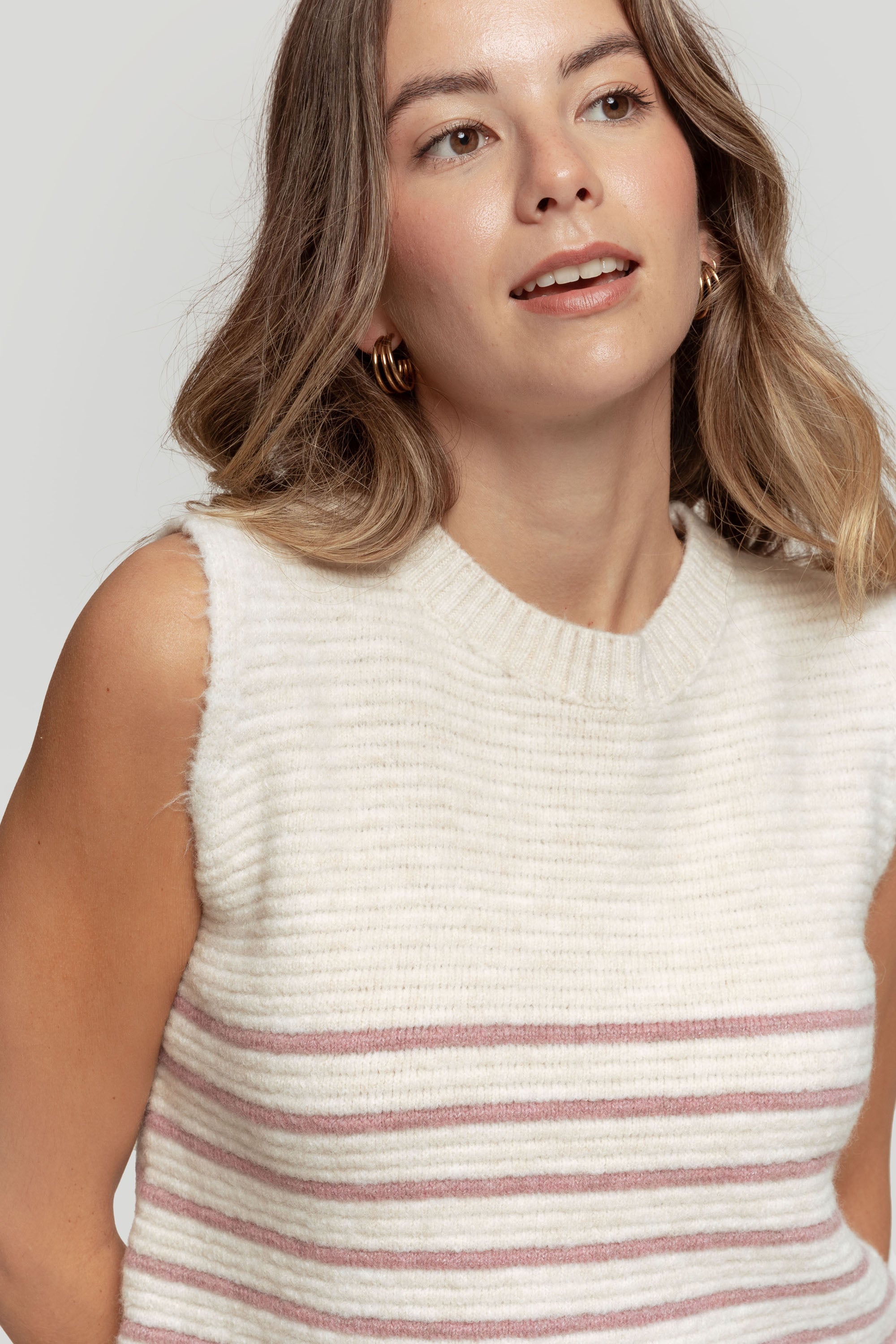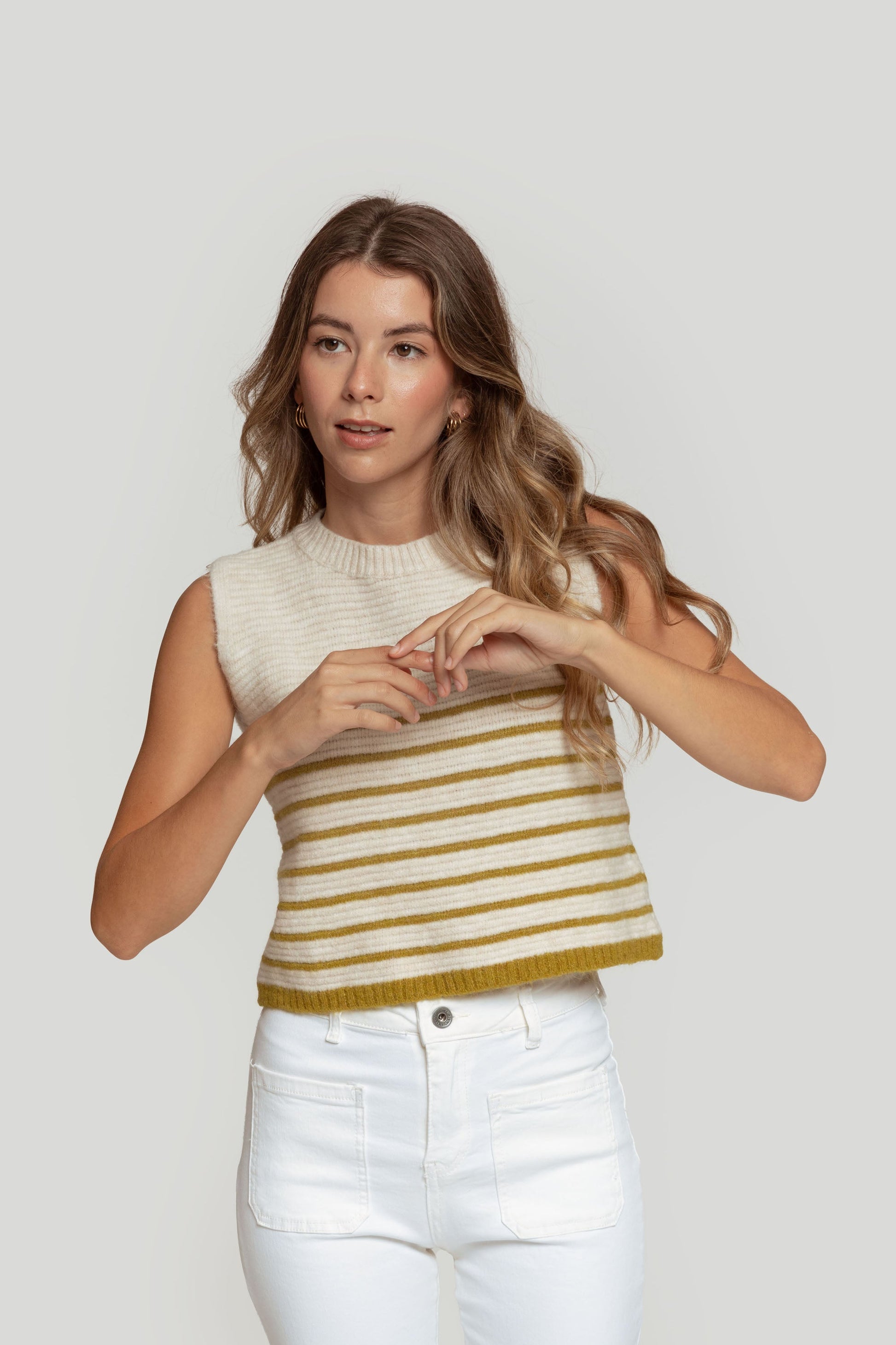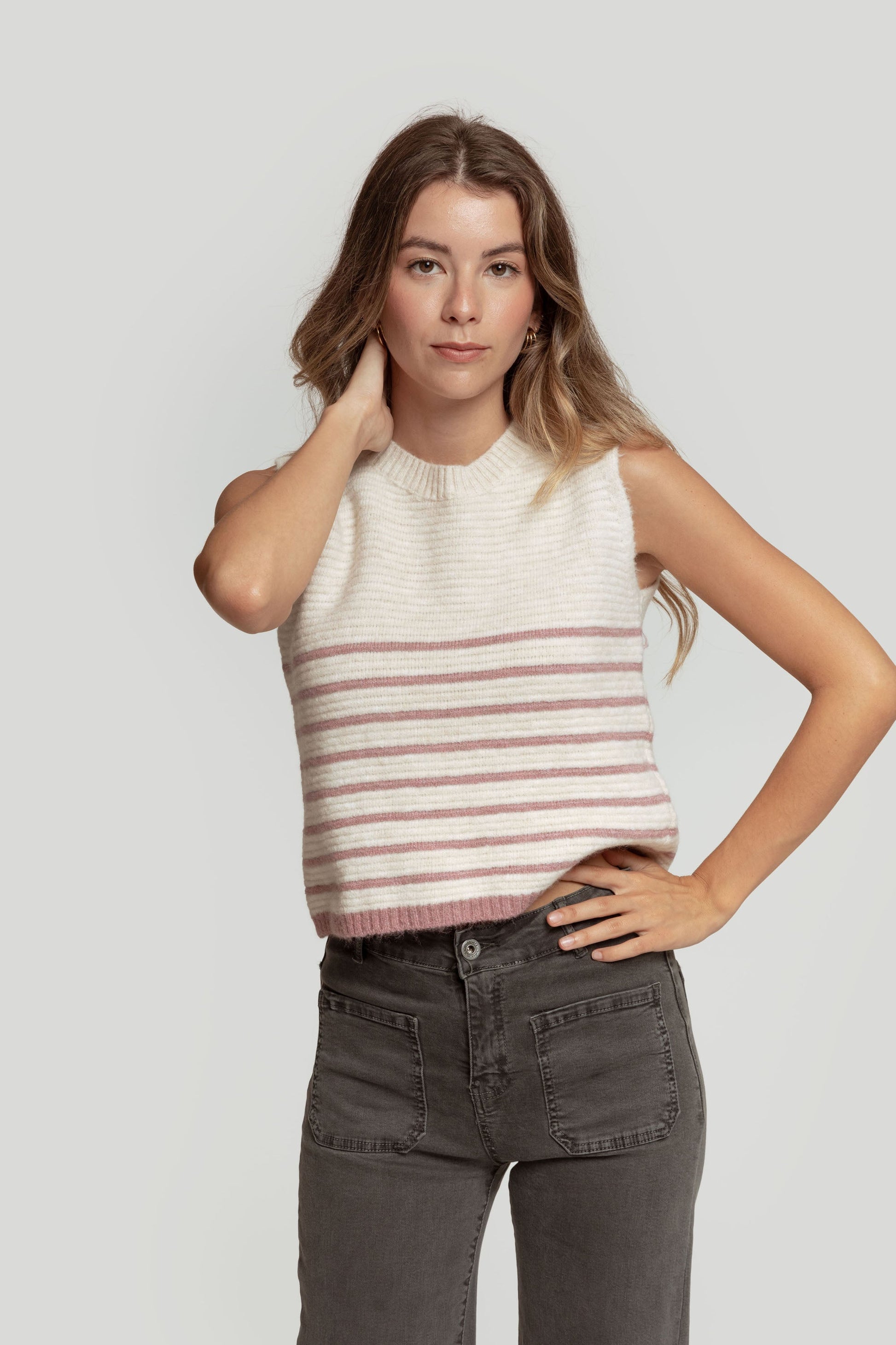 Tejido de punto. Diseño estampado. Diseño recto. Cuello redondo. Manga sisa. Terminaciones en rib. Talla modelo: S. Altura modelo: 1,70 m.