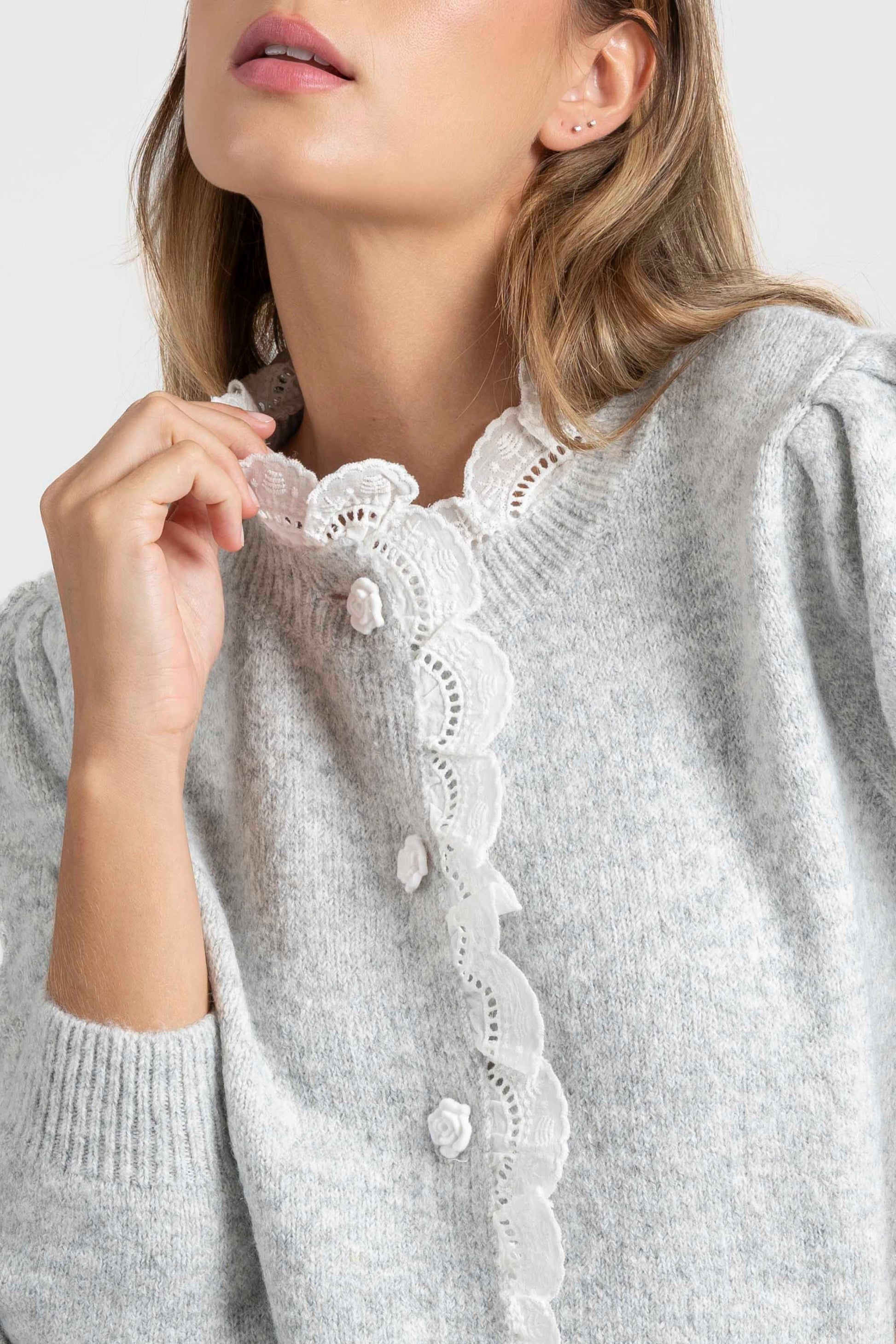 Tejido de punto. Cuello redondo. Detalle bordados. Acabados en rib. Cierre frontal con botones a contraste.
