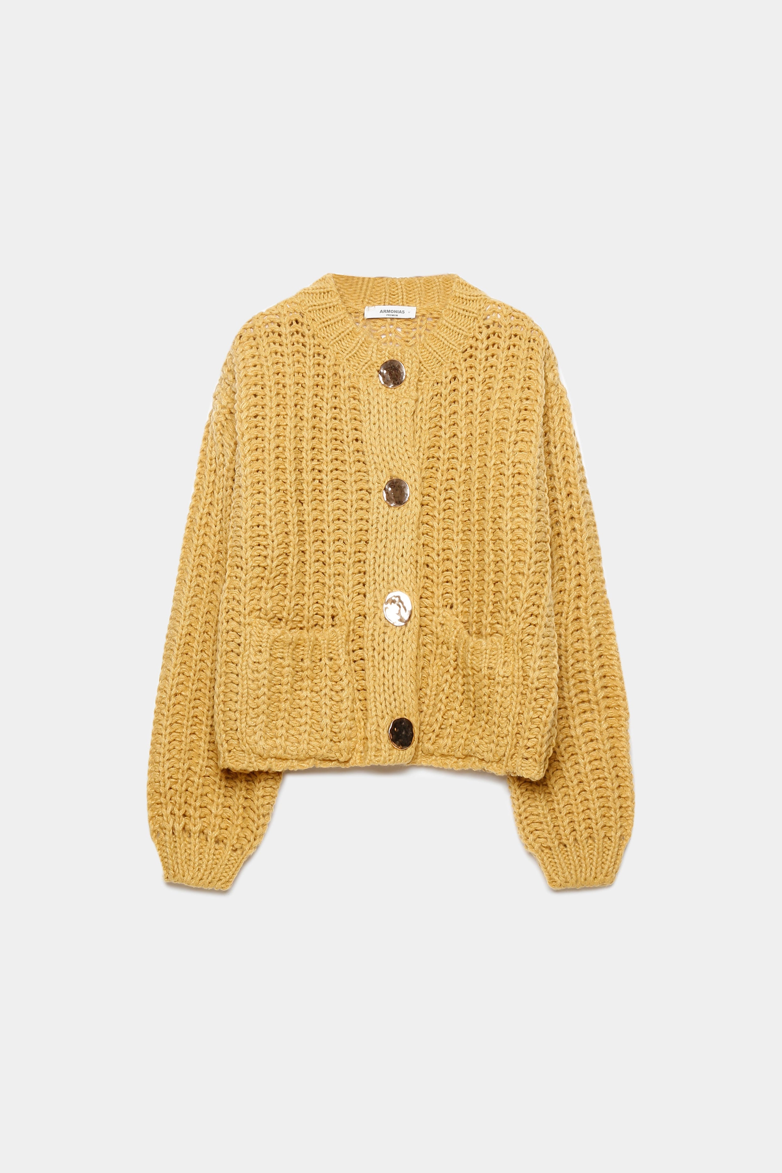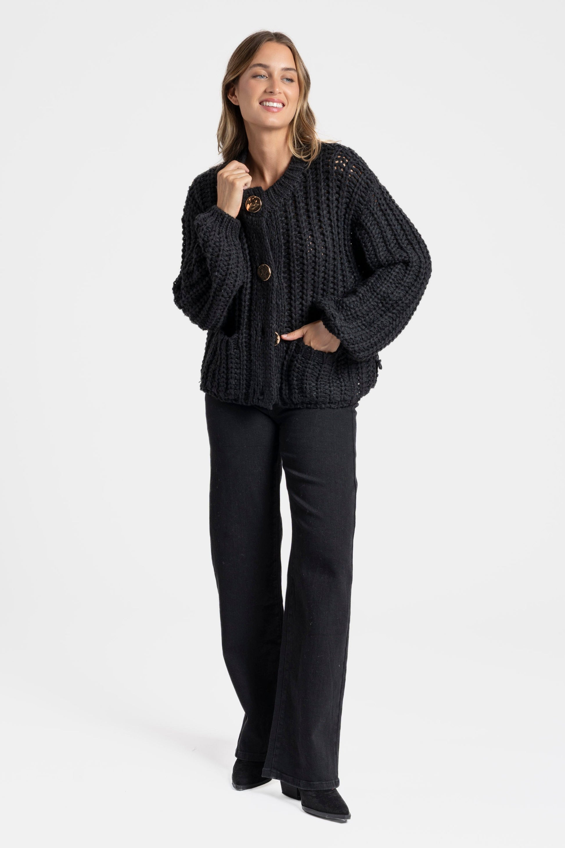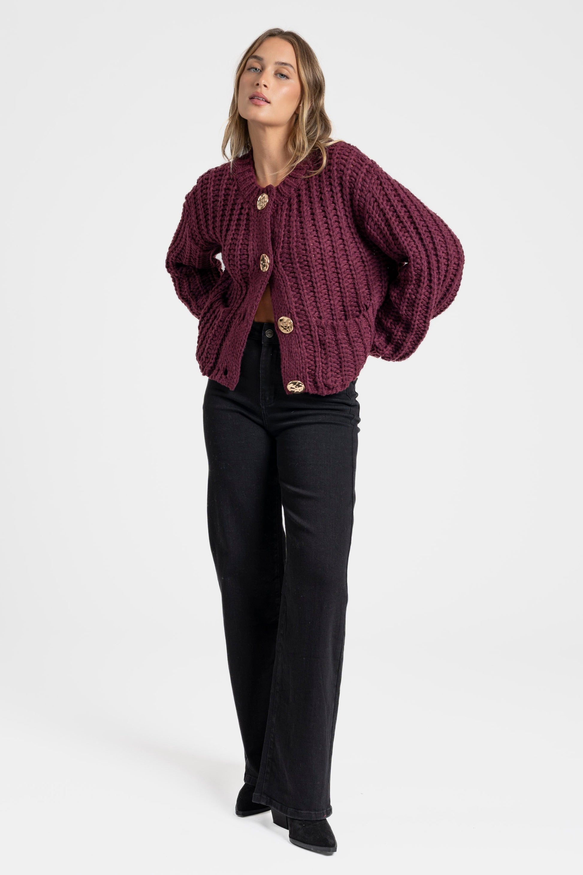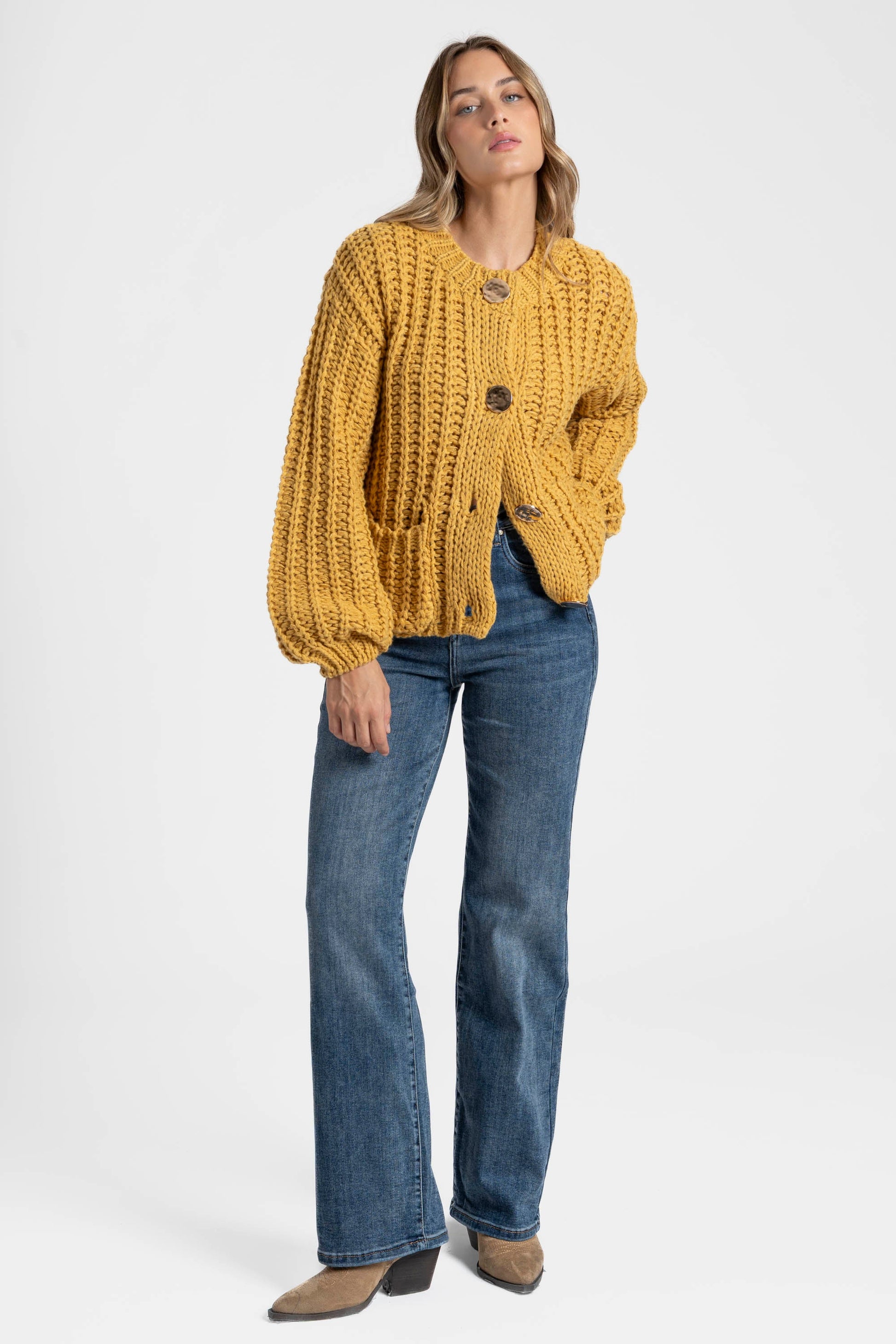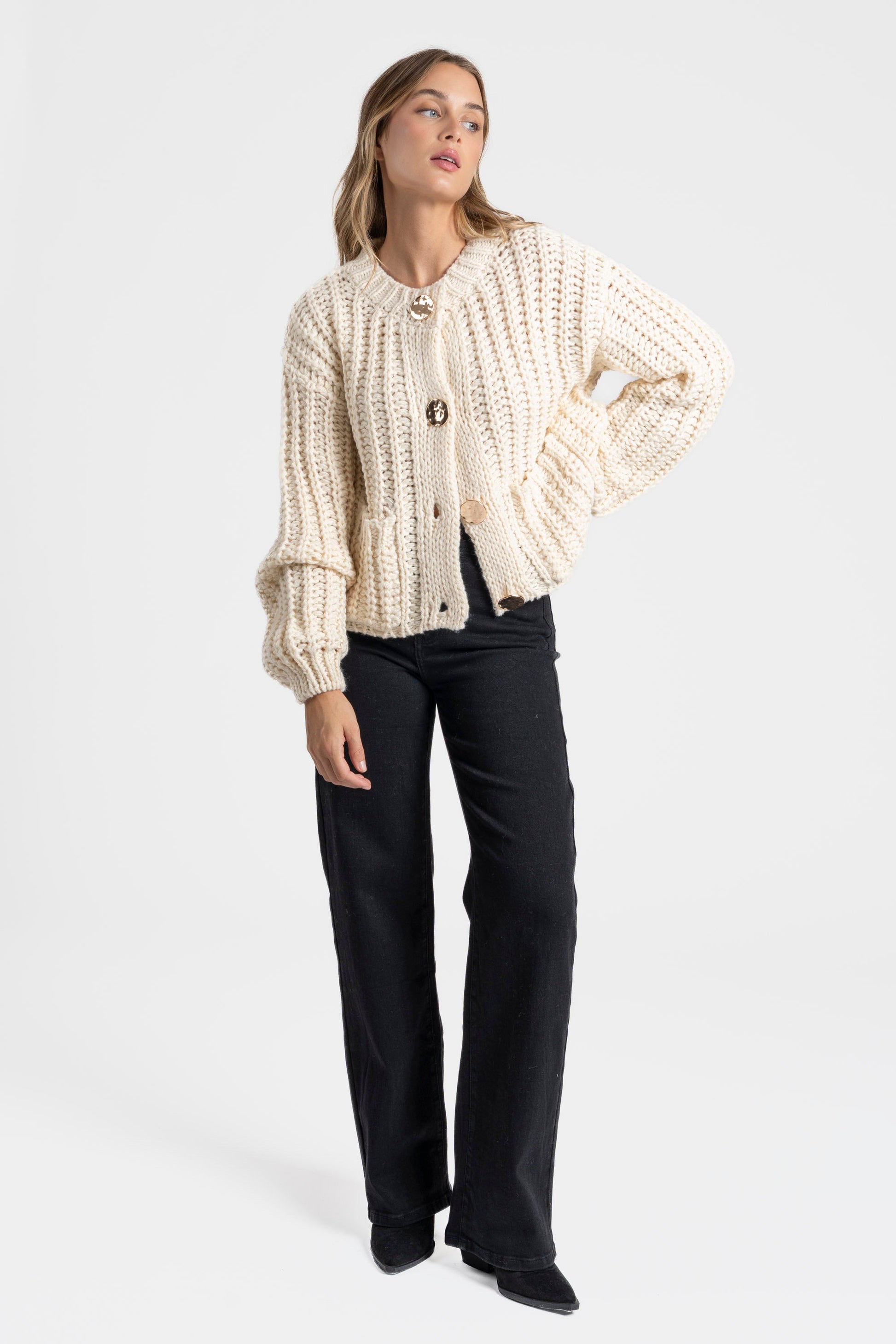 Punto grueso. Manga larga. Bolsillos frontales. Cierre con botones metálicos.