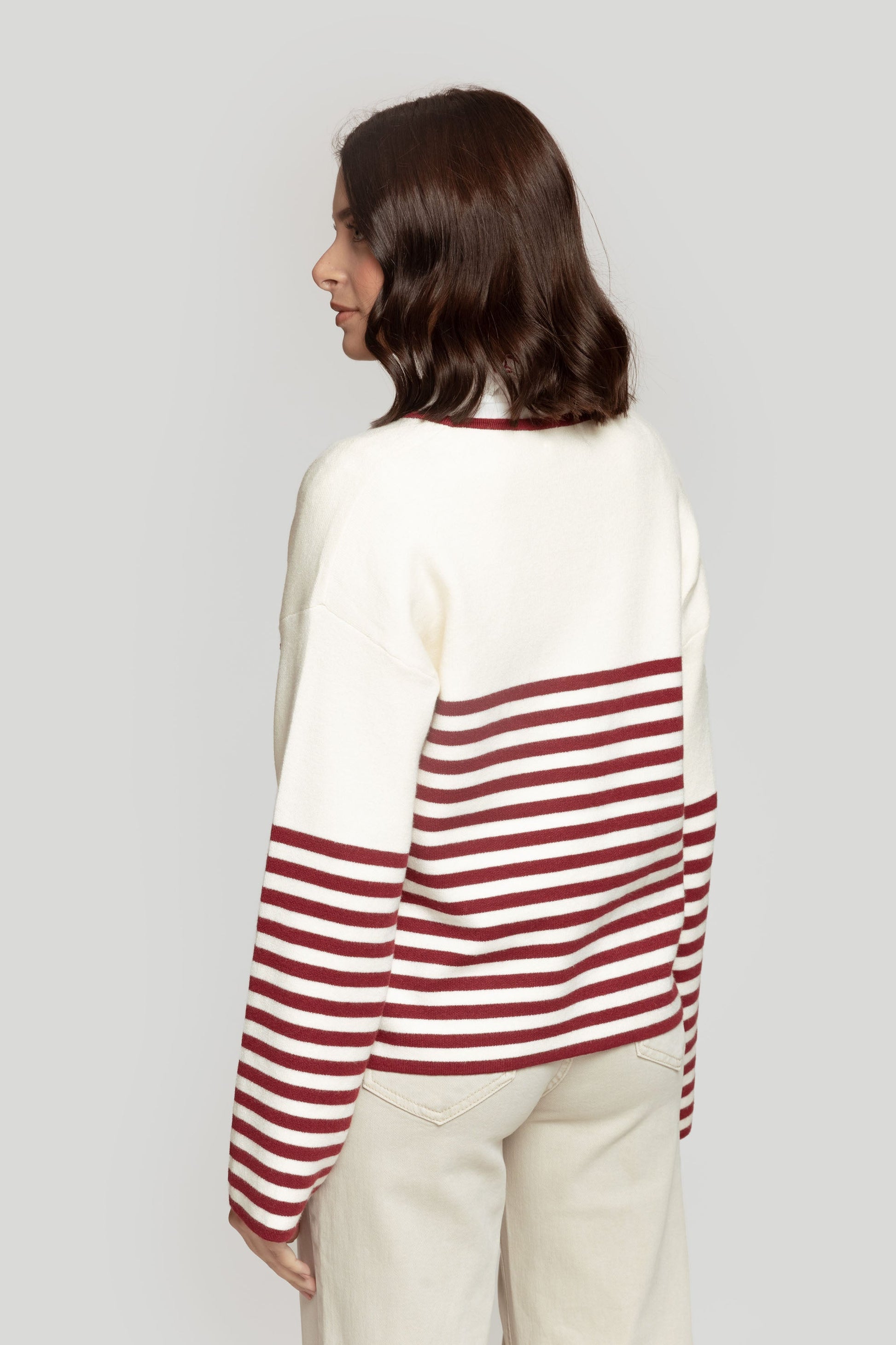 Tejido de punto. Diseño estampado. Diseño oversize. Diseño cropeed. Diseño recto. Cuello pico. Manga larga. Hombros caídos. Talla única. Altura modelo: 1.76 m.