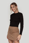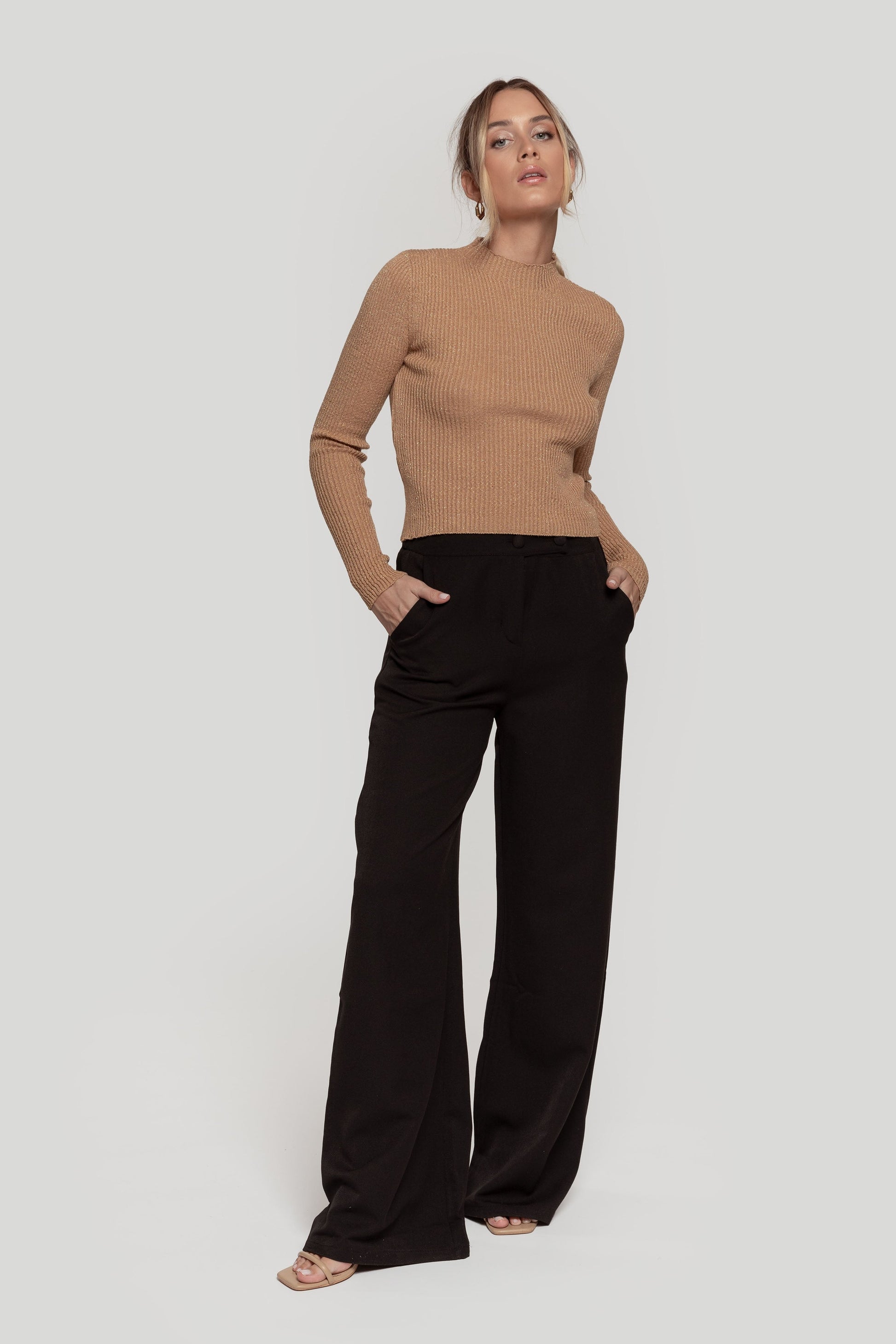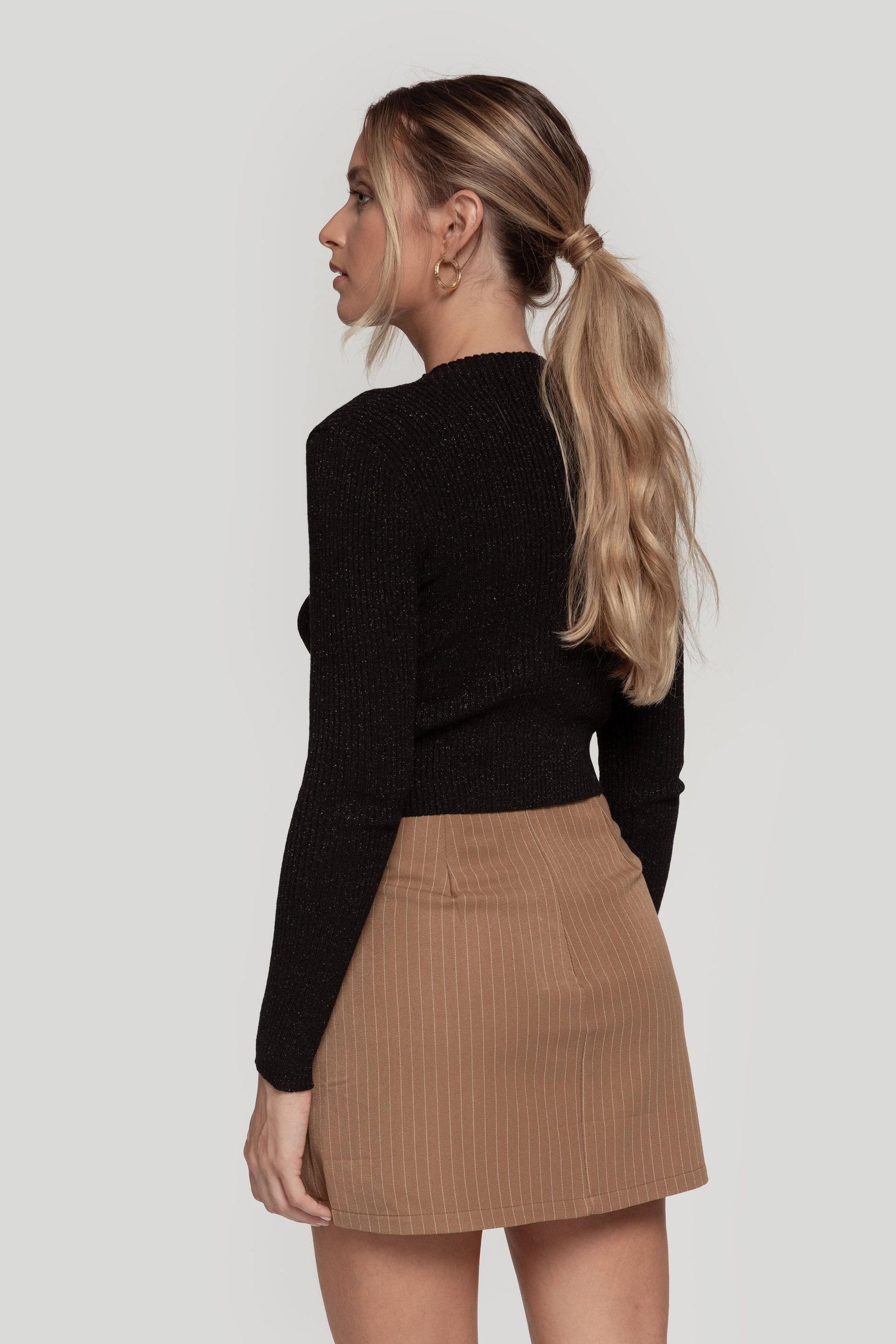 Tejido de canalé. Tejido brillo. Diseño entallado. Diseño recto. Cuello redondo. Manga larga. Talla modelo: S. Altura modelo 1,66 m.