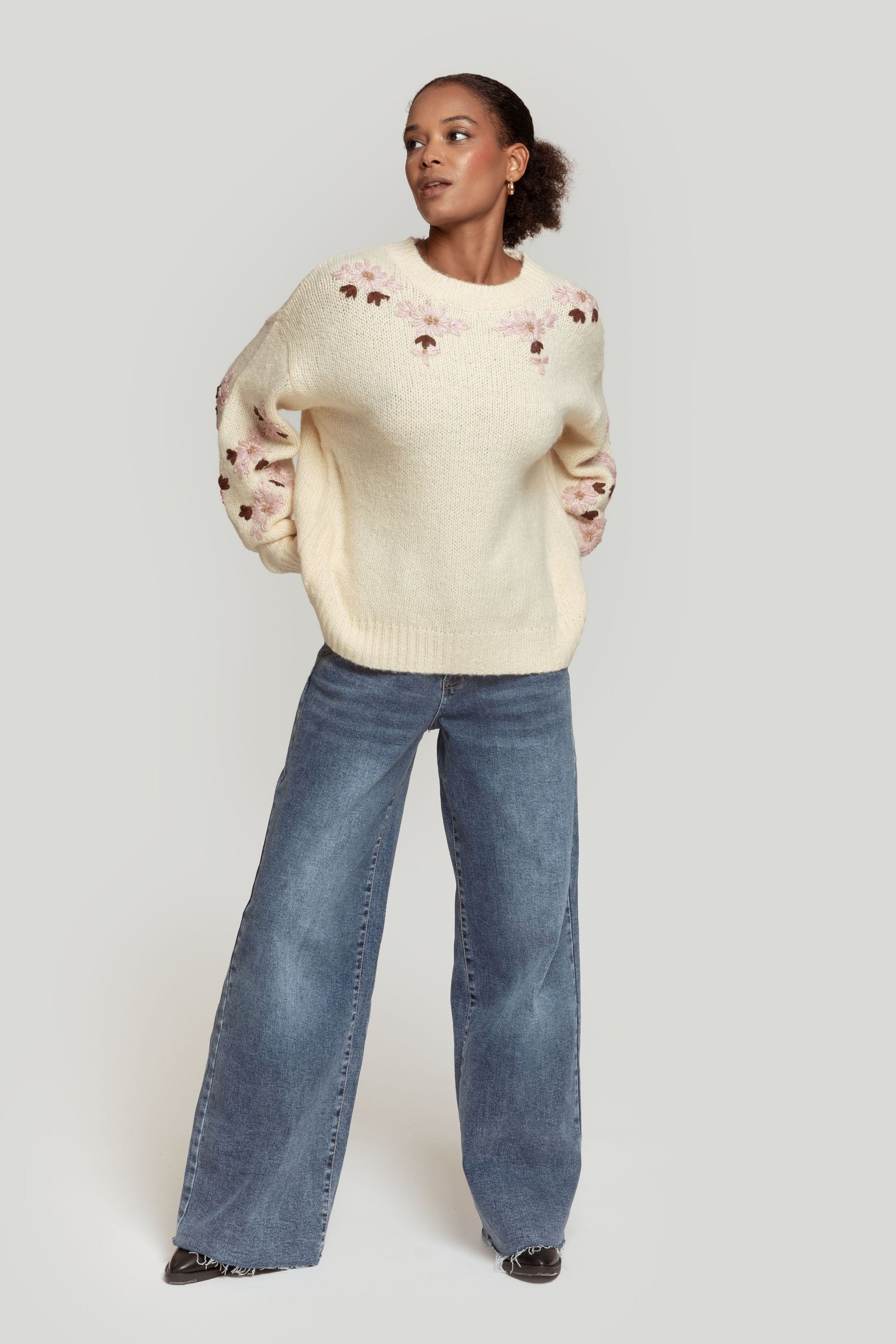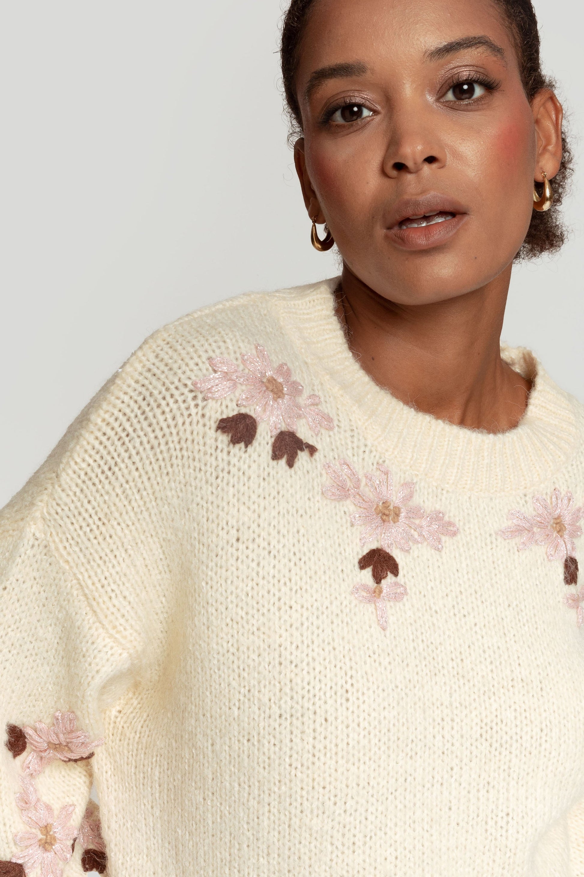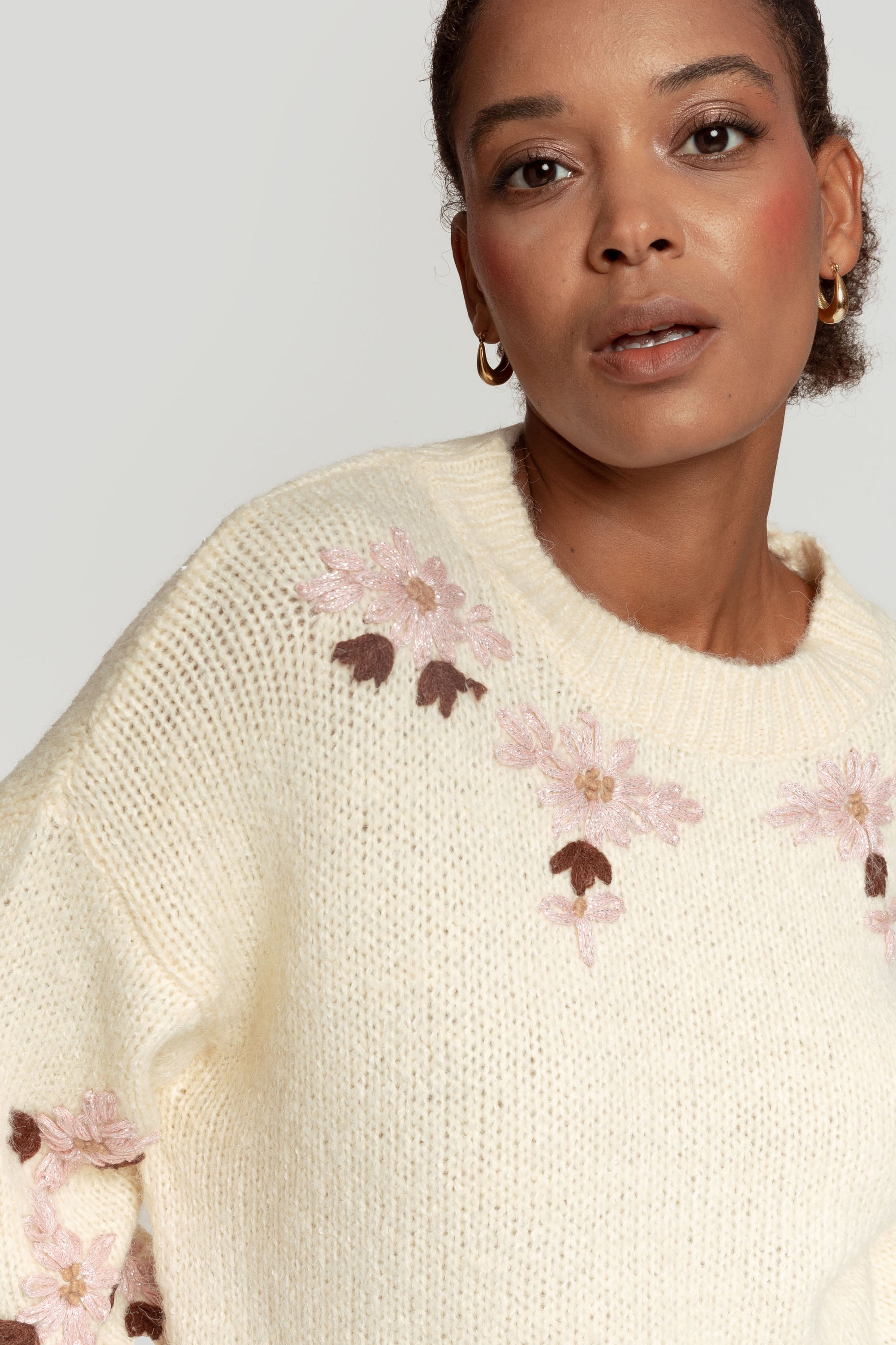 Tejido de punto. Punto grueso. Cuello redondo. Manga larga. Hombros caídos. Acabado lana. Terminaciones en rib. Flores tejidas con acabado de brillo. Talla única. Altura modelo: 1,66 m.