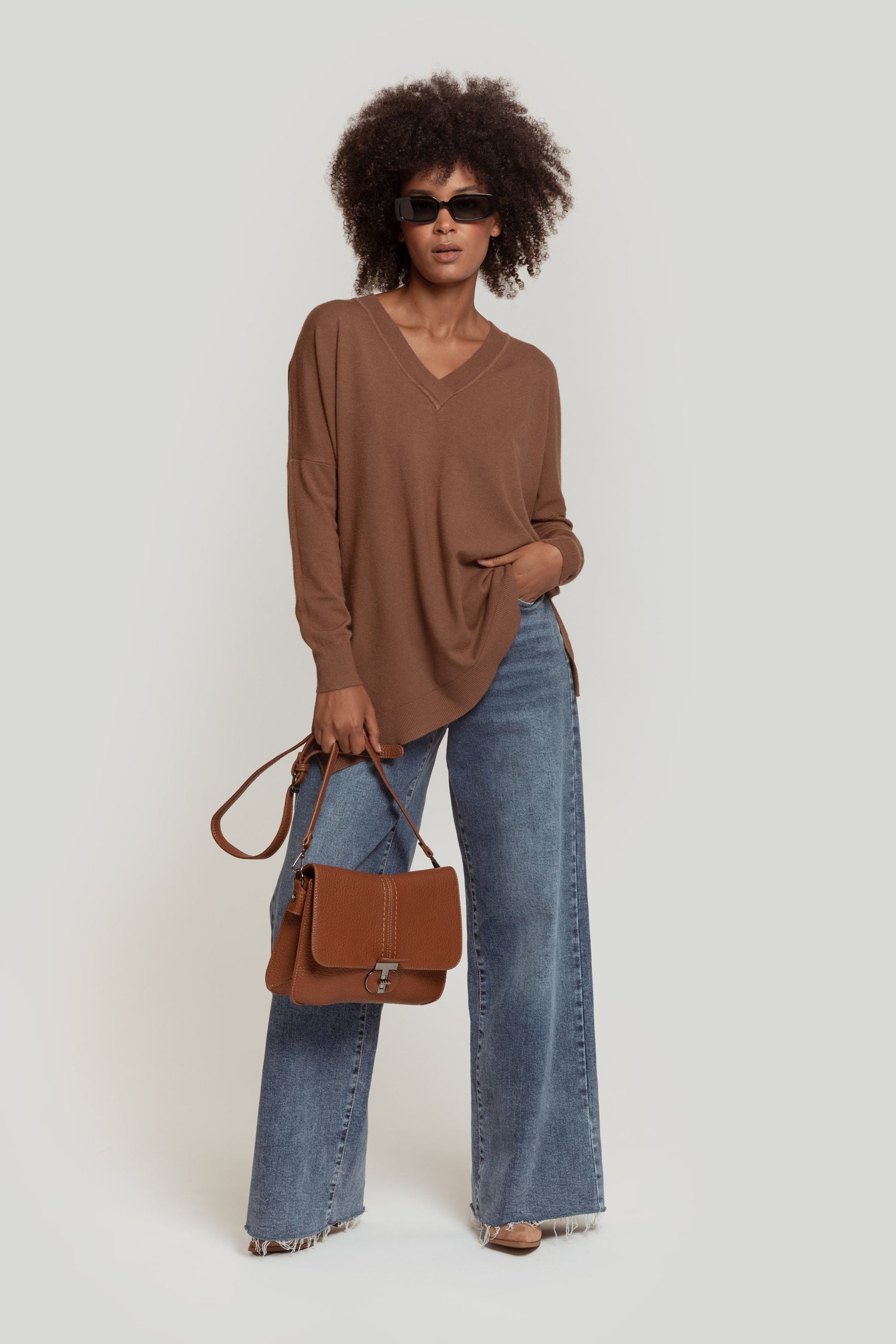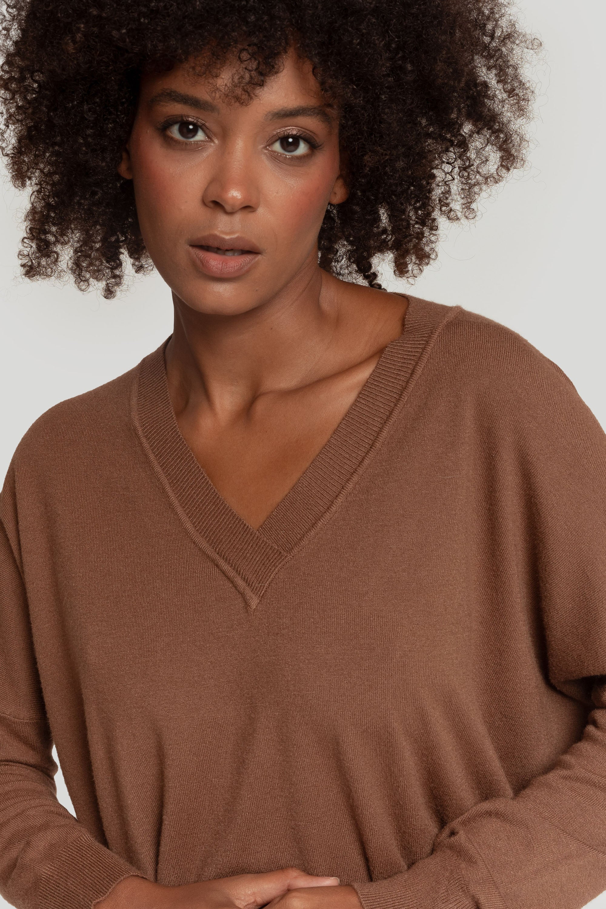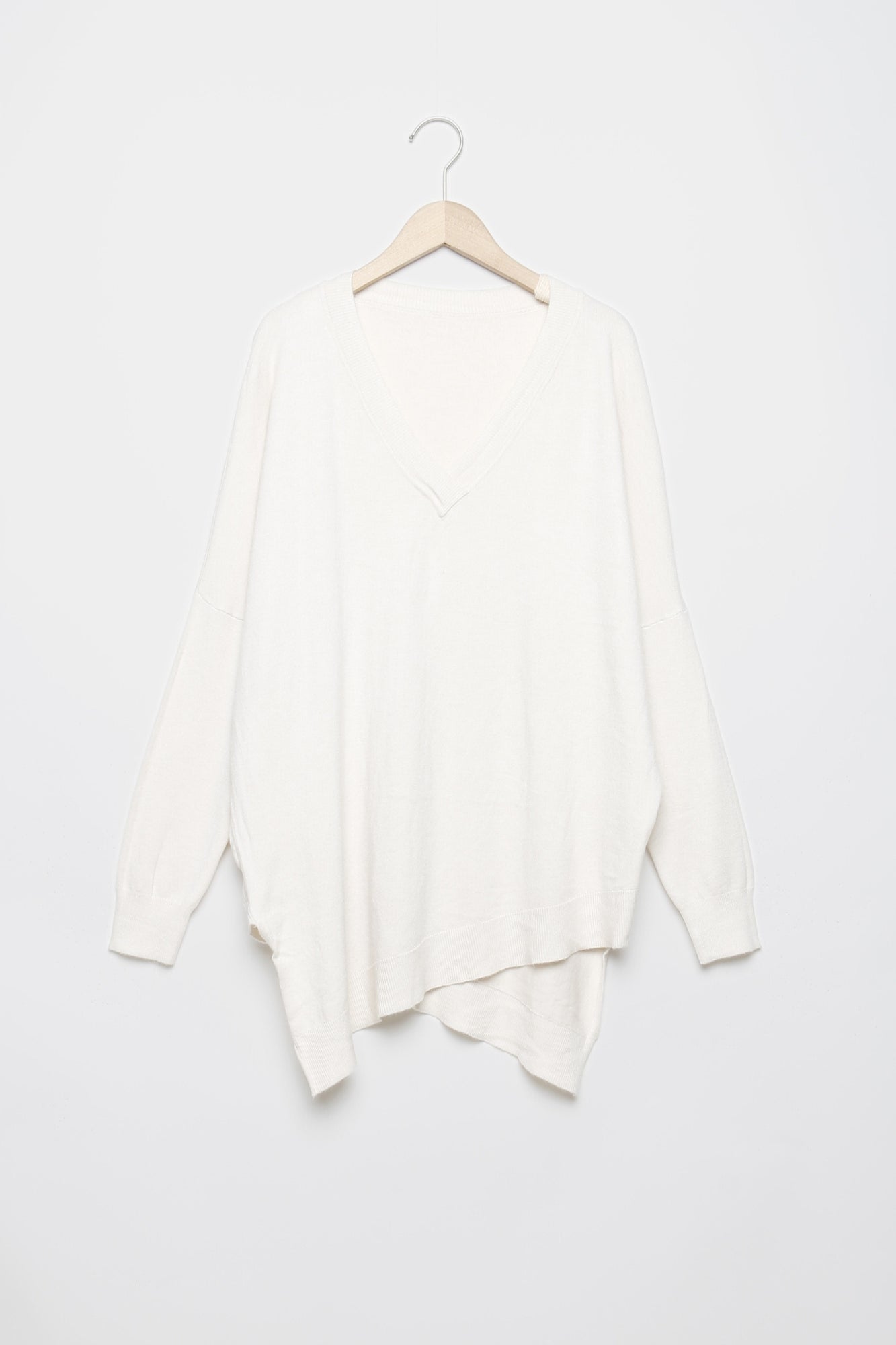 Tejido punto. Diseño oversize. Diseño recto. Cuello pico. Manga larga. Hombros caídos . Parte de atrás ligeramente más larga. Terminaciones en rib. Talla única. Altura modelo 1,66 m.