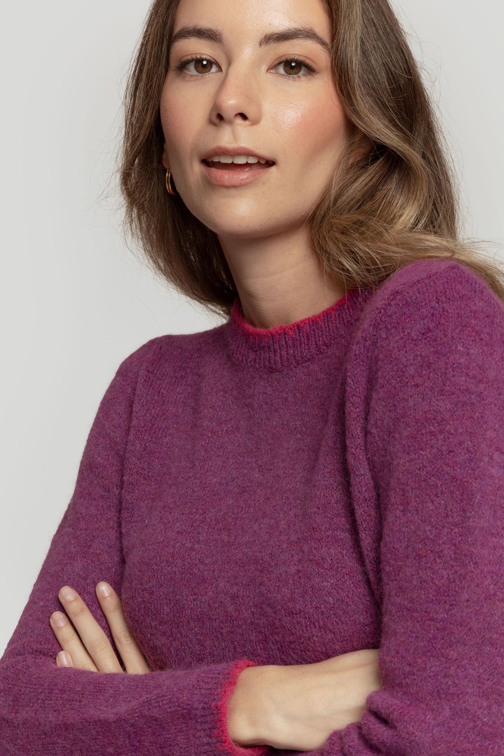 Tejido de punto. Diseño recto. Cuello redondo. Manga larga. Acabado lana. Terminaciones en otro color. Talla modelo: S. Altura modelo: 1,70 m.