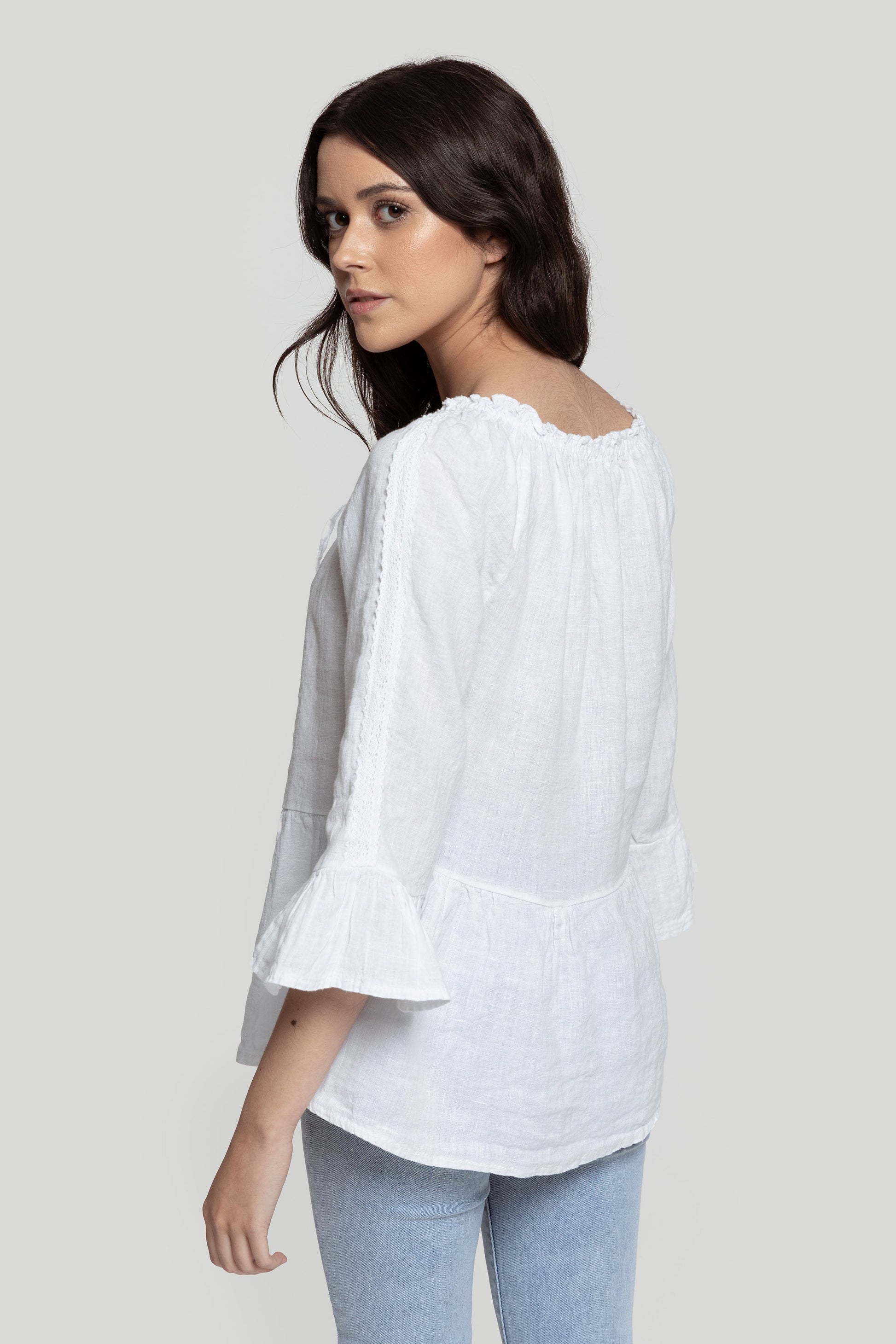 Blusa fluida. Tejido lino. Diseño amplio. Cuello amplio con elástico Manga tres cuarto. Bajo volante. Talla modelo: S. Altura modelo 1,67 m.