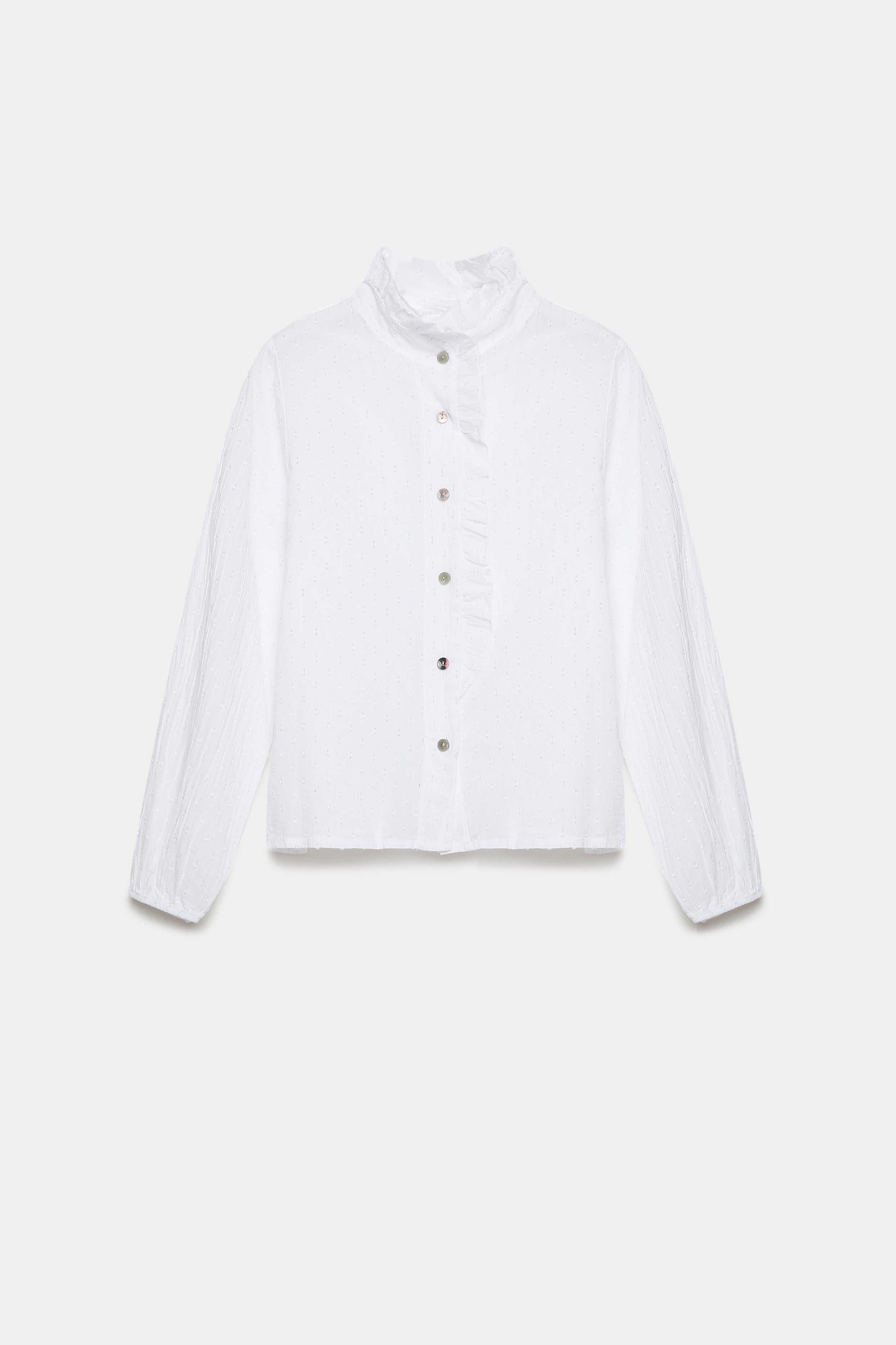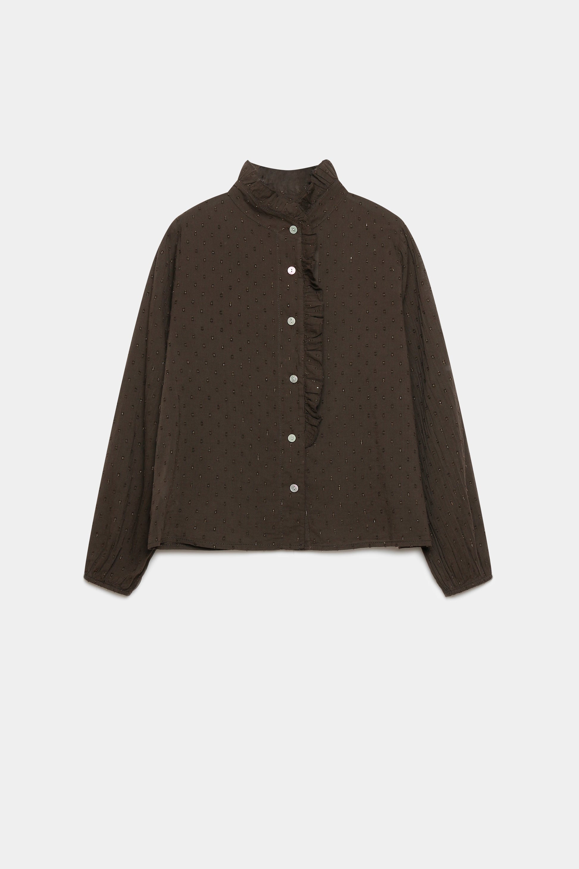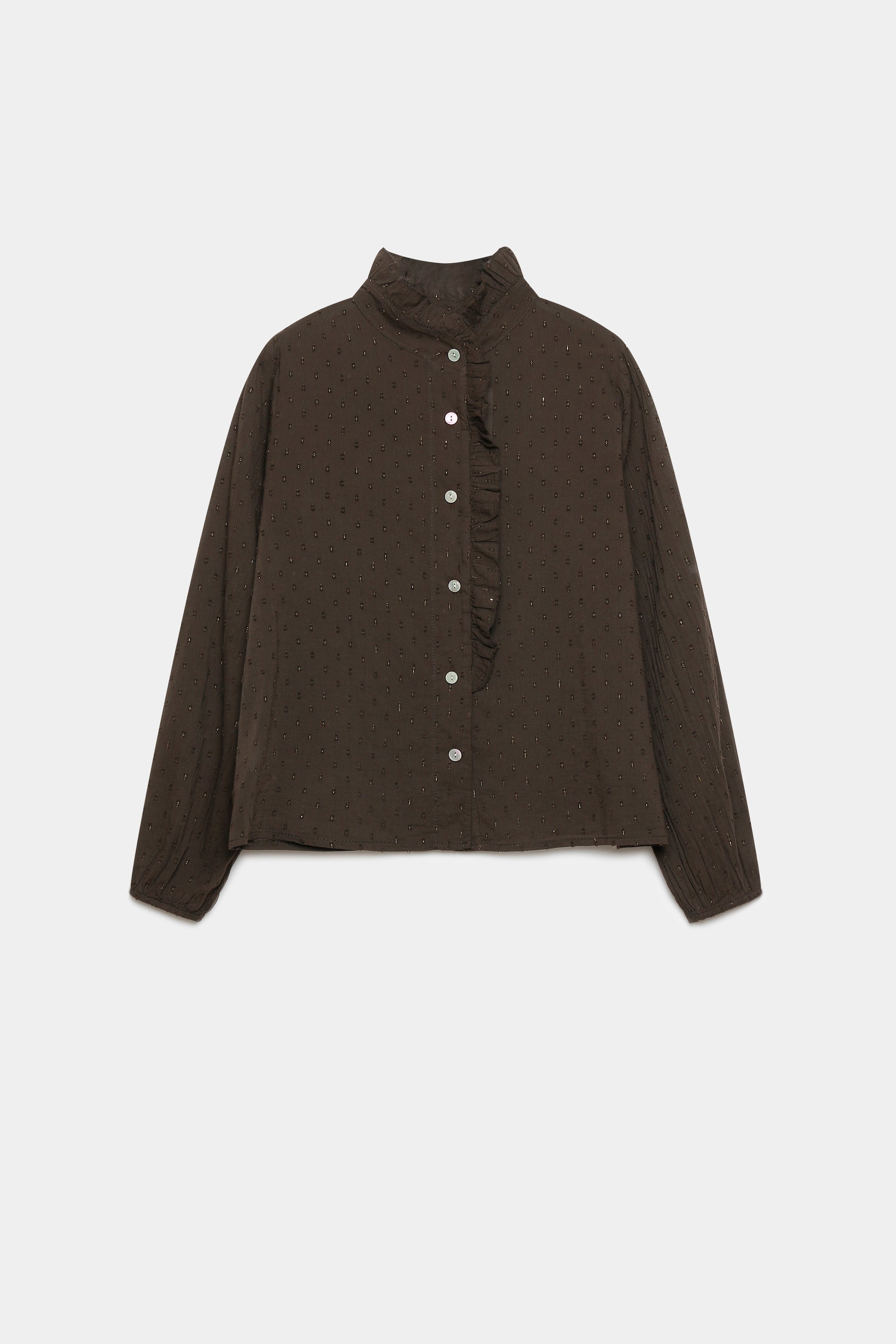 Tejido plumeti. Cuello redondo subido. Manga larga. Cierre de botones. Detalle de brillos.