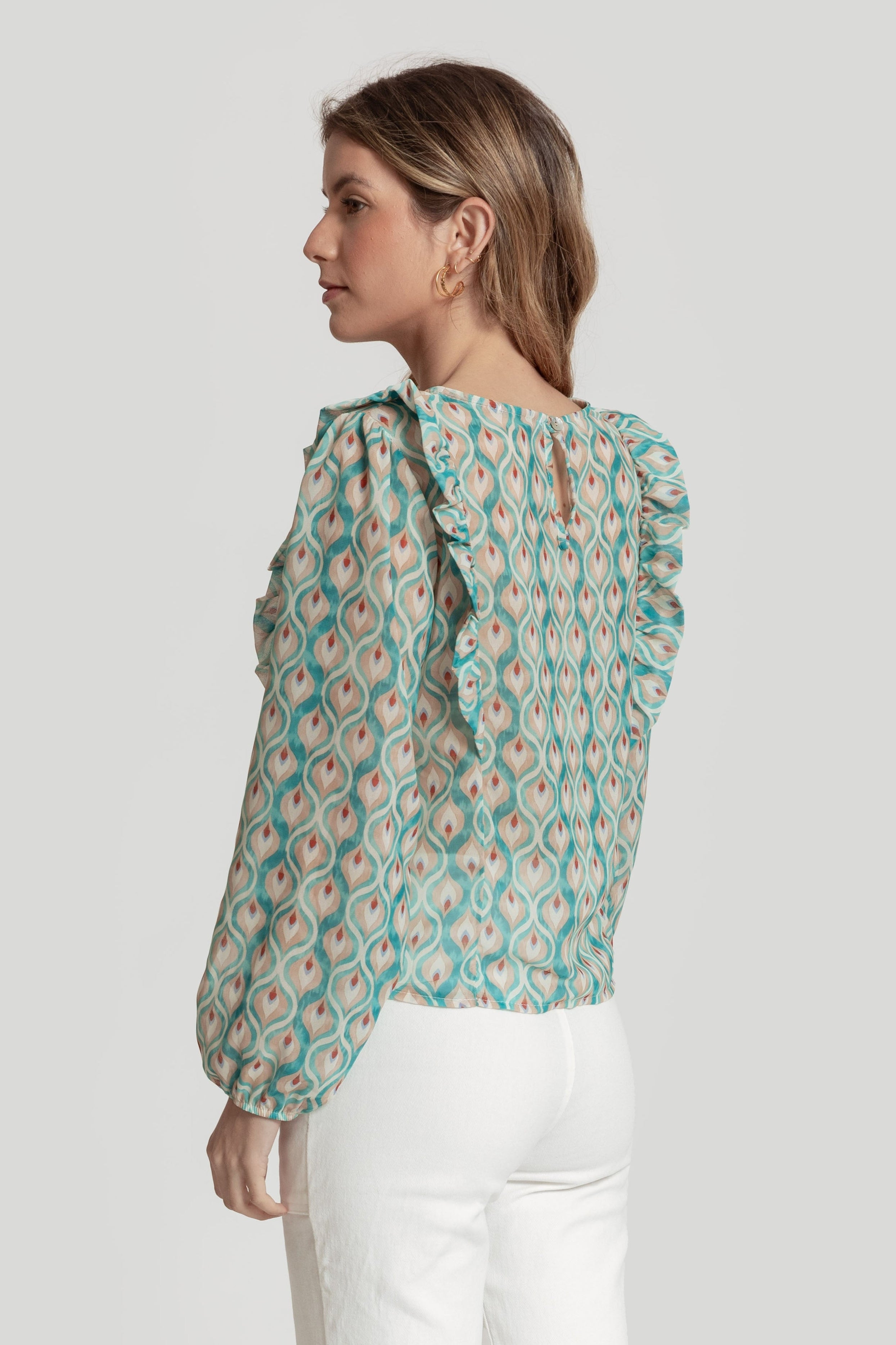 Tejido gasa. Diseño estampado. Diseño recto. Cuello redondo. Manga larga. Puño elástico. Tejido semitransparente. Abotonado en la nunca. Detalle volantes. Talla modelo: S. Altura modelo 1,70 m.
