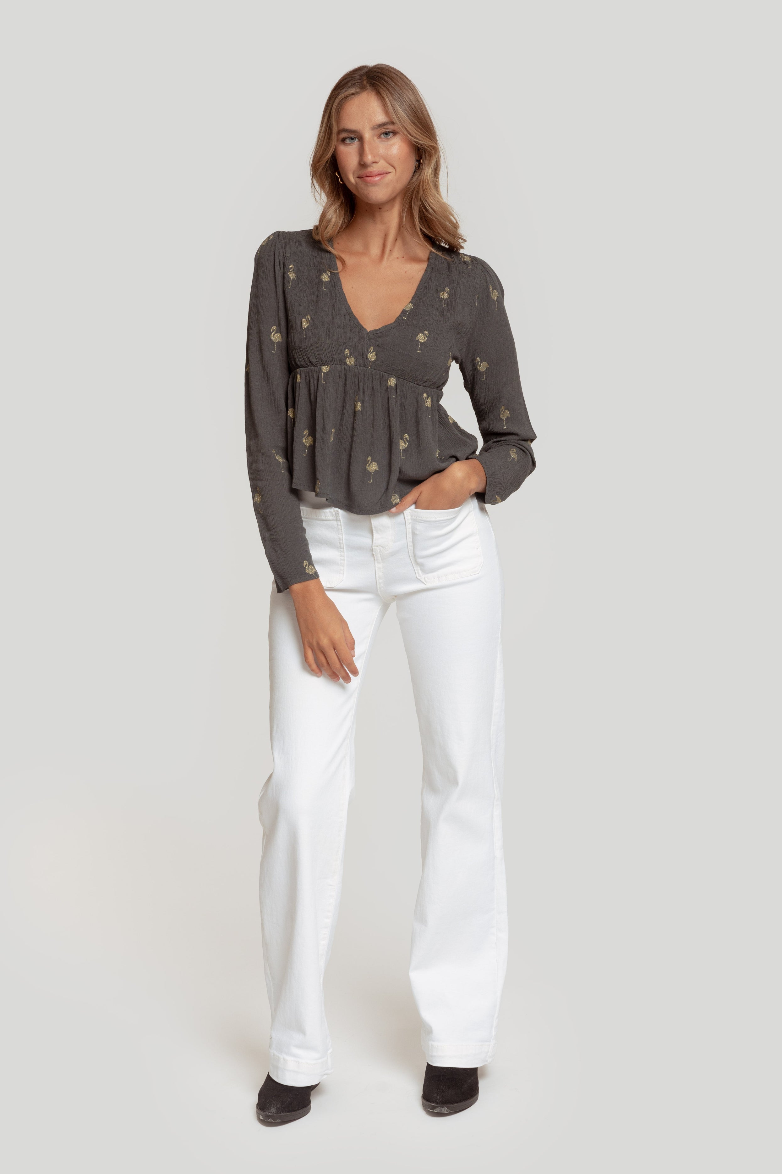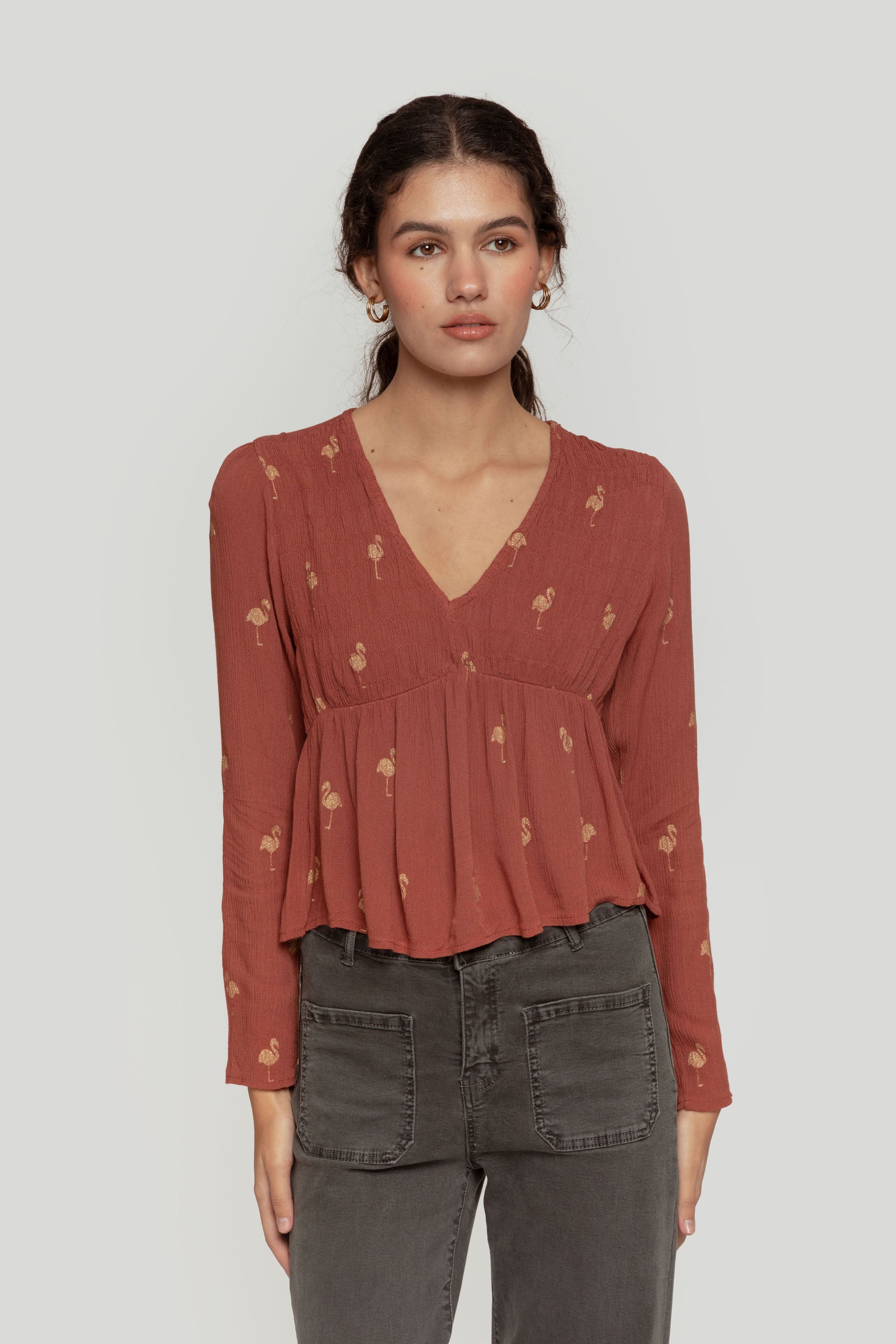 Tejido efecto arrugado. Diseño estampado cisne. Cuello pico. Manga larga. Talla modelo: S. Altura modelo 1,75 m.