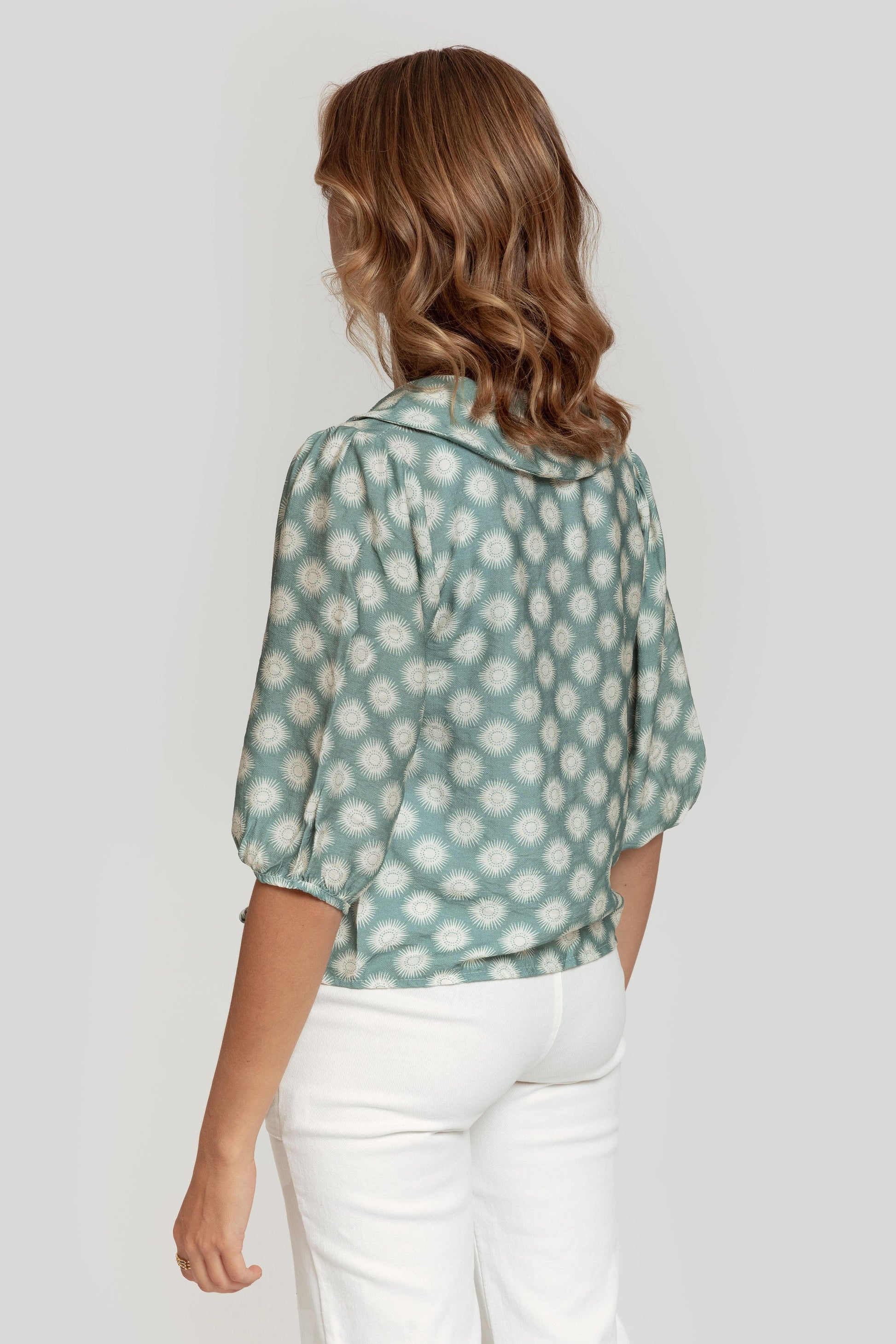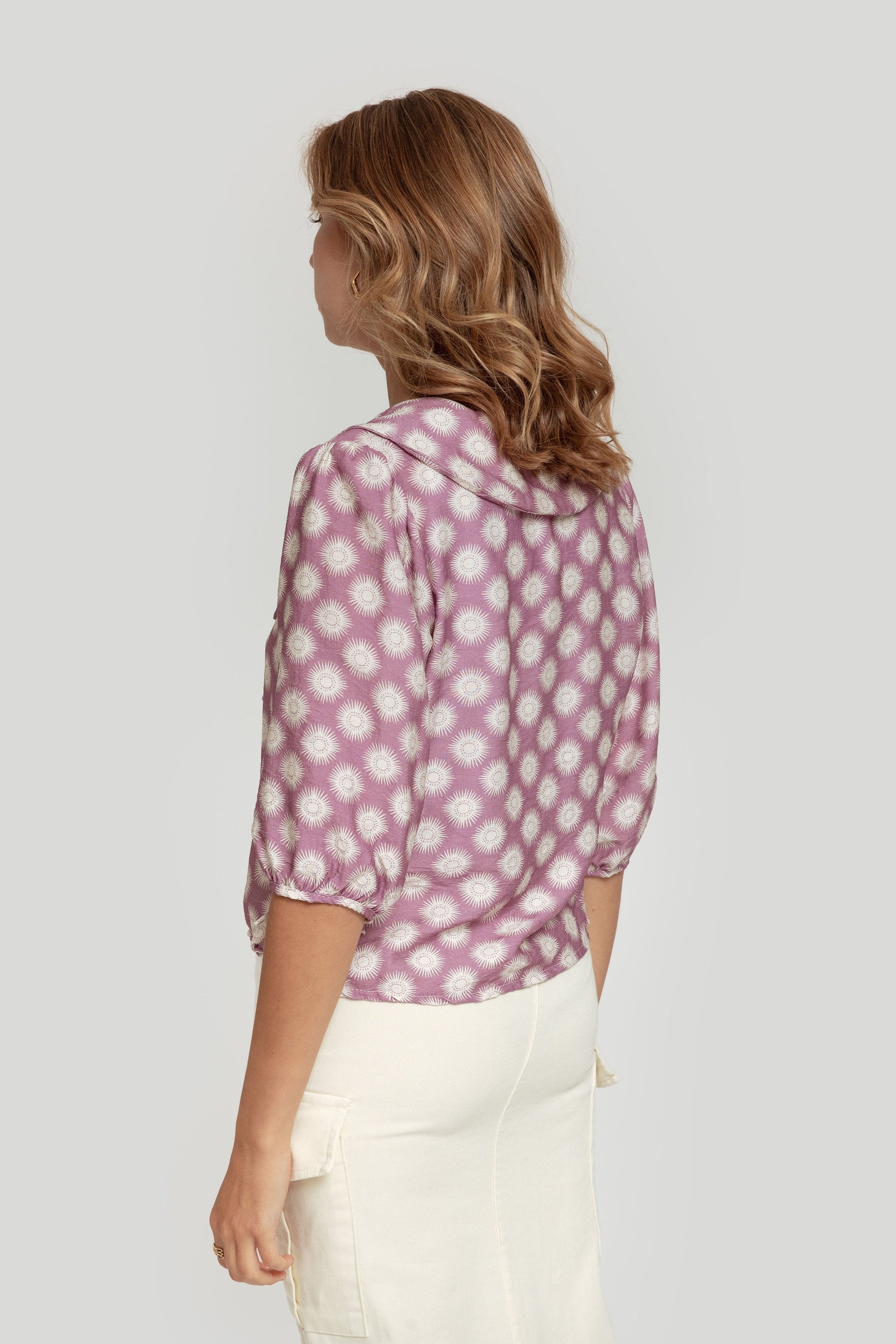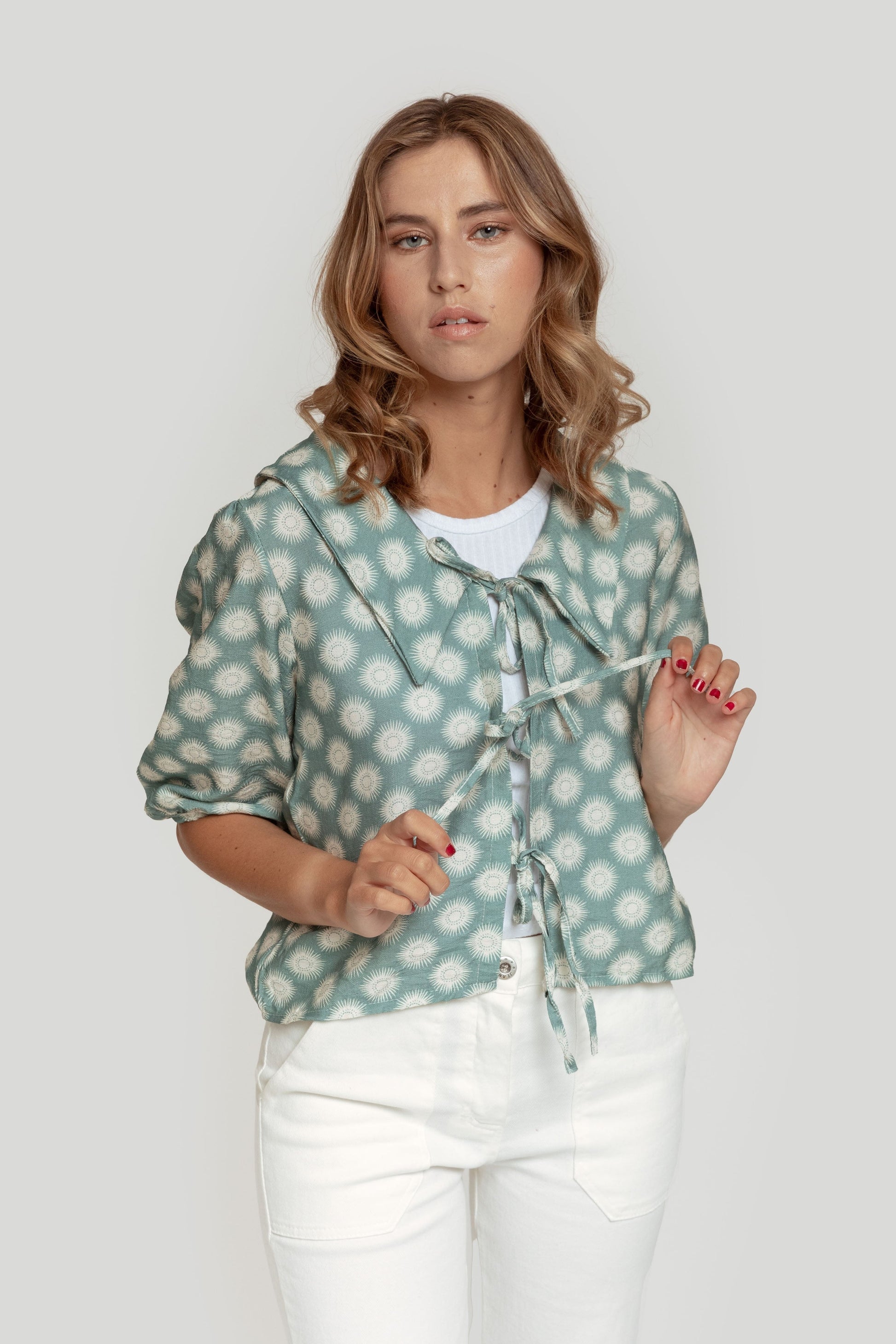 Tejido fluido. Diseño amplio. Diseño recto. Cuello solapa. Manga tres cuartos. Puño elástico. Cierre de lazos. Talla modelo: S. Altura modelo 1,70 m.