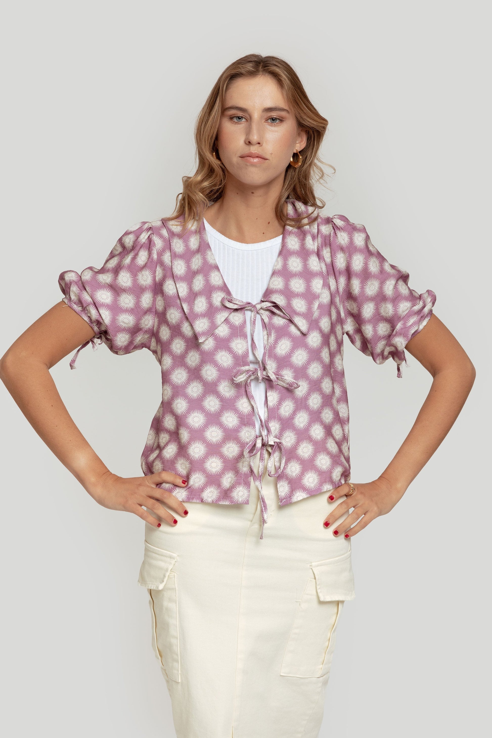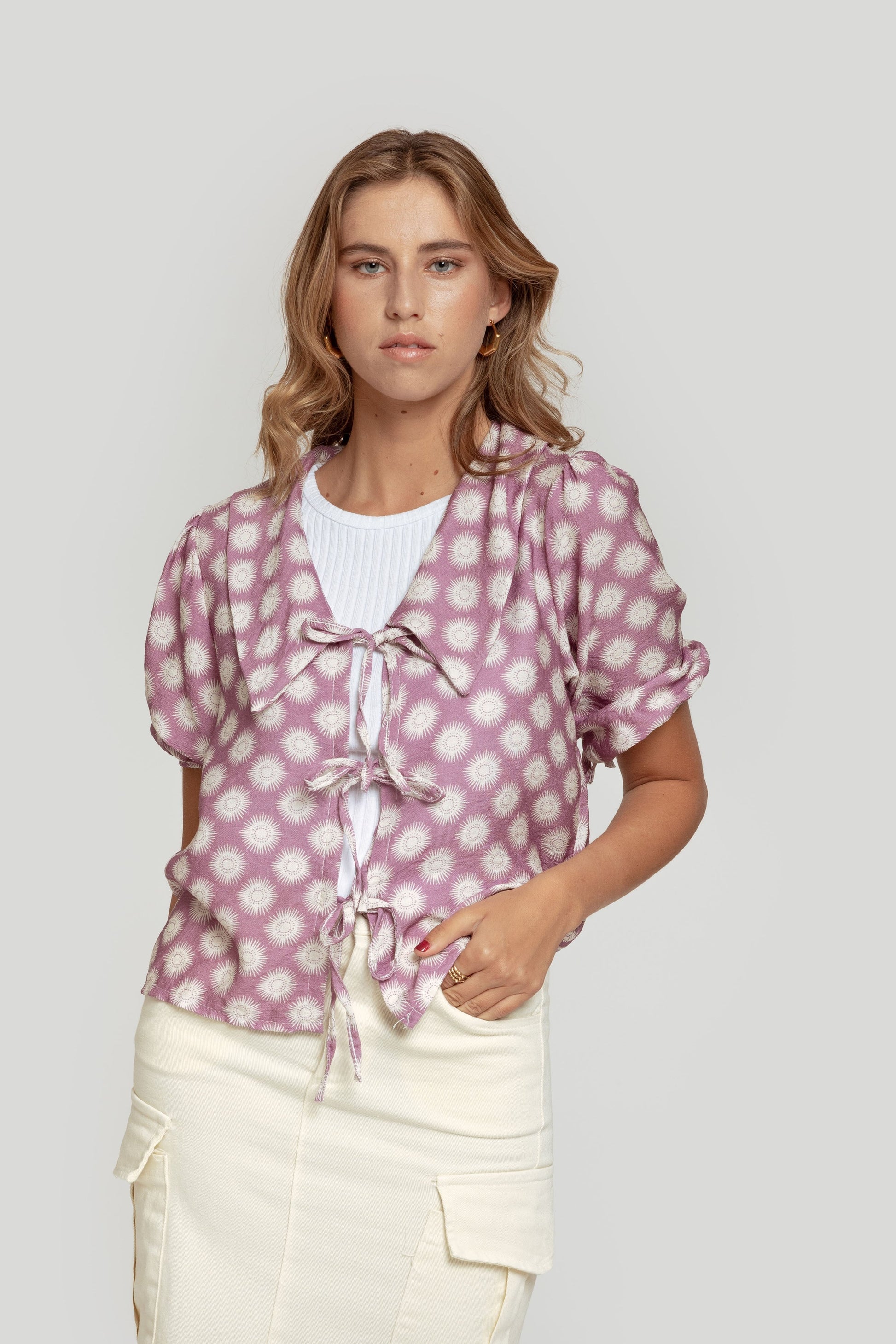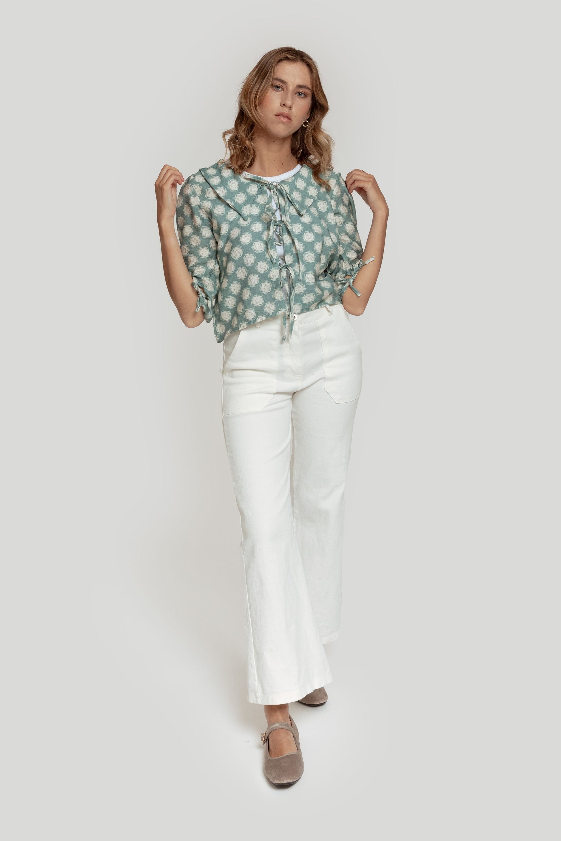 Tejido fluido. Diseño amplio. Diseño recto. Cuello solapa. Manga tres cuartos. Puño elástico. Cierre de lazos. Talla modelo: S. Altura modelo 1,70 m.