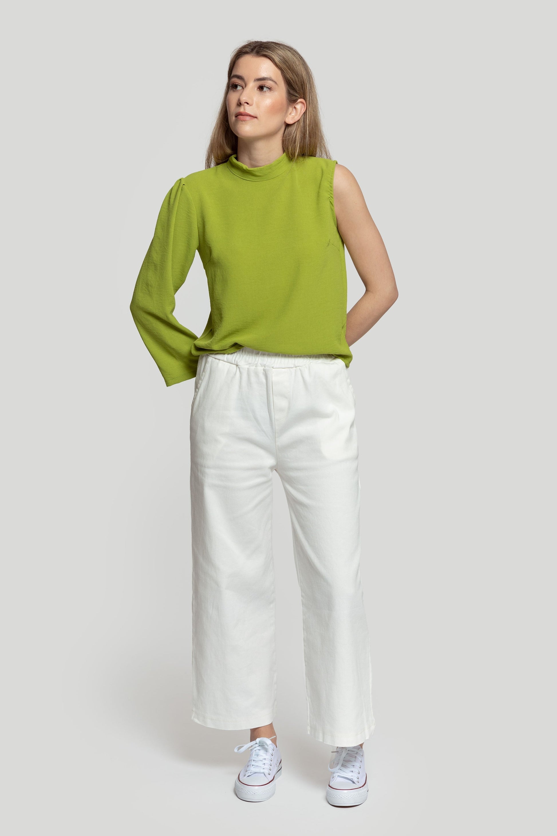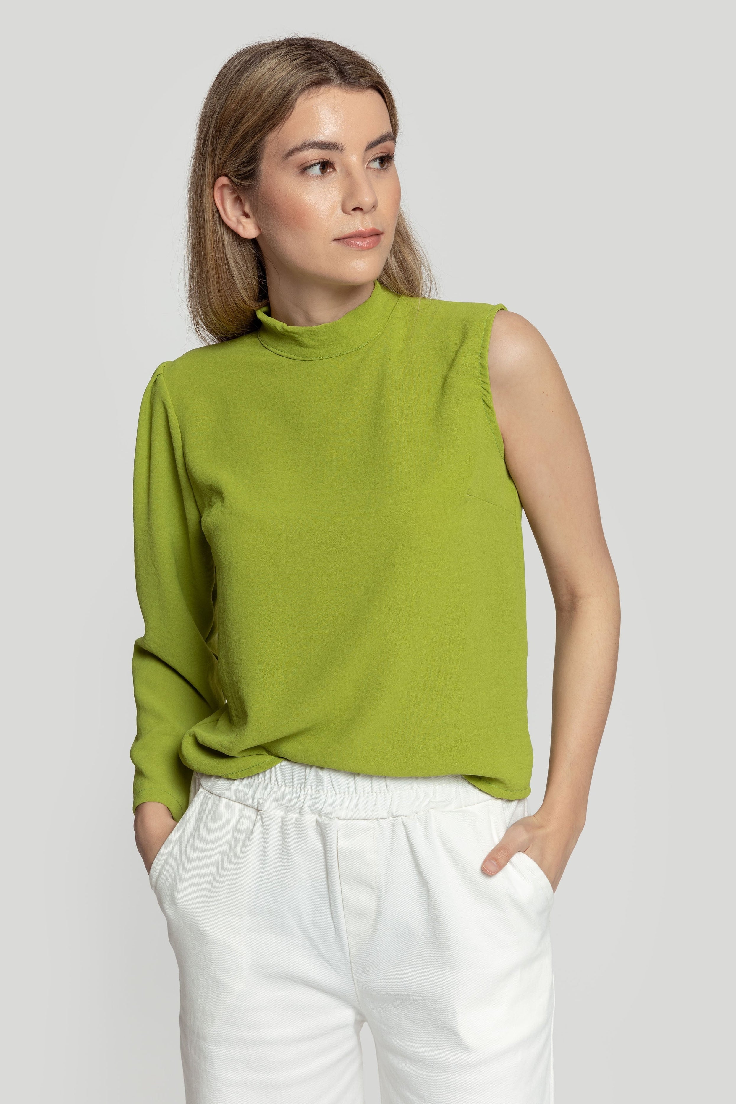 Blusa de gasa. Tejido fluido. Diseño off-shoulder. Diseño recto. Manga larga. Cierre de botón en la nuca. Talla modelo: S. Altura modelo: 1.70 m