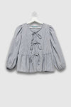 Tejido mezcla de algodón. Diseño estampado. Diseño oversize. Diseño fluido. Cuello redondo. Manga larga. Manga abullonada. Cierre lazos.