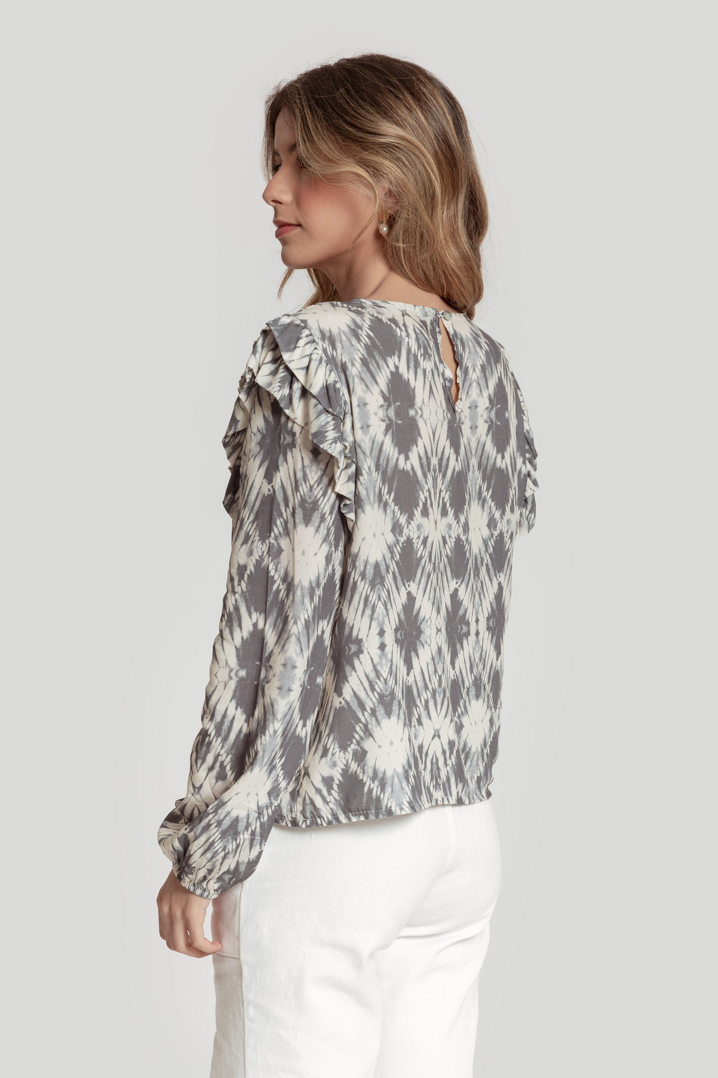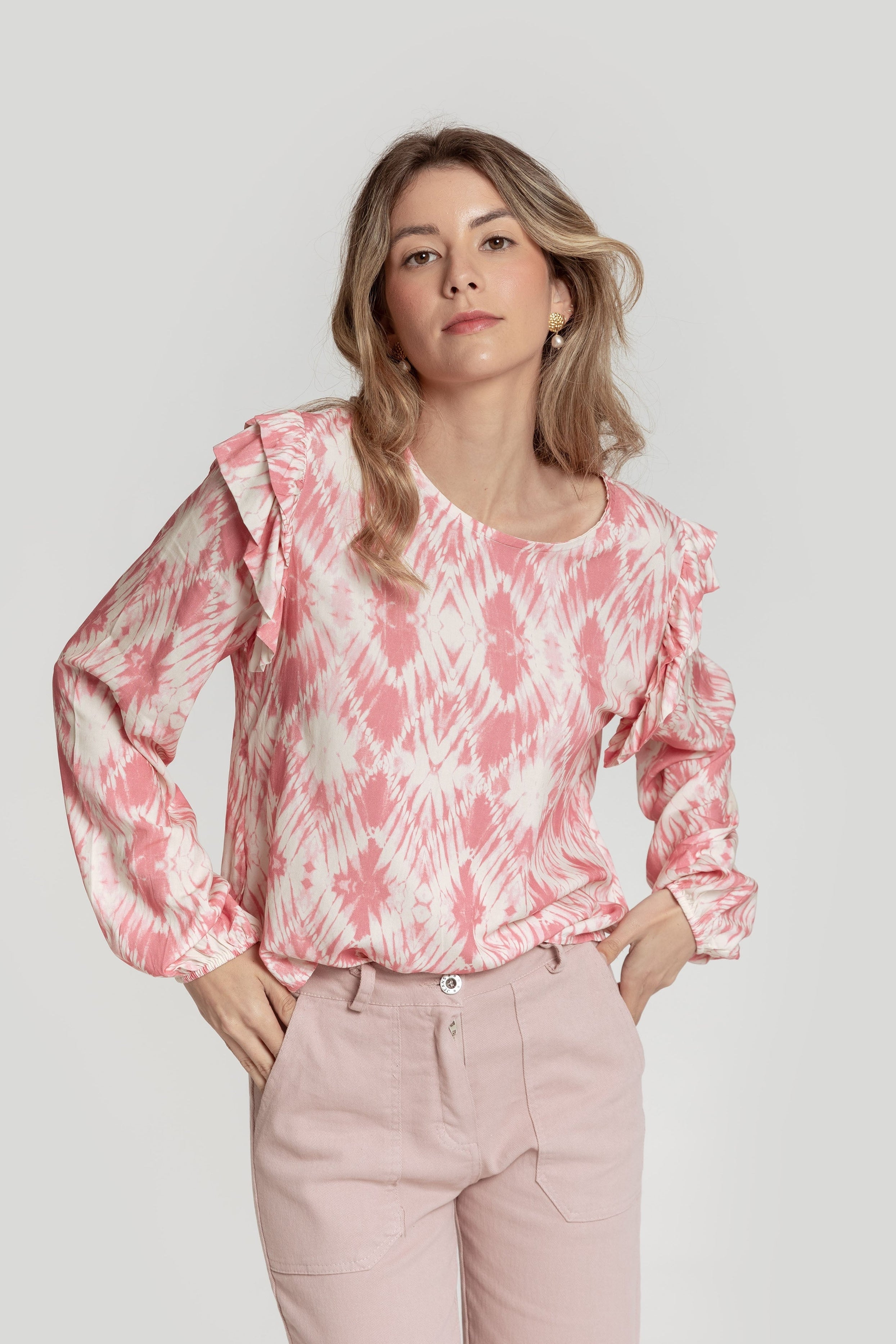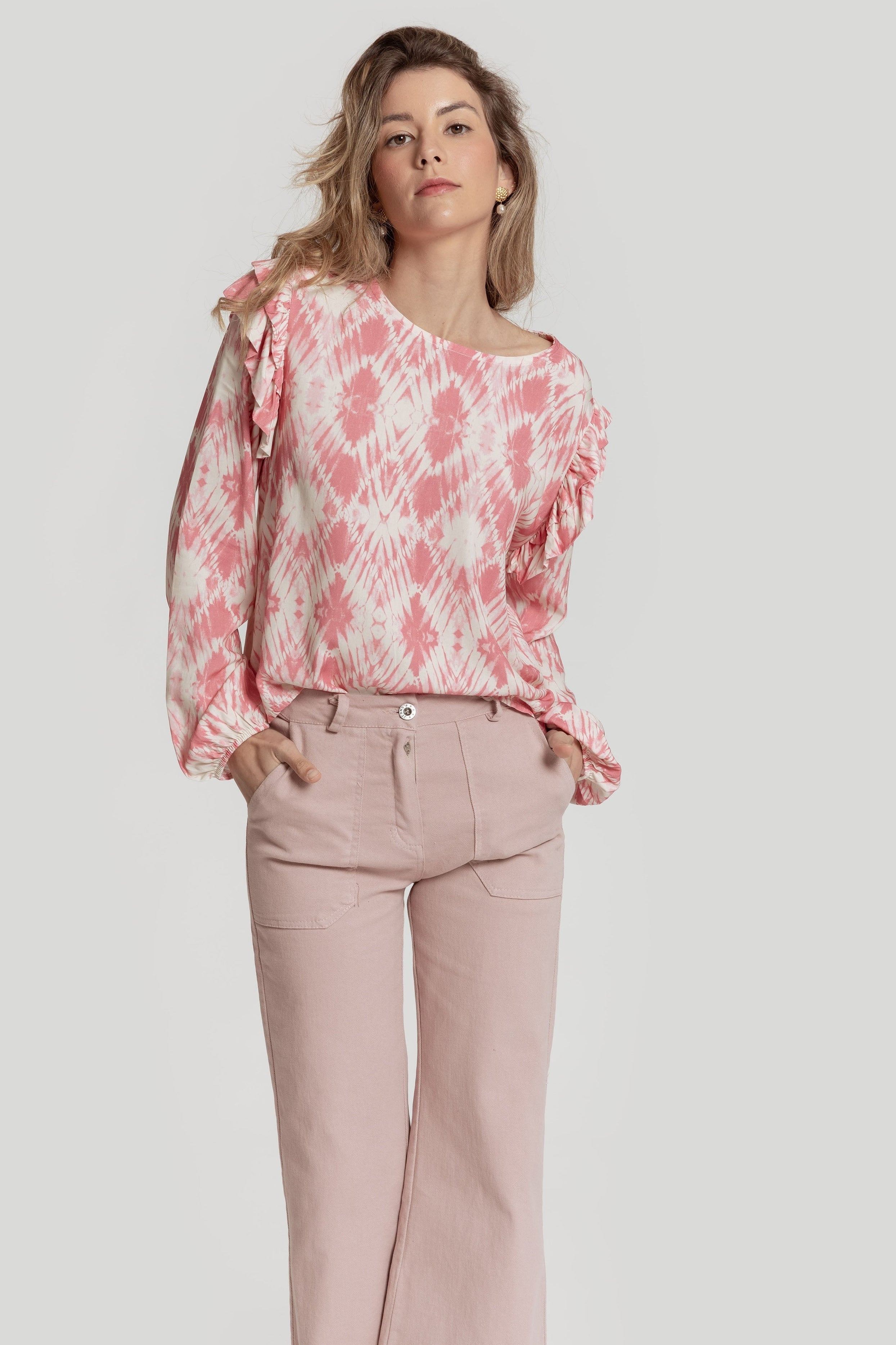 Tejido acabado suave. Diseño recto. Diseño estampado. Diseño oversize. Cuello redondo. Manga larga. Puño elástico. Abotonado en la nuca. Talla modelo: S. Altura modelo 1,70 m.