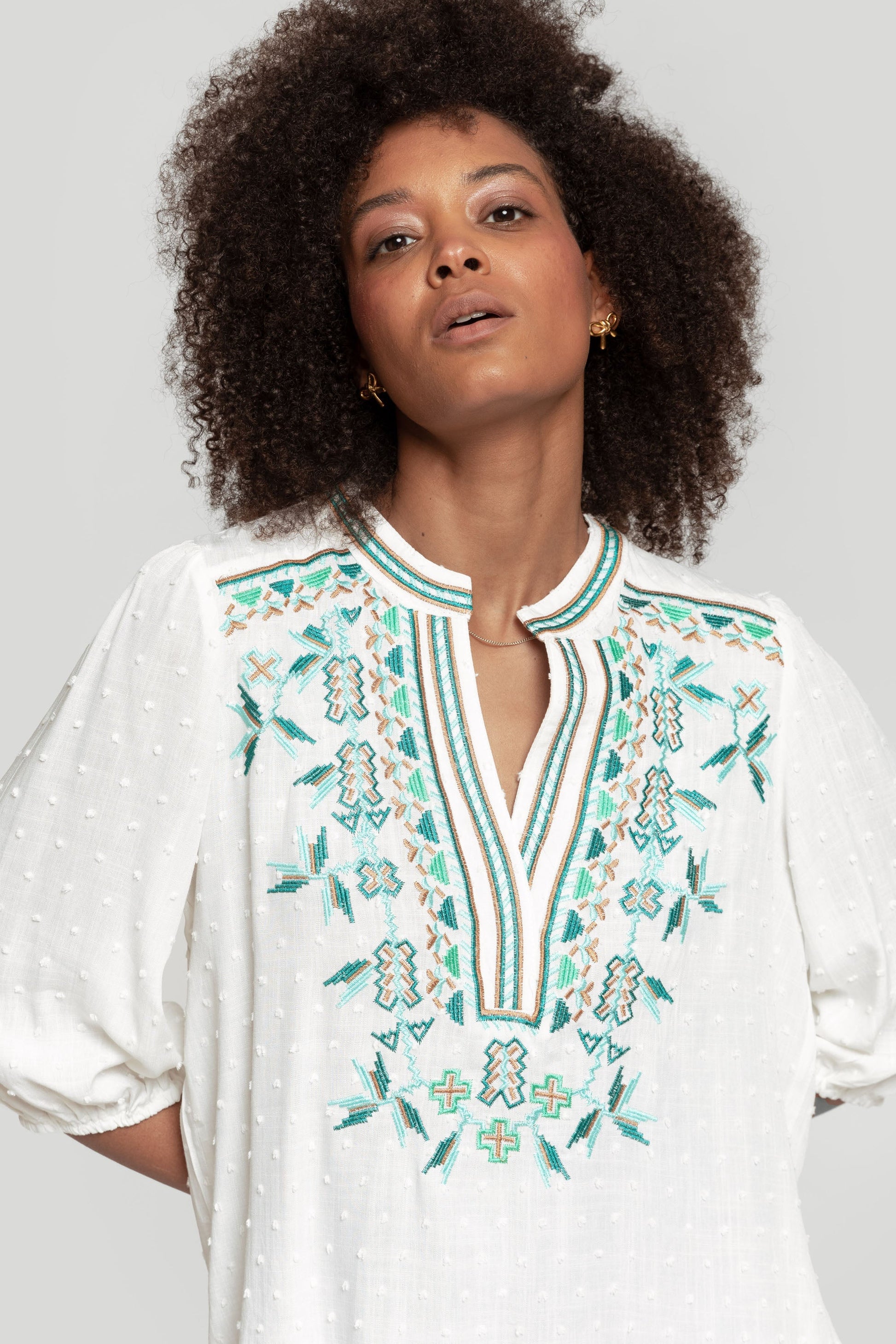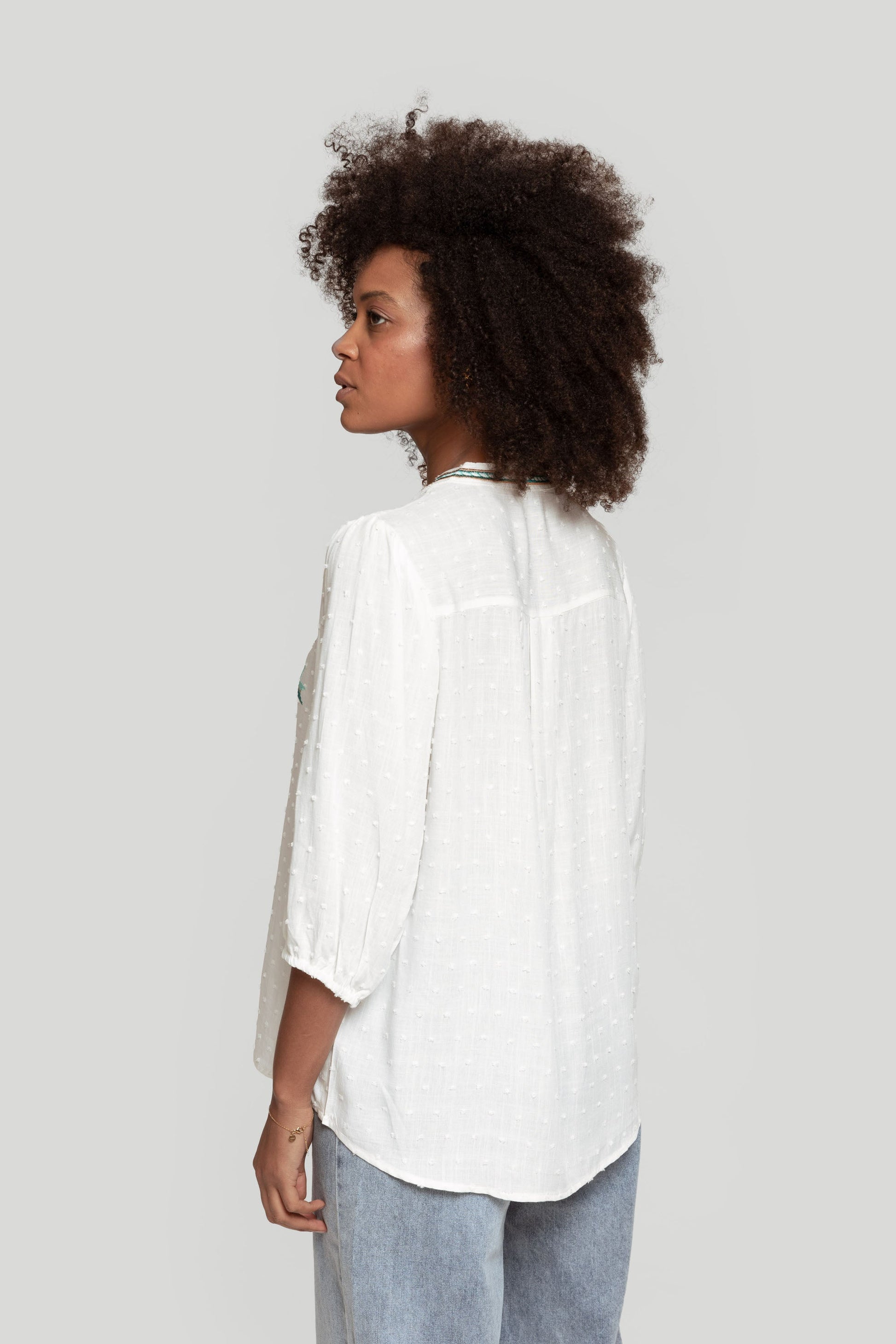 Tejido plumetis. Diseño recto. Cuello pico. Manga larga. Puño elástico. Detalles bordados. Talla modelo: M. Altura modelo: 1,66 m.