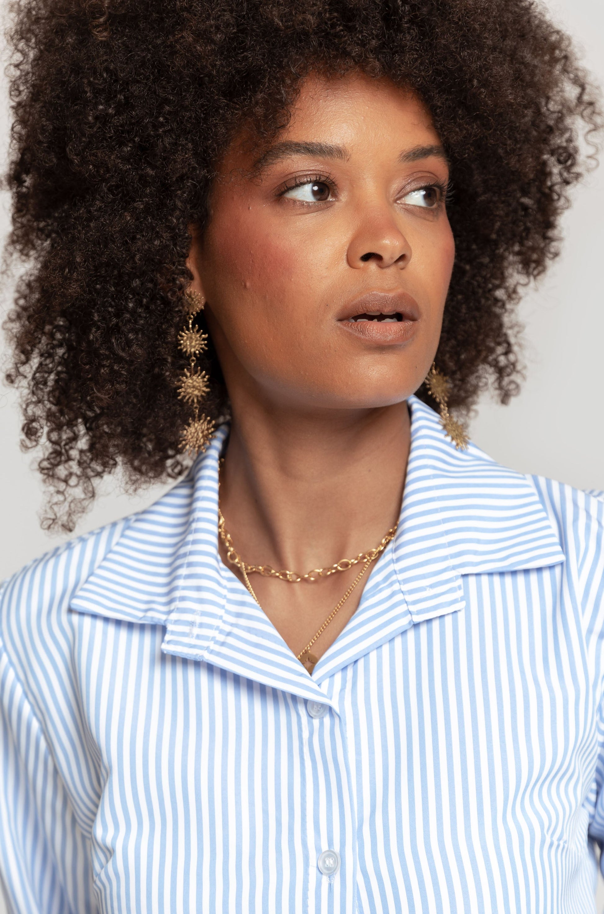 Diseño estampado rayas. Diseño recto. Cuello solapa. Manga larga. Puño abotonado. Cierre de botones. Talla modelo: S. Altura modelo: 1.65 m.