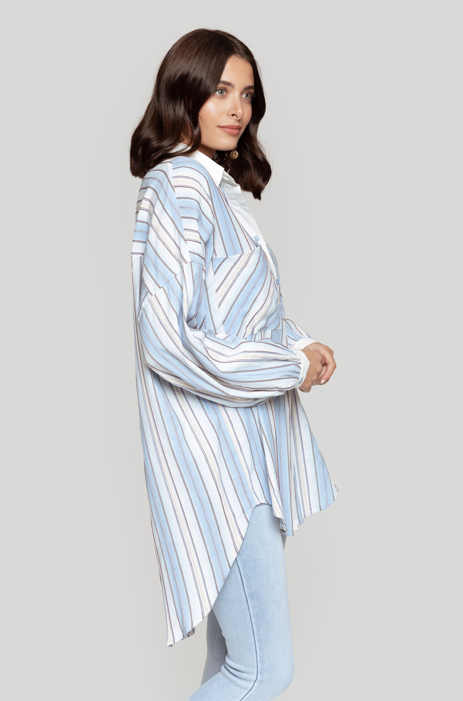 Tejido de algodón. Diseño estampado. Diseño oversize. Diseño largo. Diseño recto. Cuello solapa. Manga larga. Puño abotonado. Dos bolsillos de solapa en la parte delantera. Cierre de botones. Bajo redondeado. Talla modelo: Única. Altura modelo: 1.75 m.
