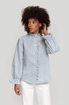 Tejido mezcla de algodón. Diseño estampado vichi. Diseño fluido. Cuello amplio. Manga larga. Puño acampanado. Cierre de botones. Talla modelo: S. Altura modelo 1,66 m.