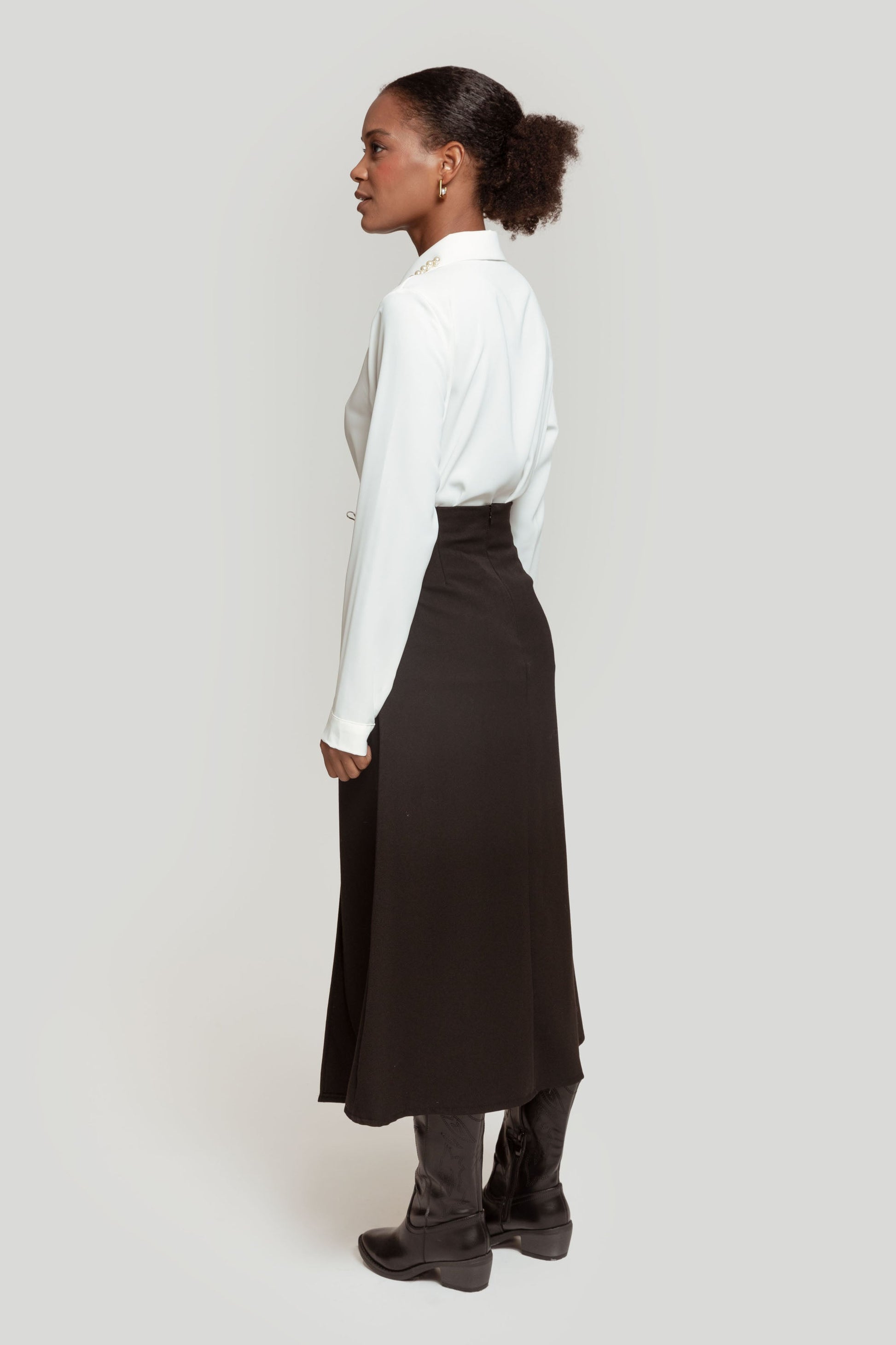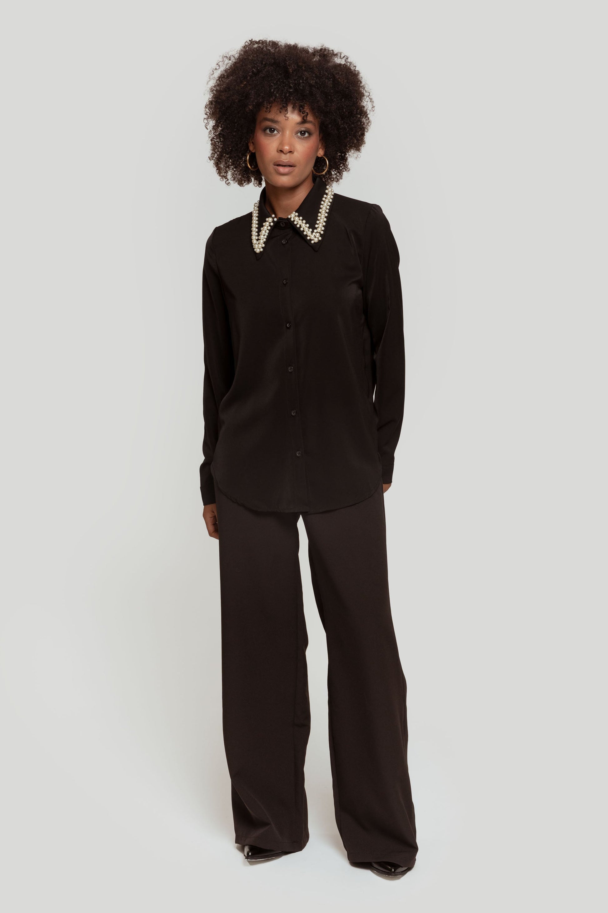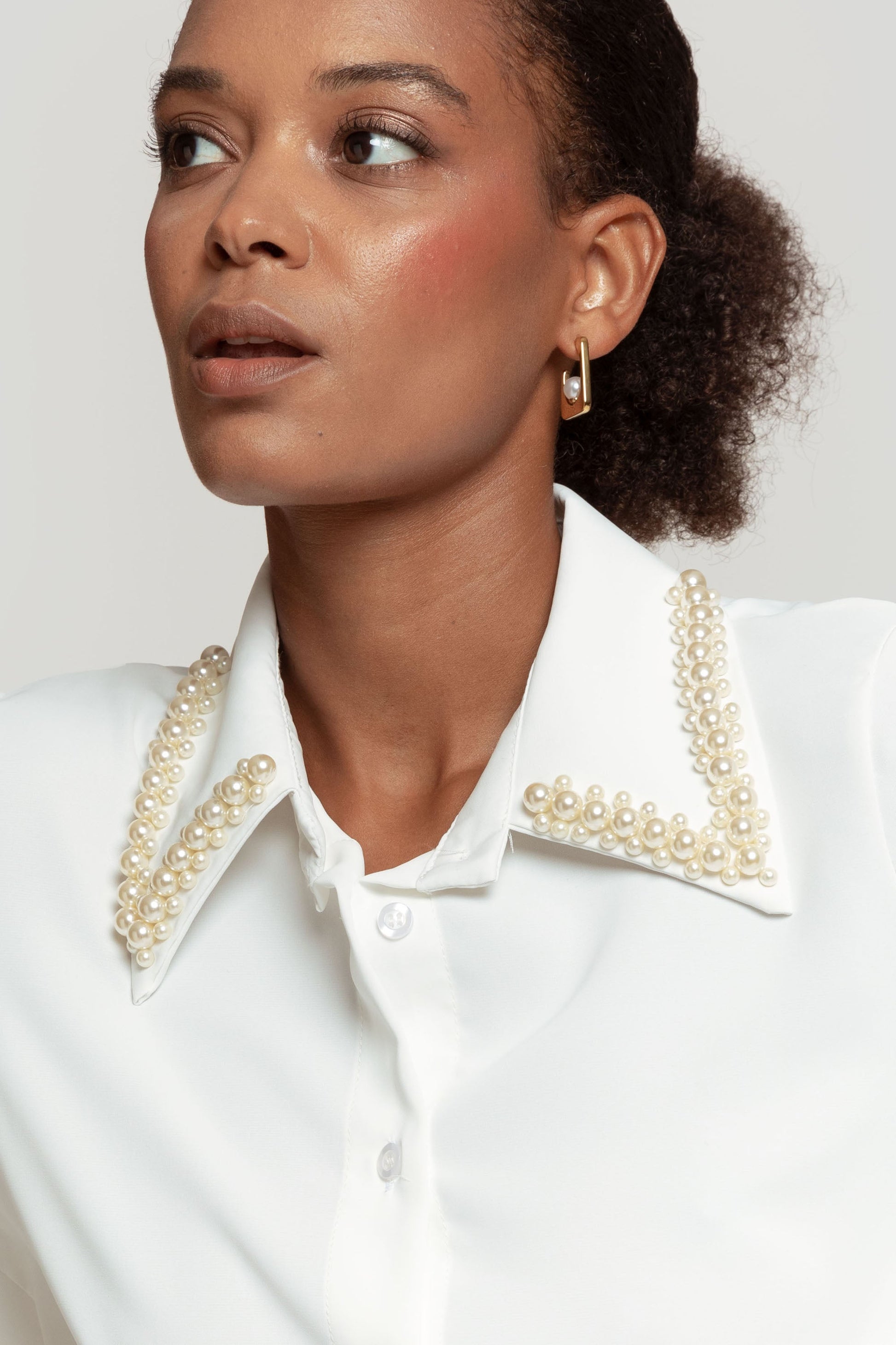 Tejido sedoso. Diseño recto. Diseño amplio. Cuello solapa. Manga larga. Puños abotonados. Cierre de botones. Bajo redondeado. Detalle perlas en solapa. Talla modelo: S. Altura modelo: 1.66 m.