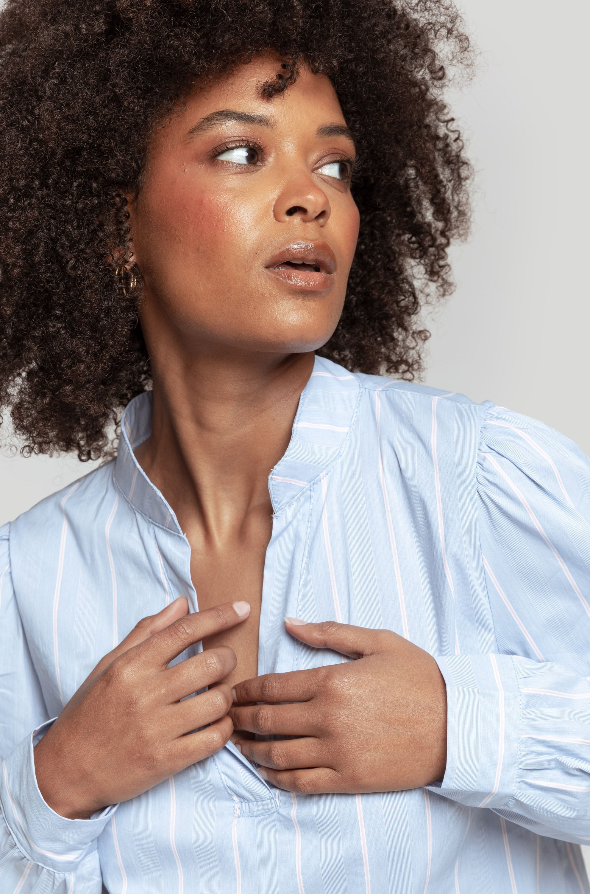 Tejido fluido. Diseño estampado rayas. Diseño recto. Cuello pico. Manga larga. Puño abotonado. Talla modelo: S. Altura modelo: 1.65 m.