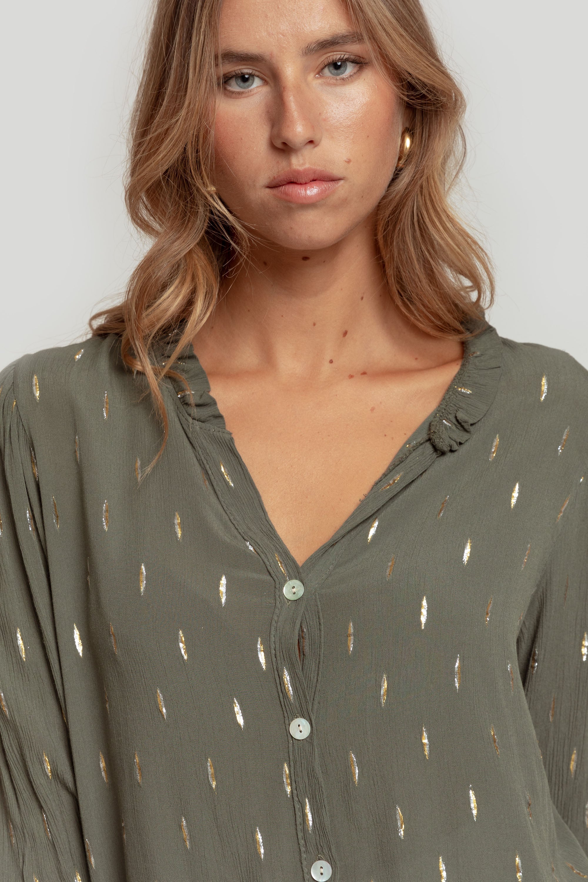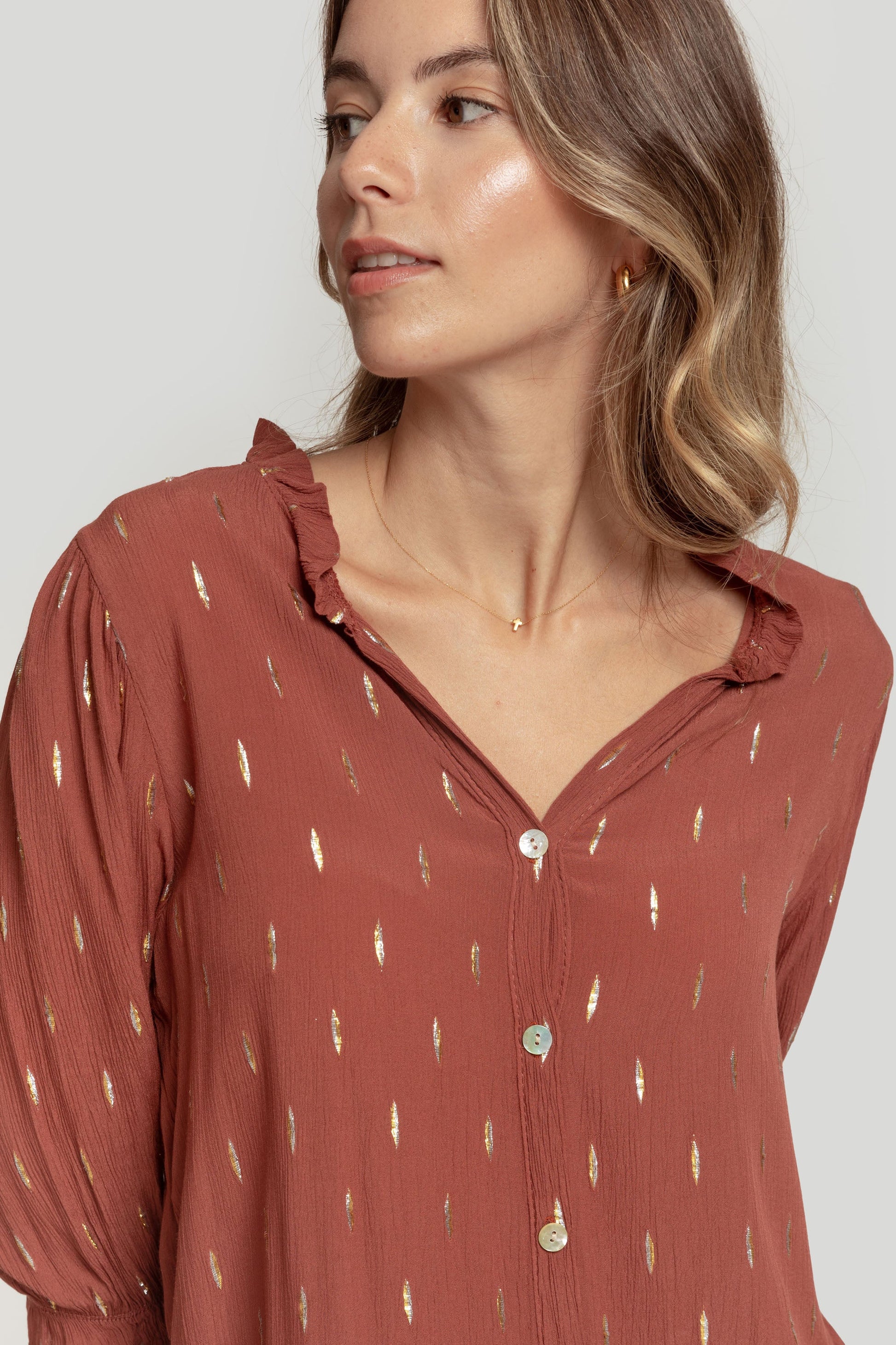 Tejido fluido. Tejido textura. Diseño estampado con brillos. Diseño recto. Diseño amplio. Cuello redondo. Manga larga. Puño elástico. Cierre de botones.