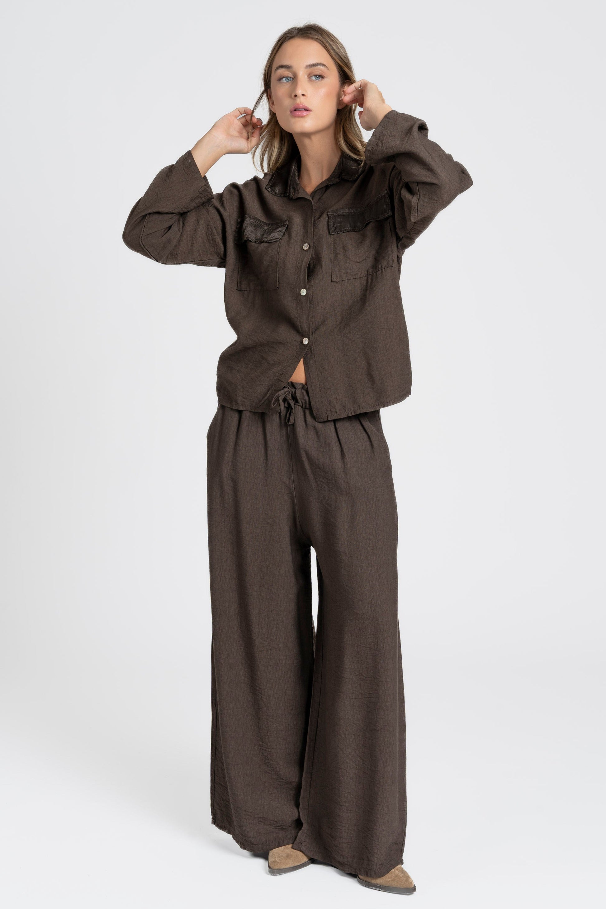 Conjunto camisa y pantalón. Tejido fluido. Cuello solapa. Manga larga. Bolsillos con solapa. Cierre de botones. Pantalón de tiro medio. Cintura elástica. Bolsillos laterales. Pernera ancha.