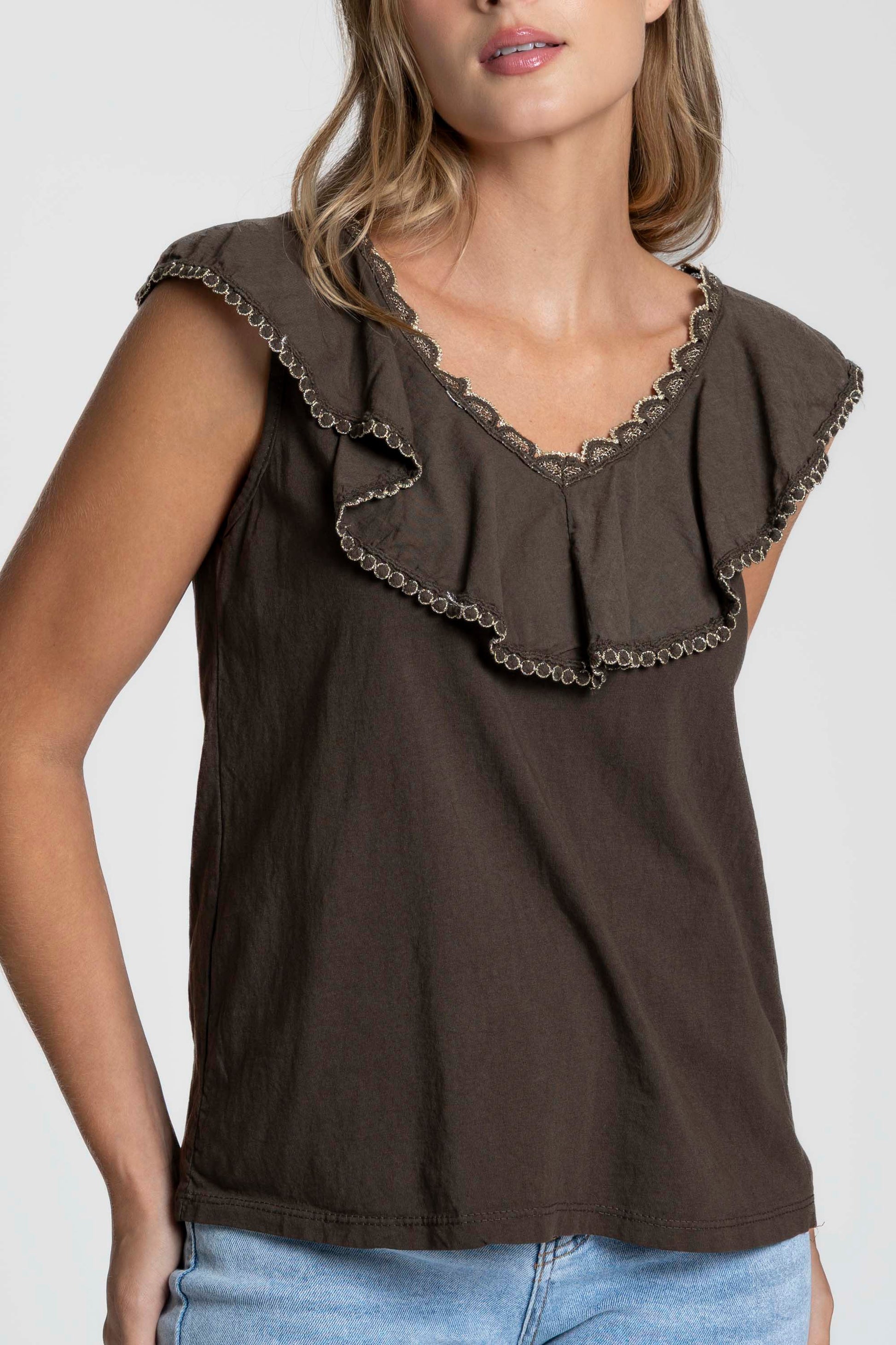 Tejido de algodón. Manga sisa. Escote pico. Detalle volantes bordados.