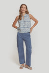 Tejido mezcla lino. Diseño estampado. Diseño amplio. Cuello halter. Abotonada en el cuello. Talla modelo: S. Altura modelo 1,70 m.