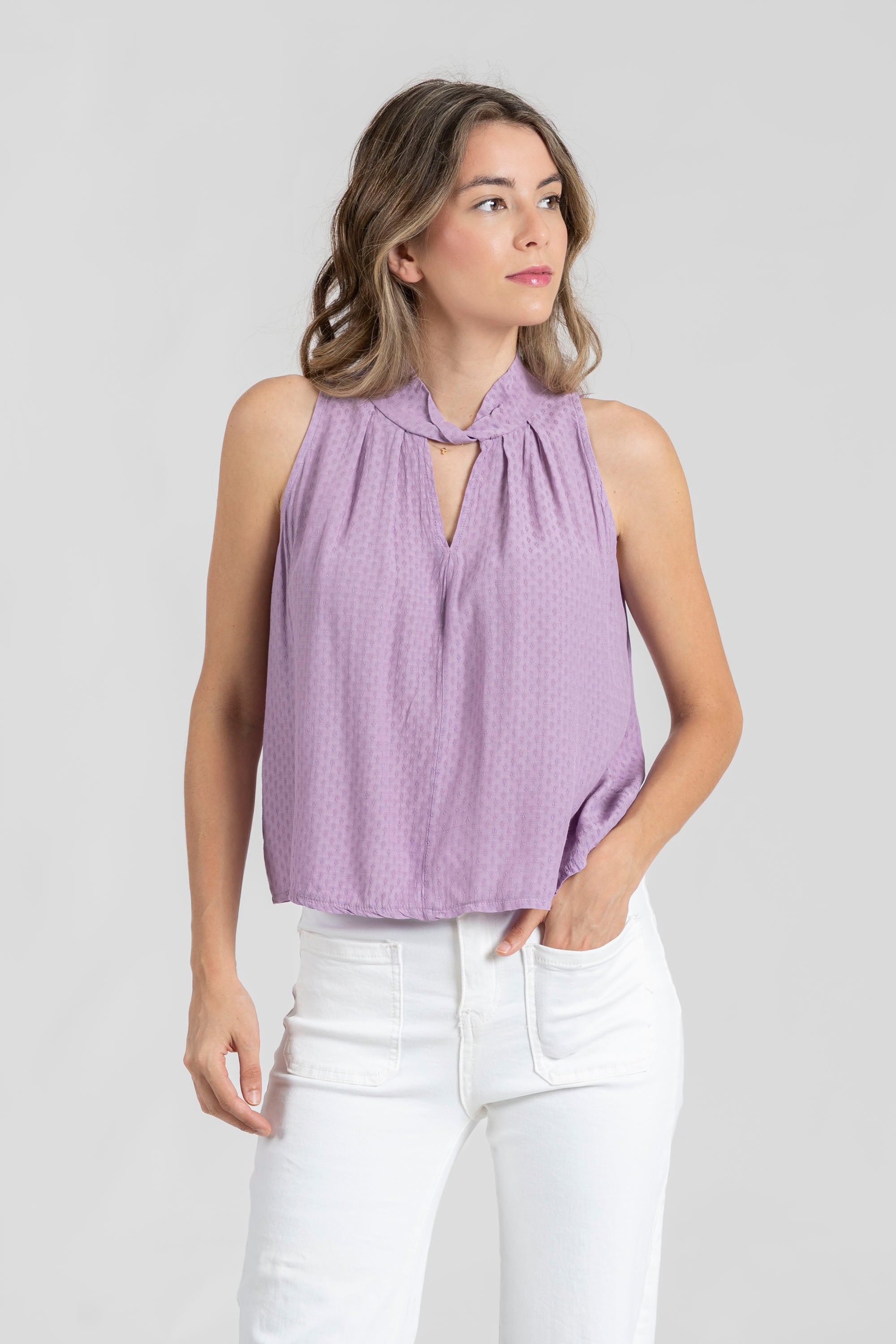 Tejido fluido. Tejido hilos. Escote halter. Manga sisa. Abotonado en la nuca. Talla S. Altura modelo: 1.70 m