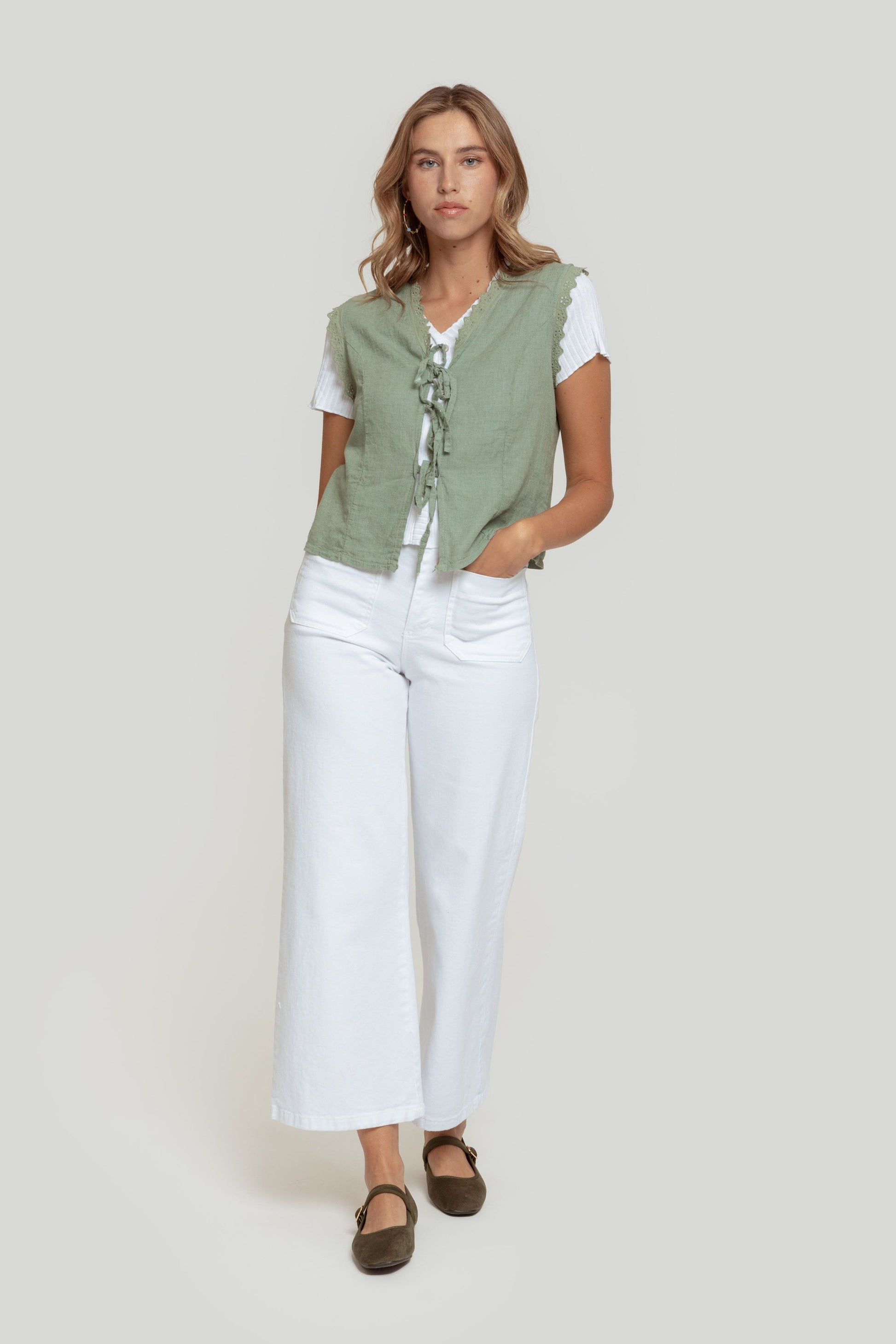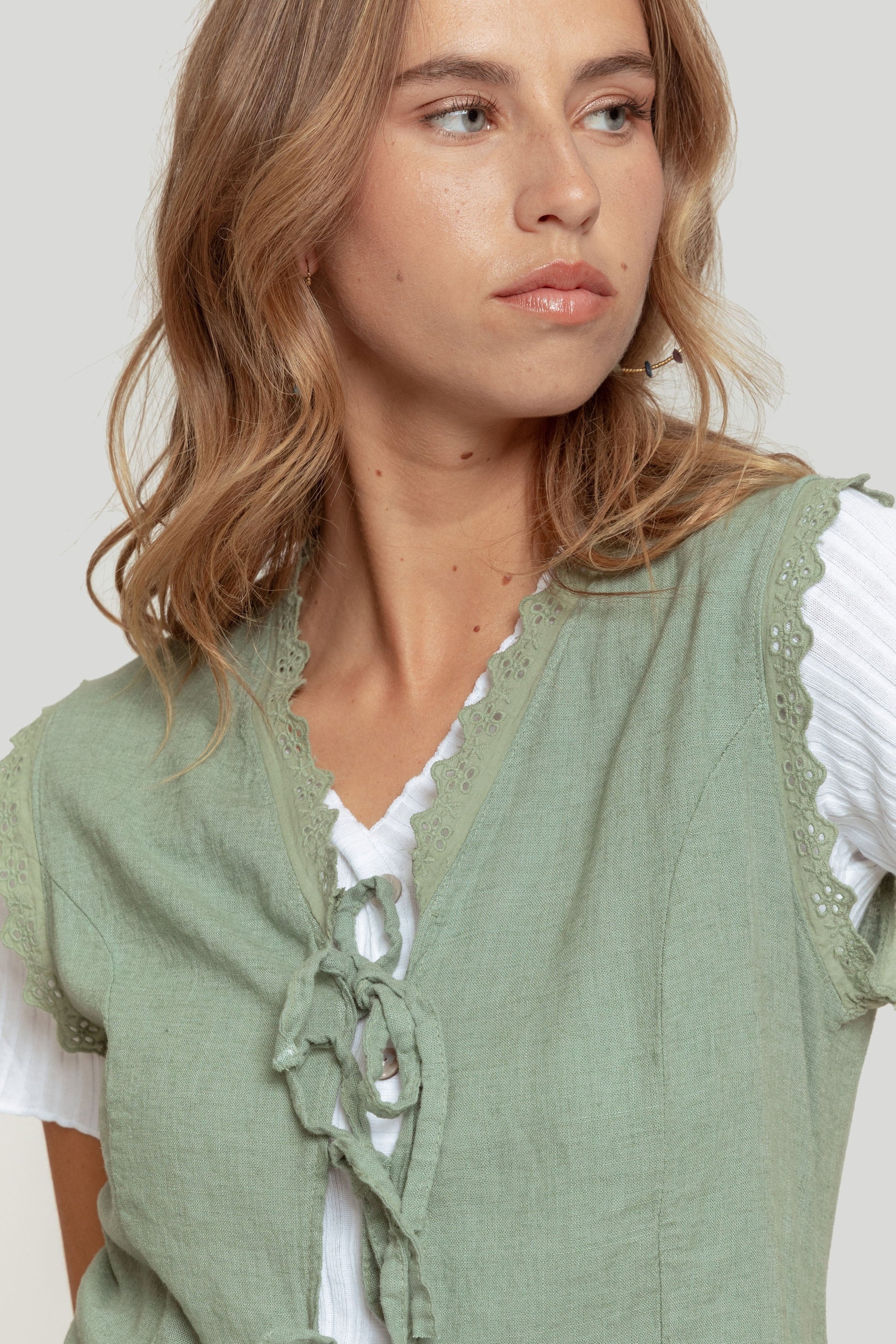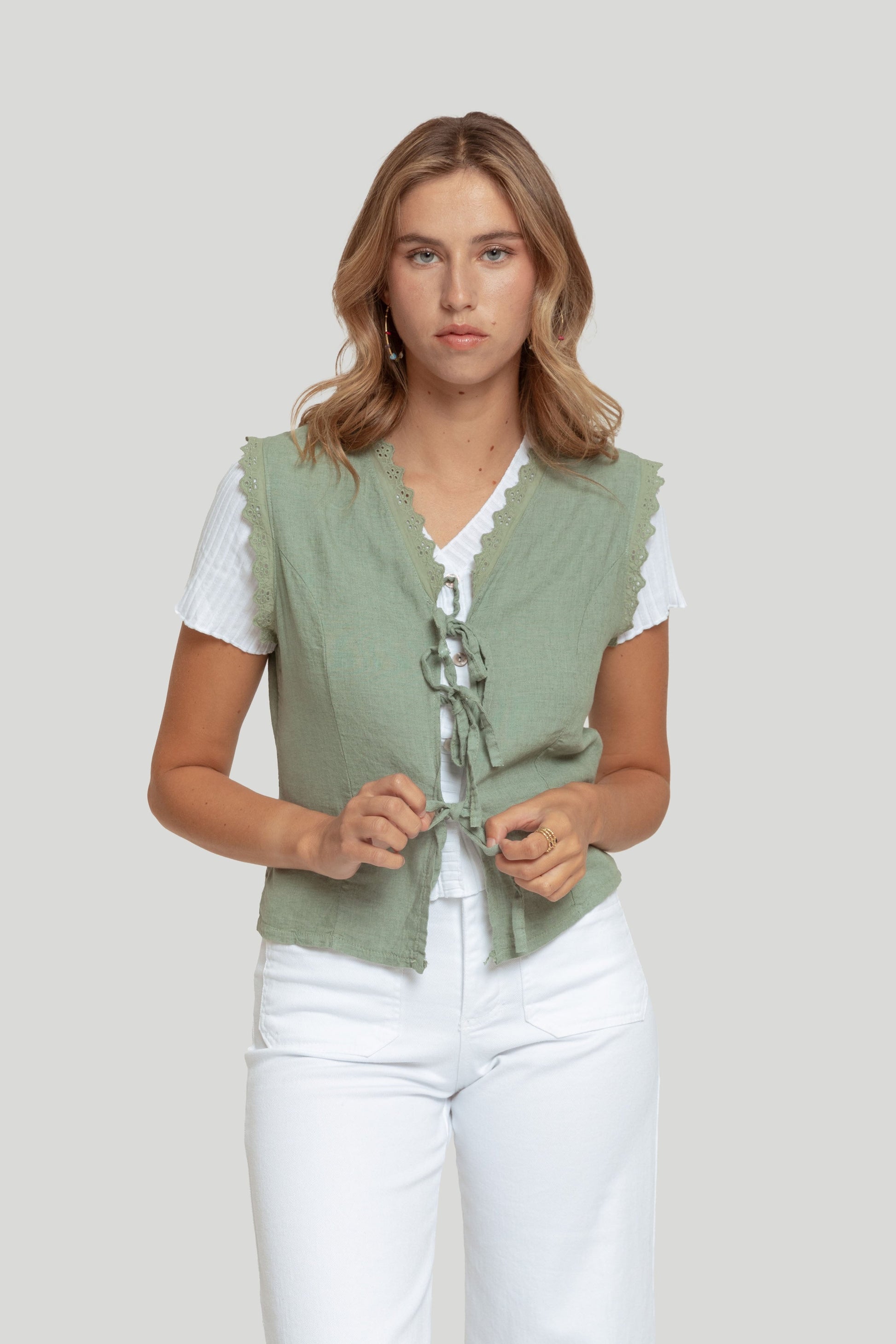 Tejido mezcla lino. Diseño recto. Cuello pico. Manga sisa. Cierre de lazos. Abierto. Talla modelo: S. Altura modelo: 1,70 m.