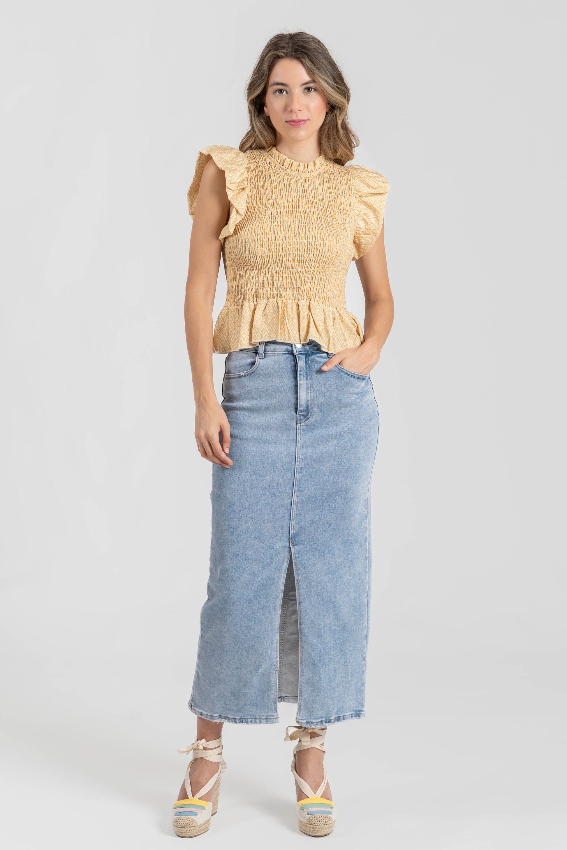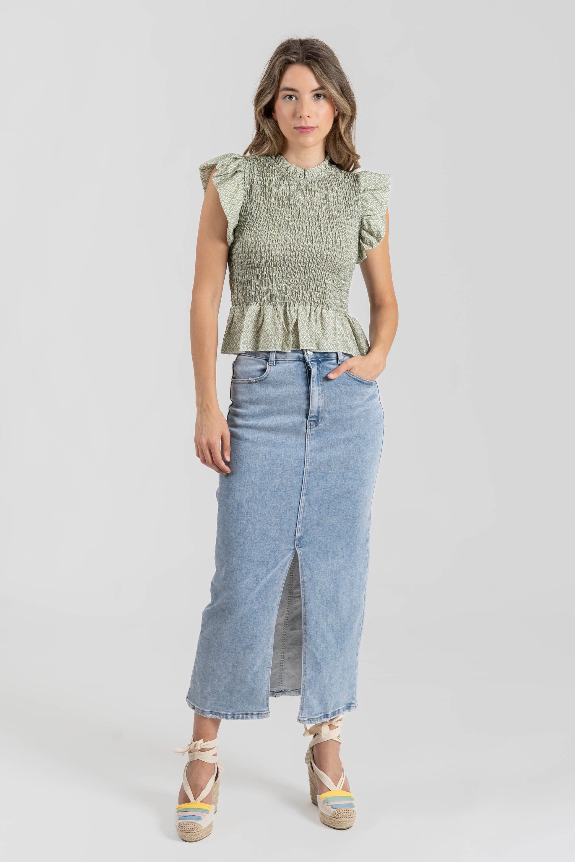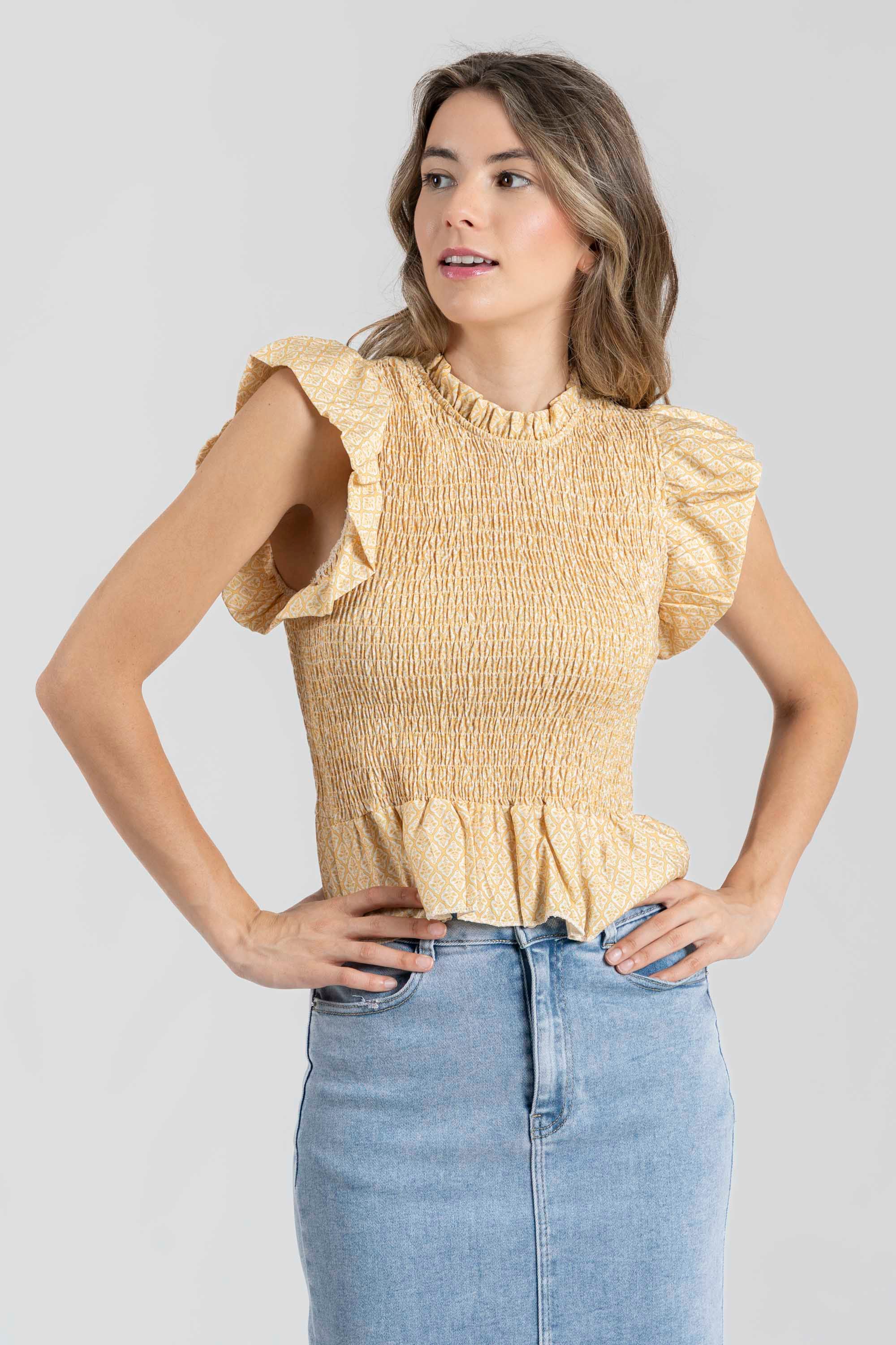 Diseño ajustado. Cuerpo nido. Cuello redondo. Manga sisa. Bajo volante.