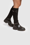 Bota plana engomada. Punta redonda. Caña alta . Suela track. Forro interior. Sin cierre. Detalle de tirador trasero.