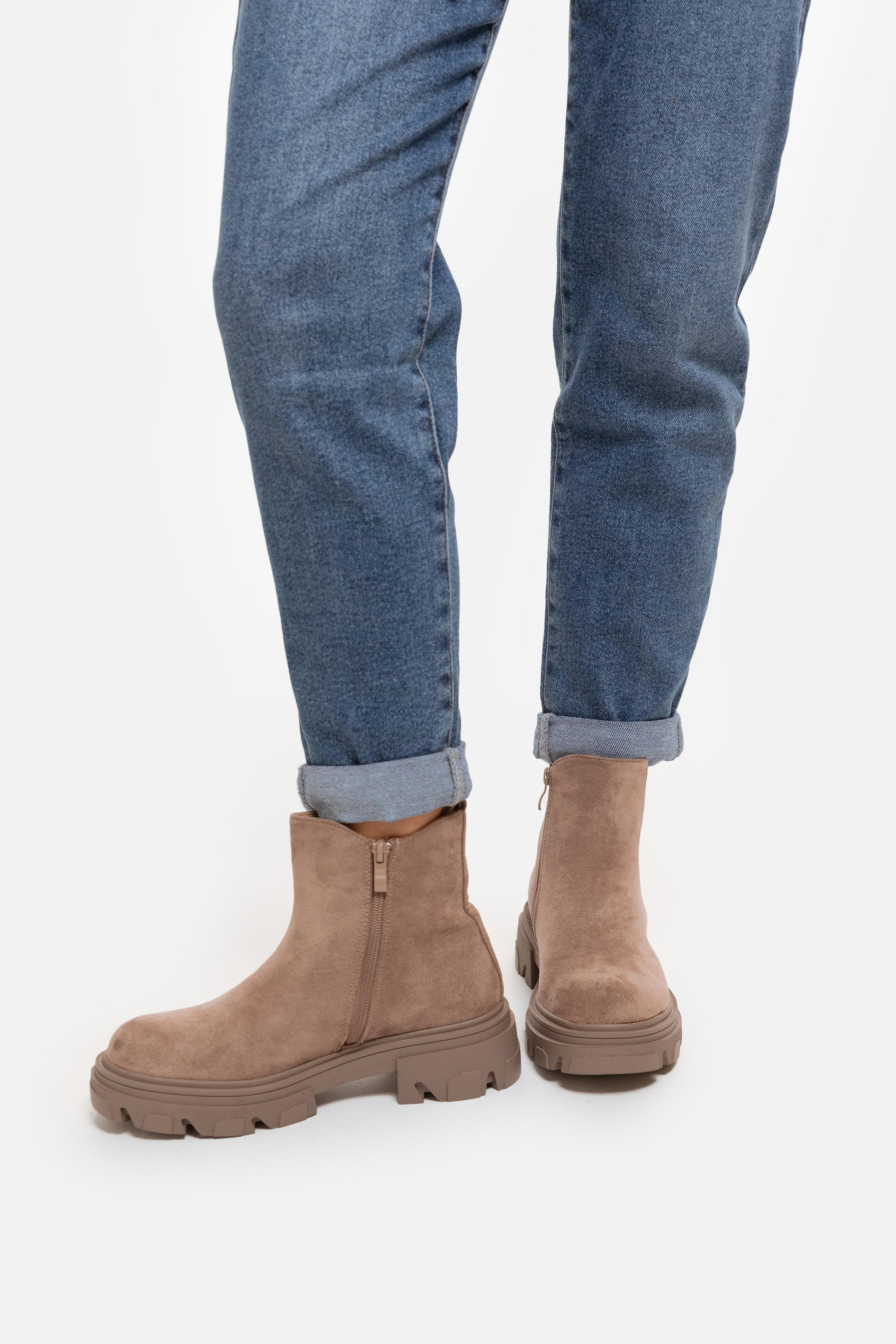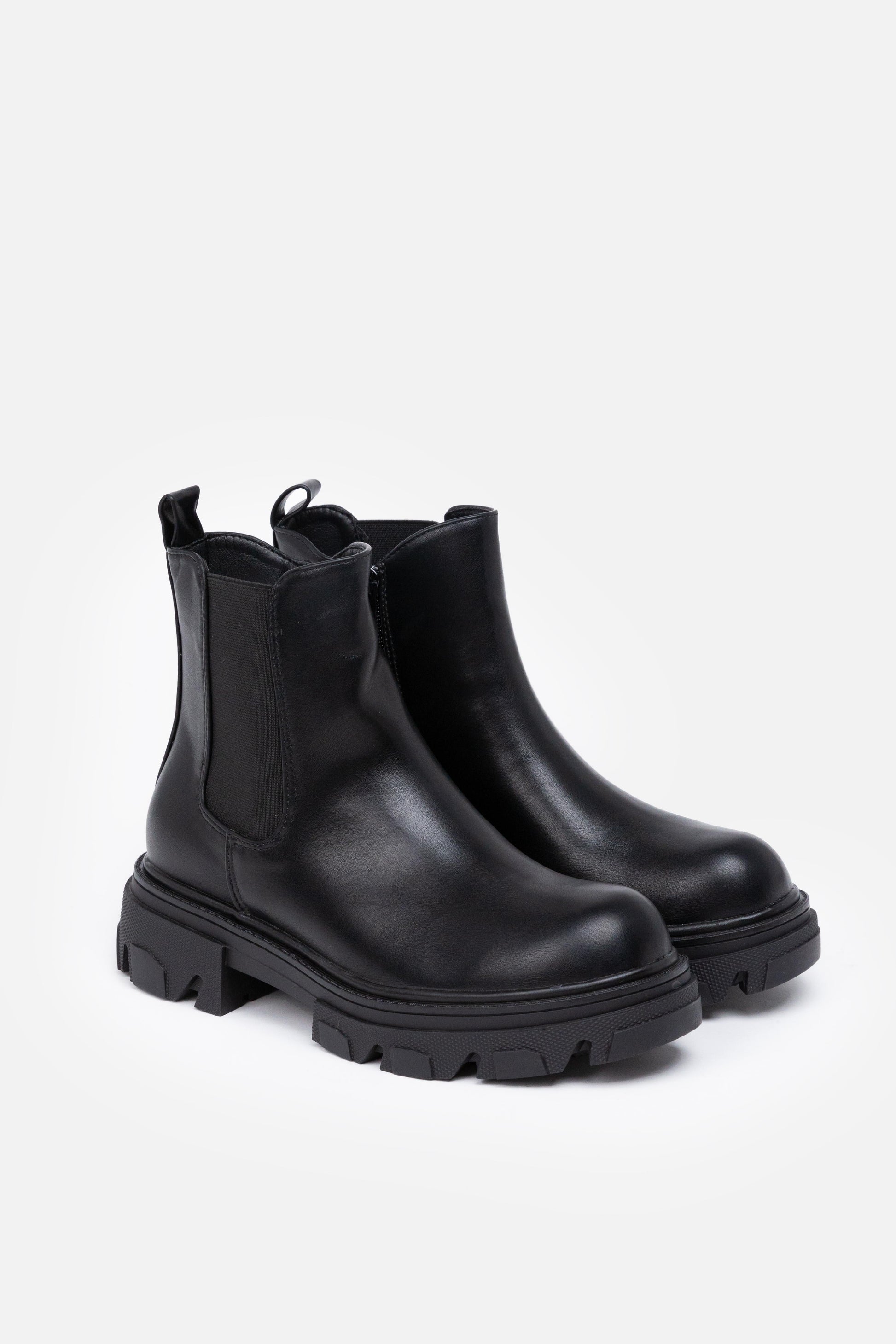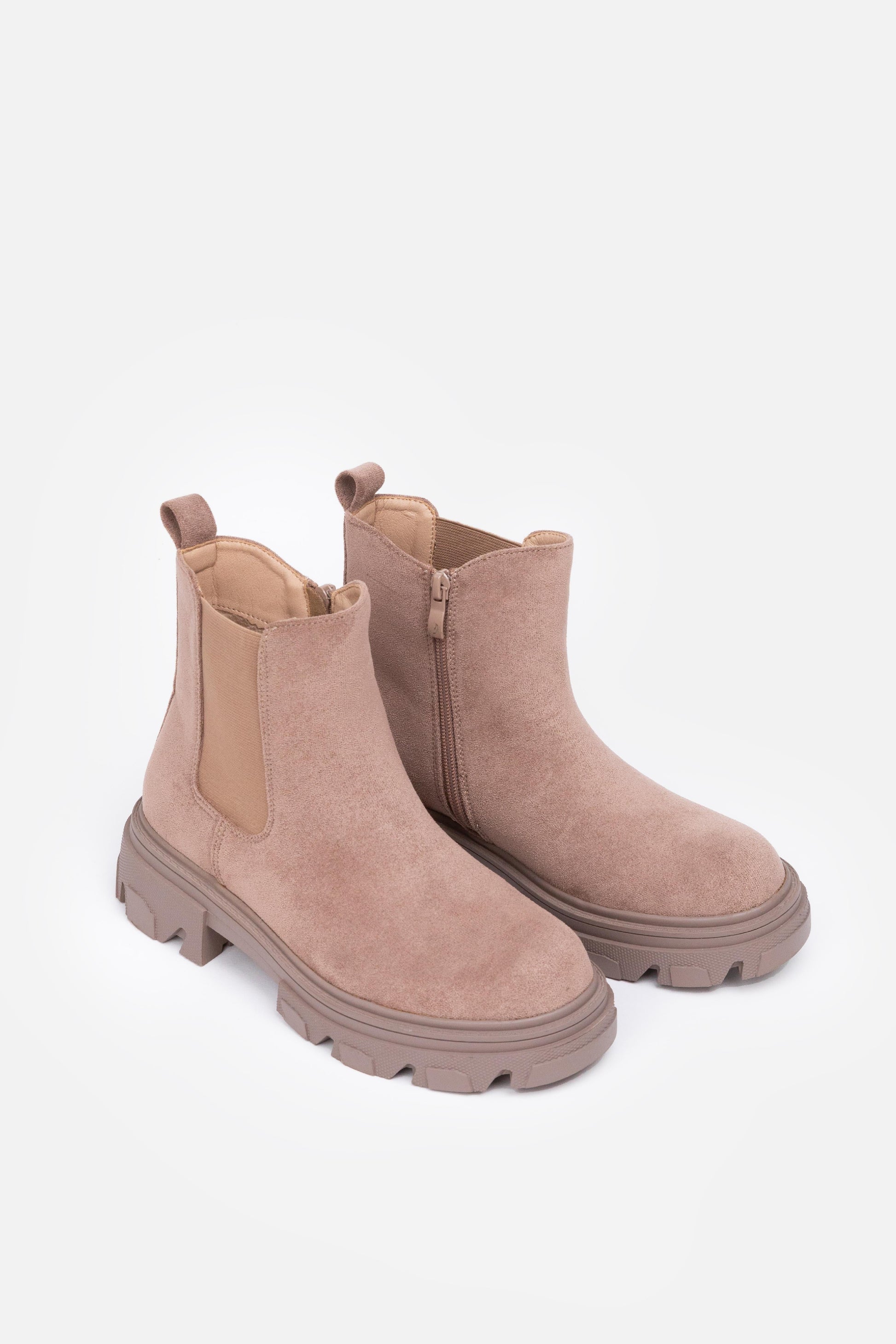 Botín de caña media. Paneles laterales elásticos. Punta redonda. Suela track. Altura tacón: 2.00 cm. Color negro piel sintética, verde y khaki en tejido antelina.